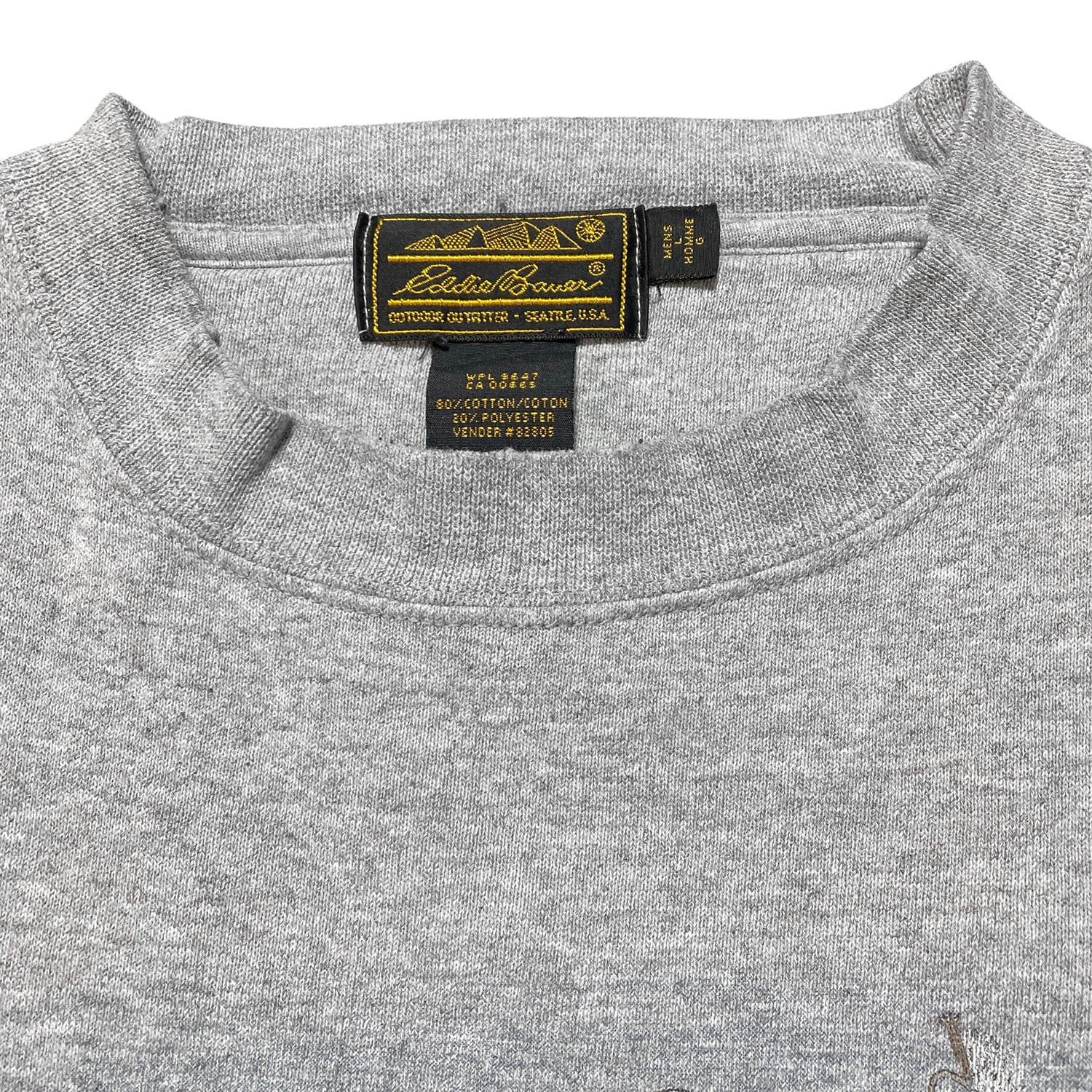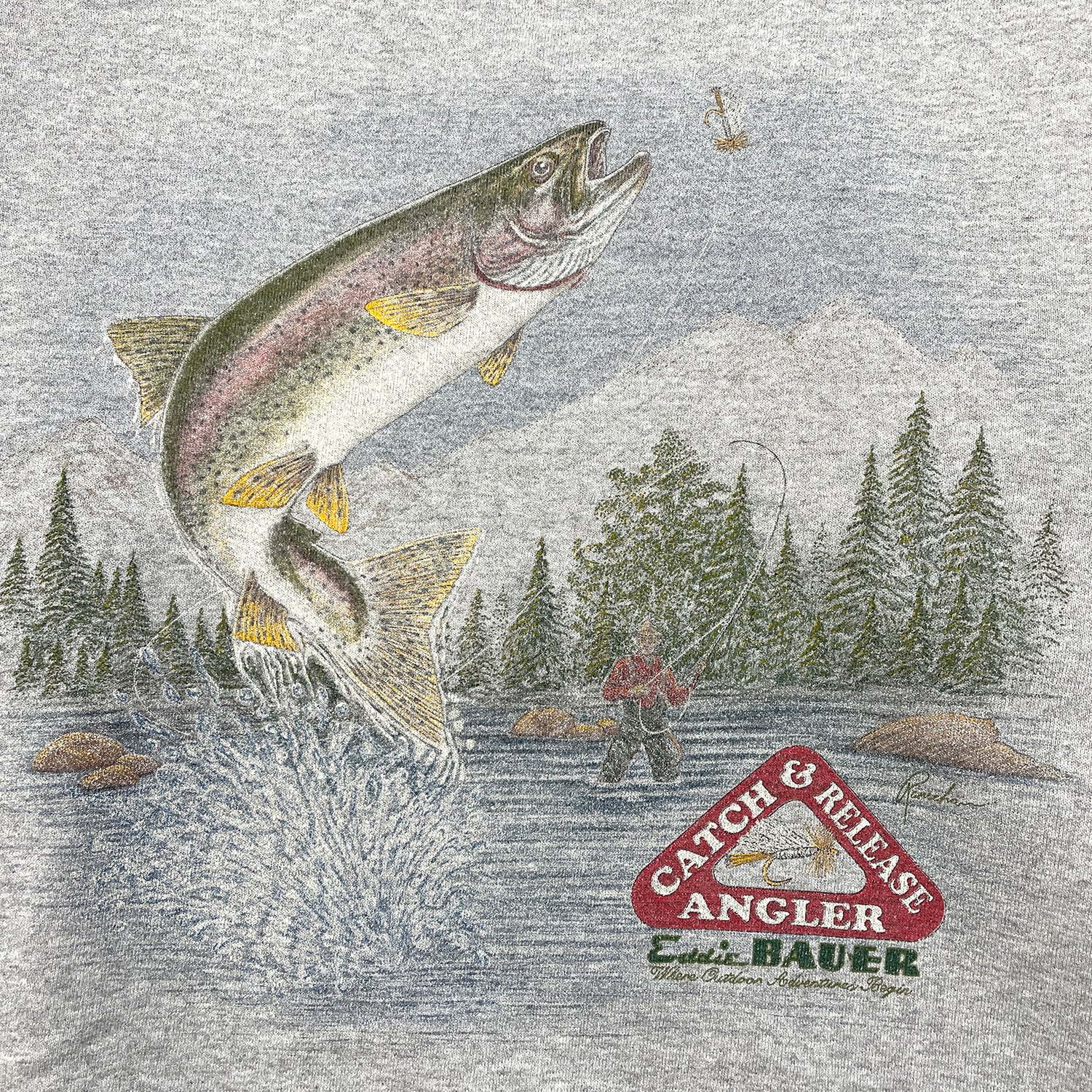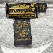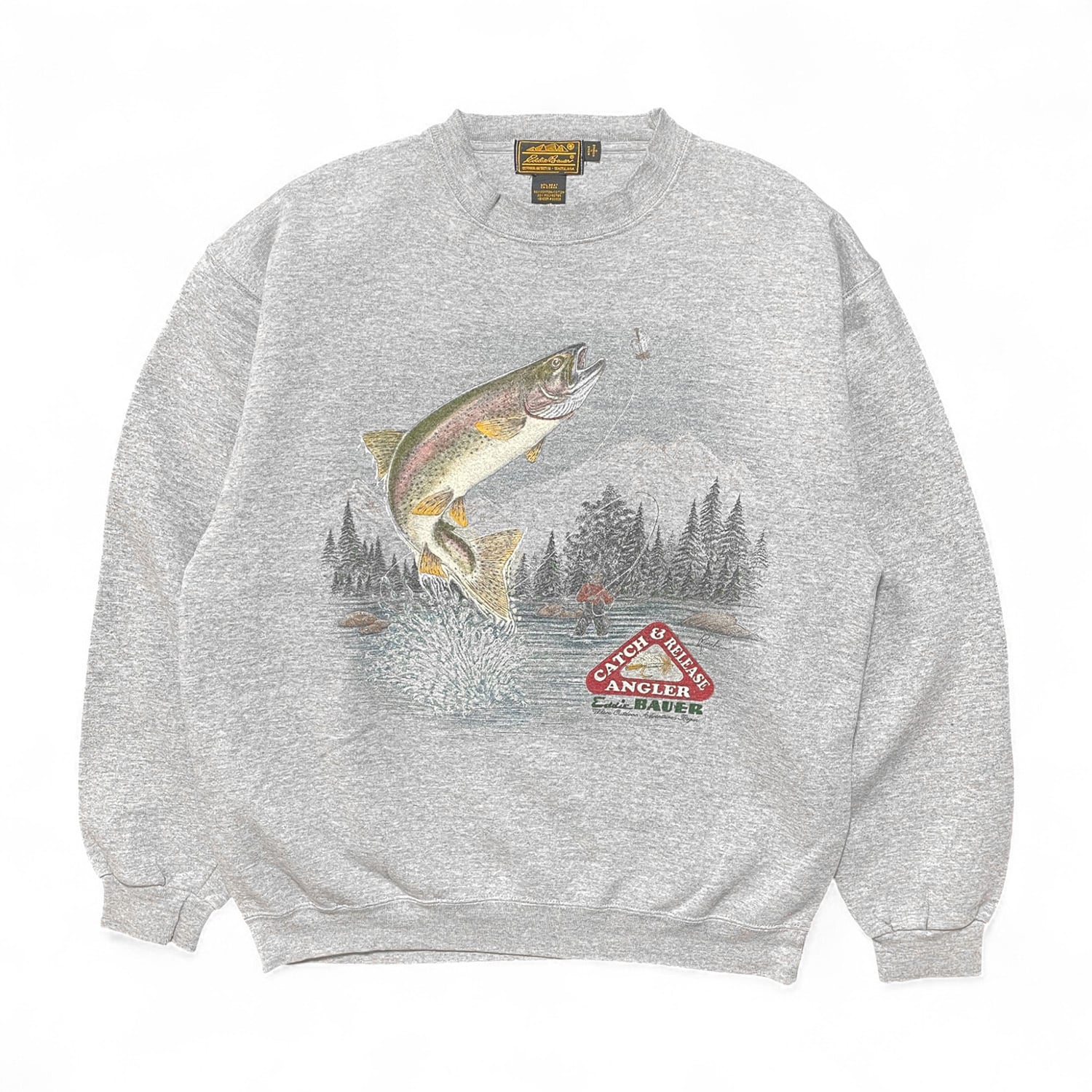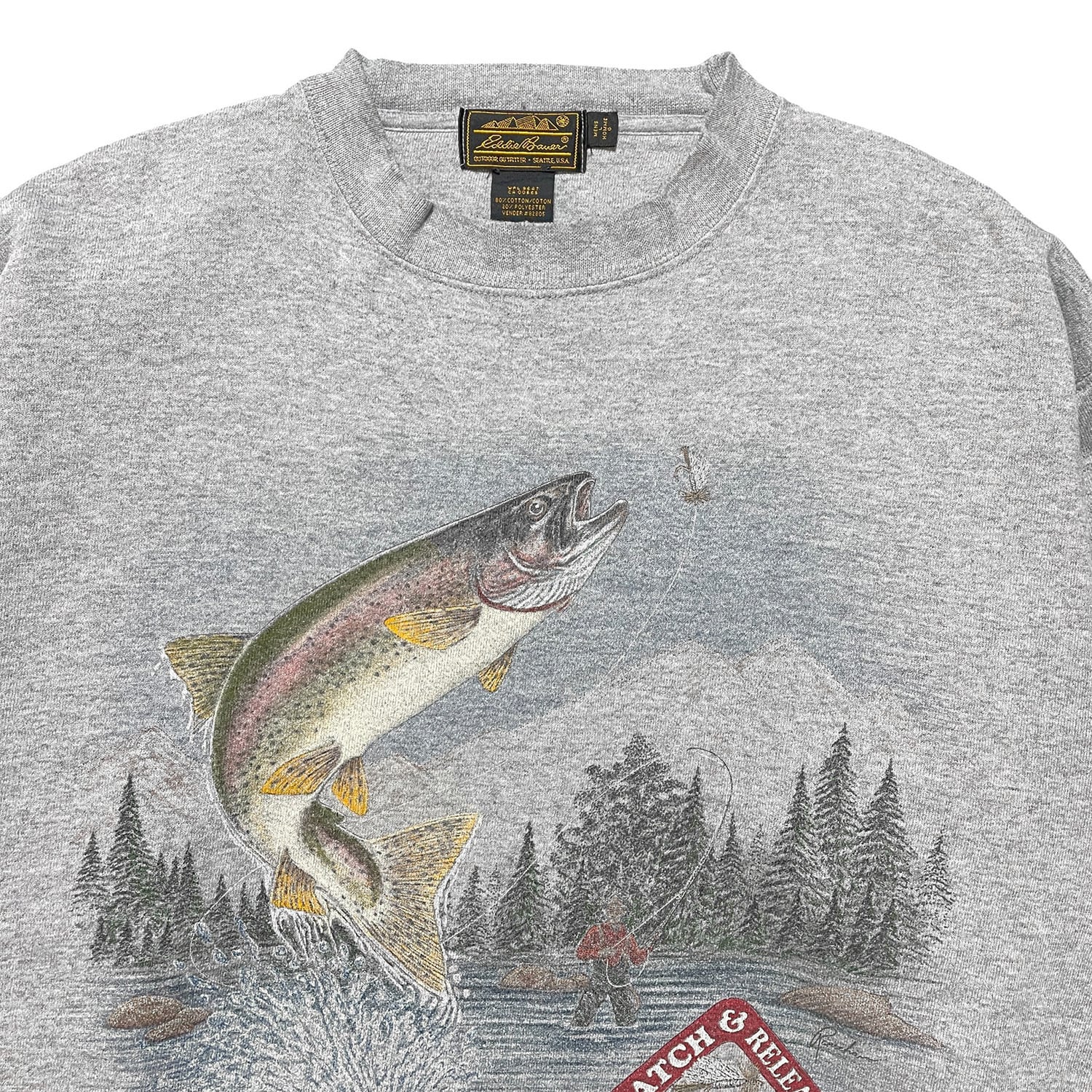 古着 USA製 90S Eddie Bauer エディーバウアー クルーネック ヴィンテージ スウェット トレーナー サーモン プリント グレー メンズL BD3021