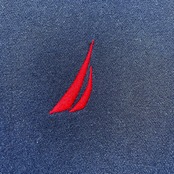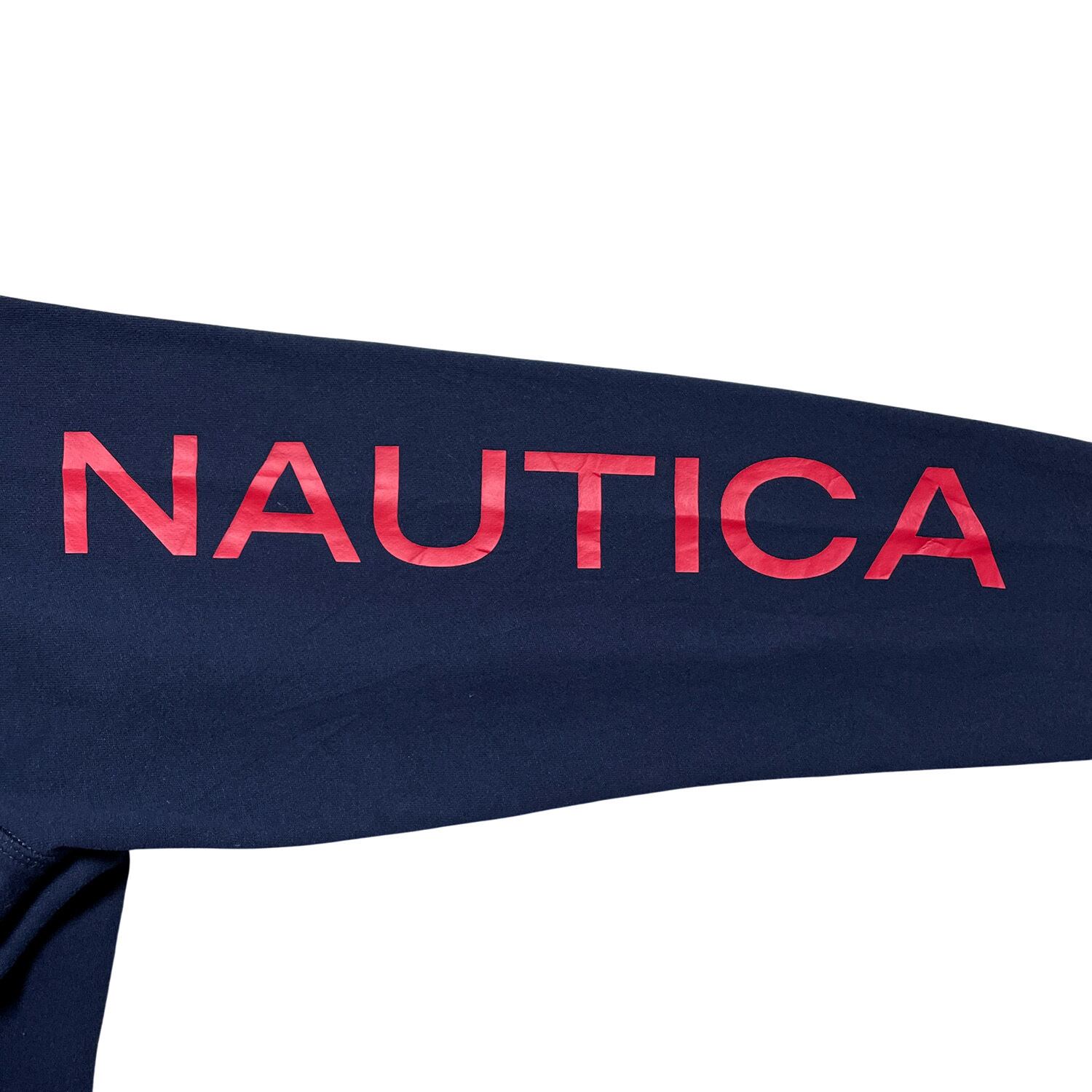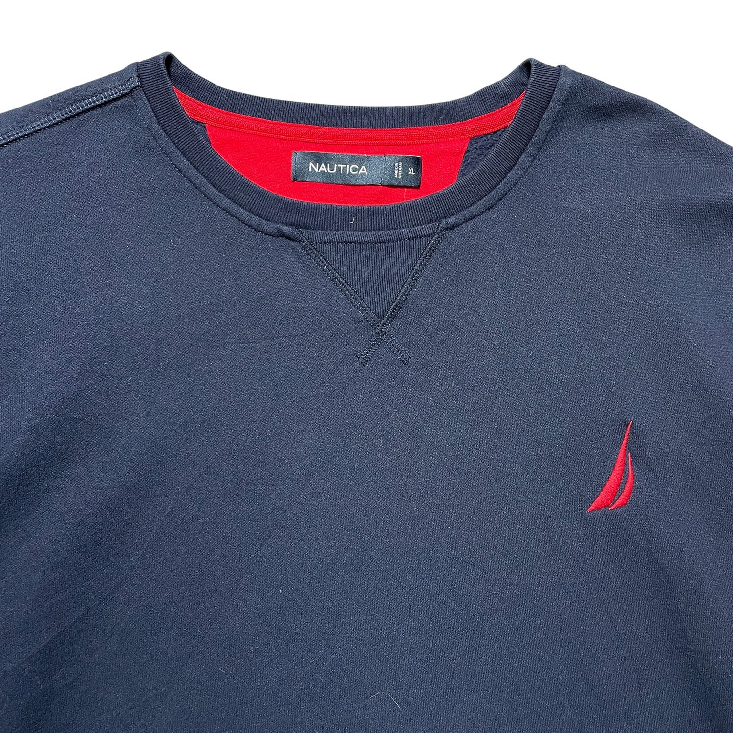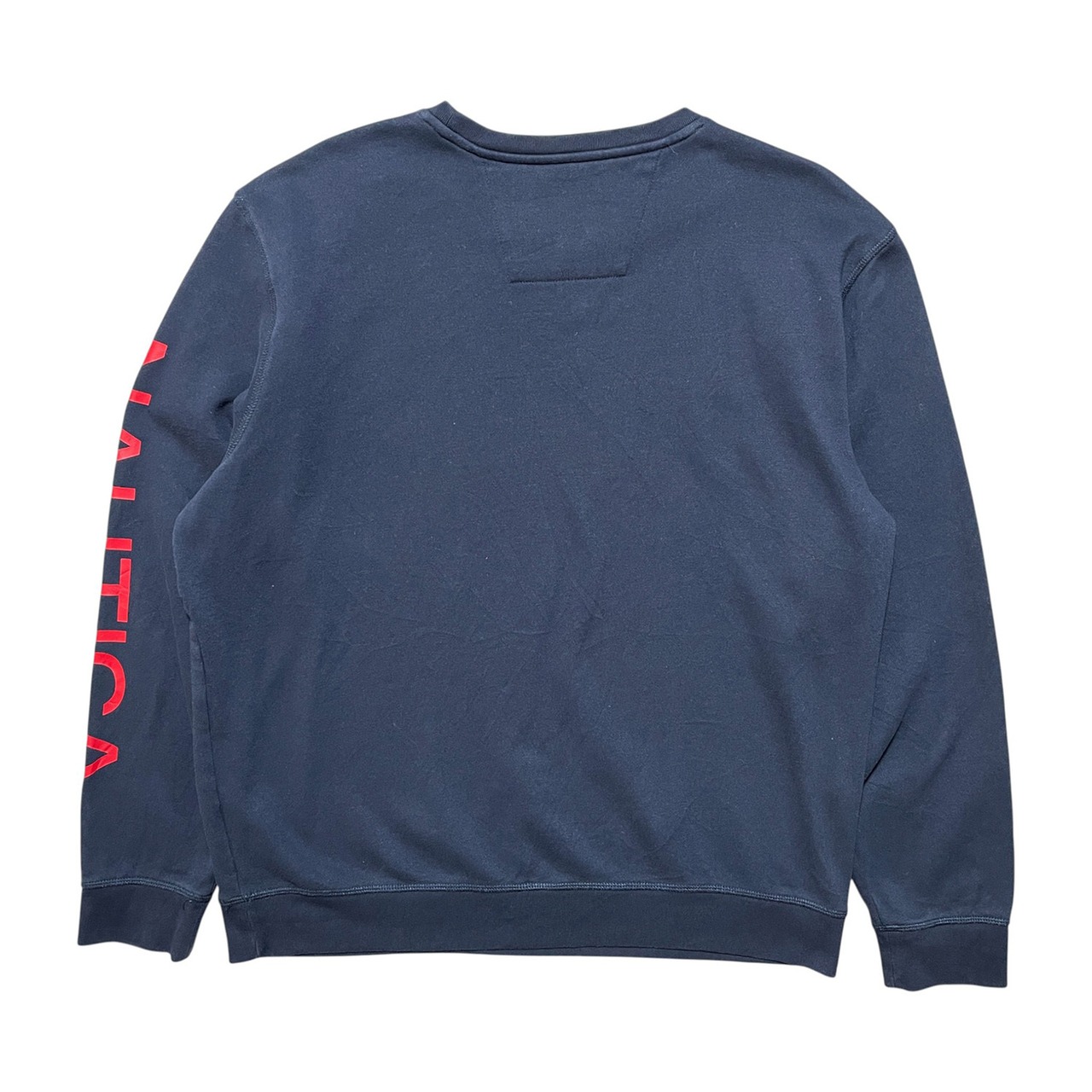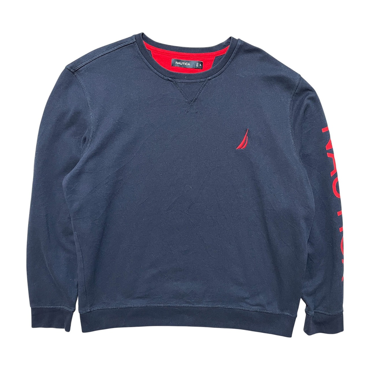 USA 古着 NAUTICA ノーティカ クルーネック スウェット トレーナー 刺繍 袖プリント ネイビー メンズXL BD3098