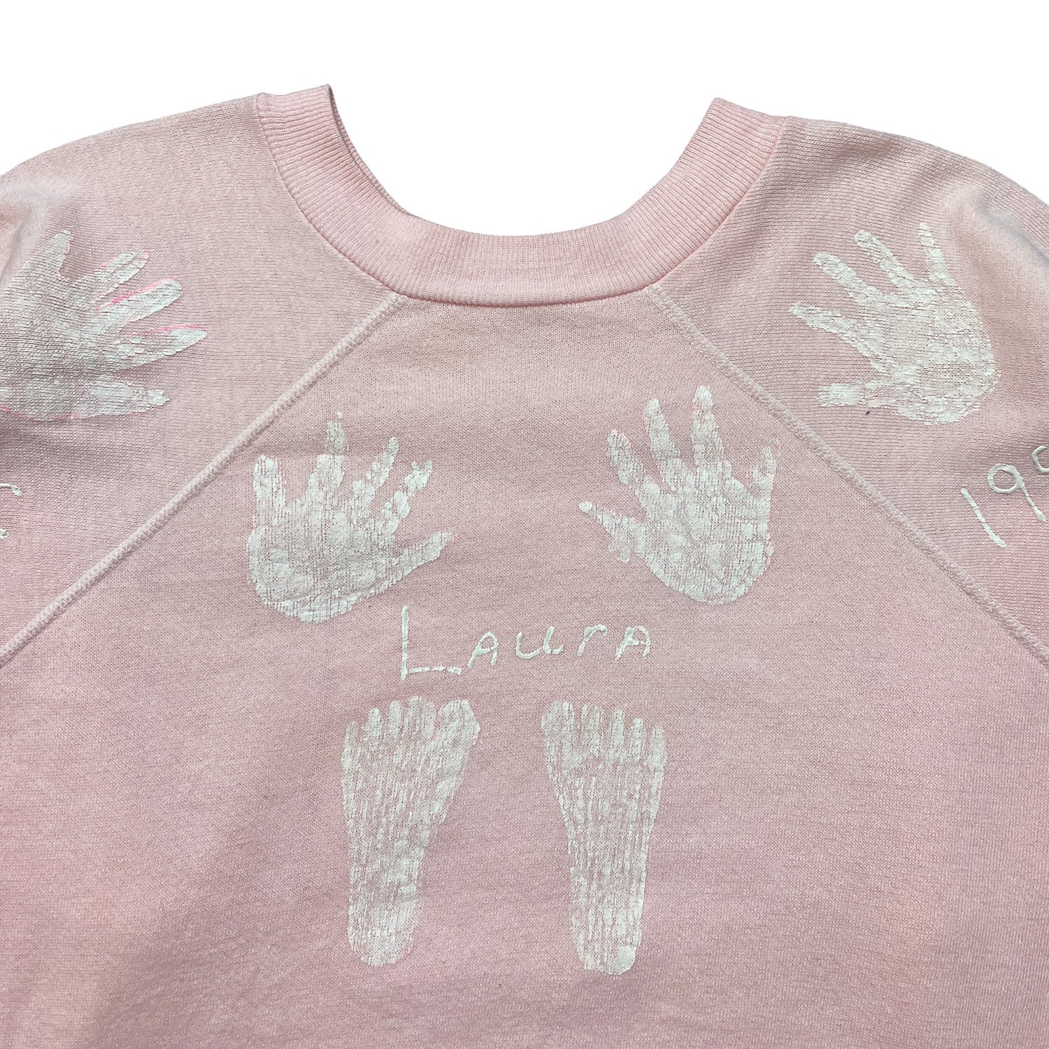 古着 USA製 90S ハンドペイント クルーネック ヴィンテージ スウェット トレーナー 足形 手型 プリント ピンク メンズS 程度 BD2478