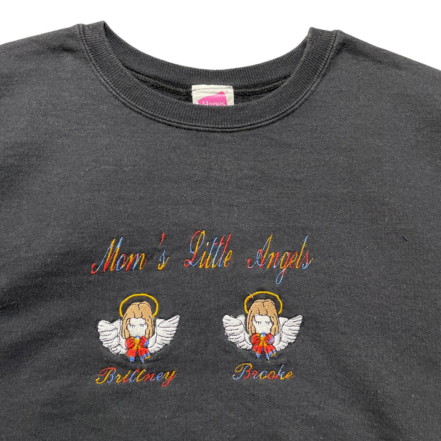 USA 古着 Hanes クルーネック 「ママの小さい天使達」 スウェット トレーナー 刺繍 ブラック 黒 メンズL BD3241