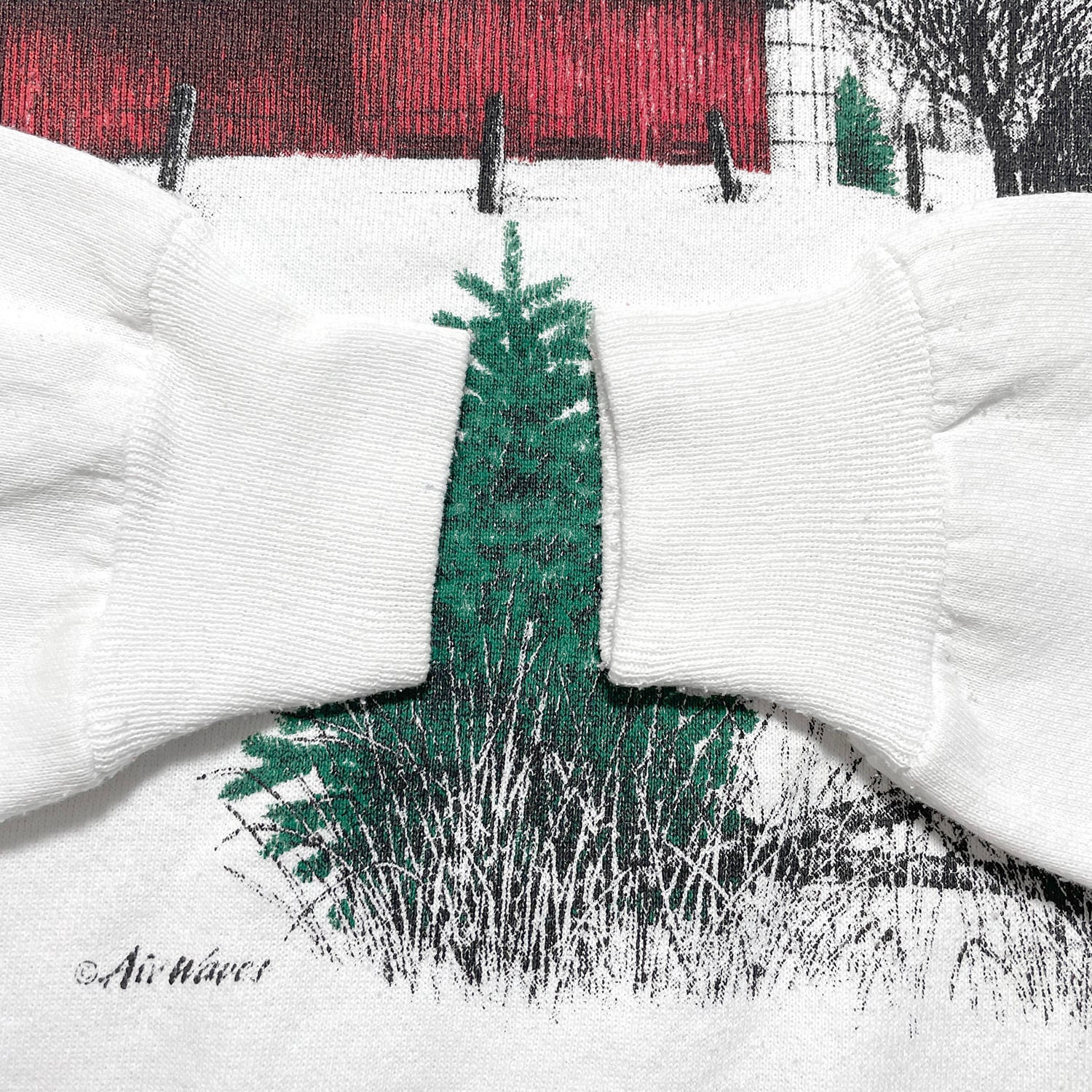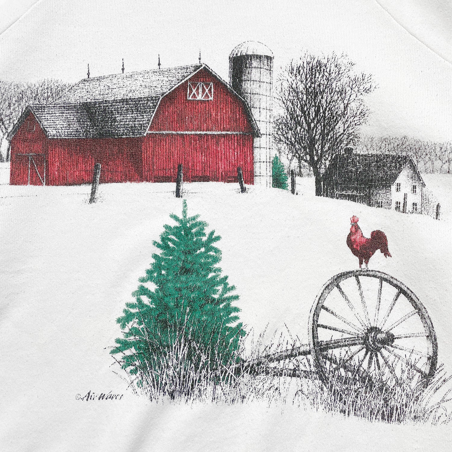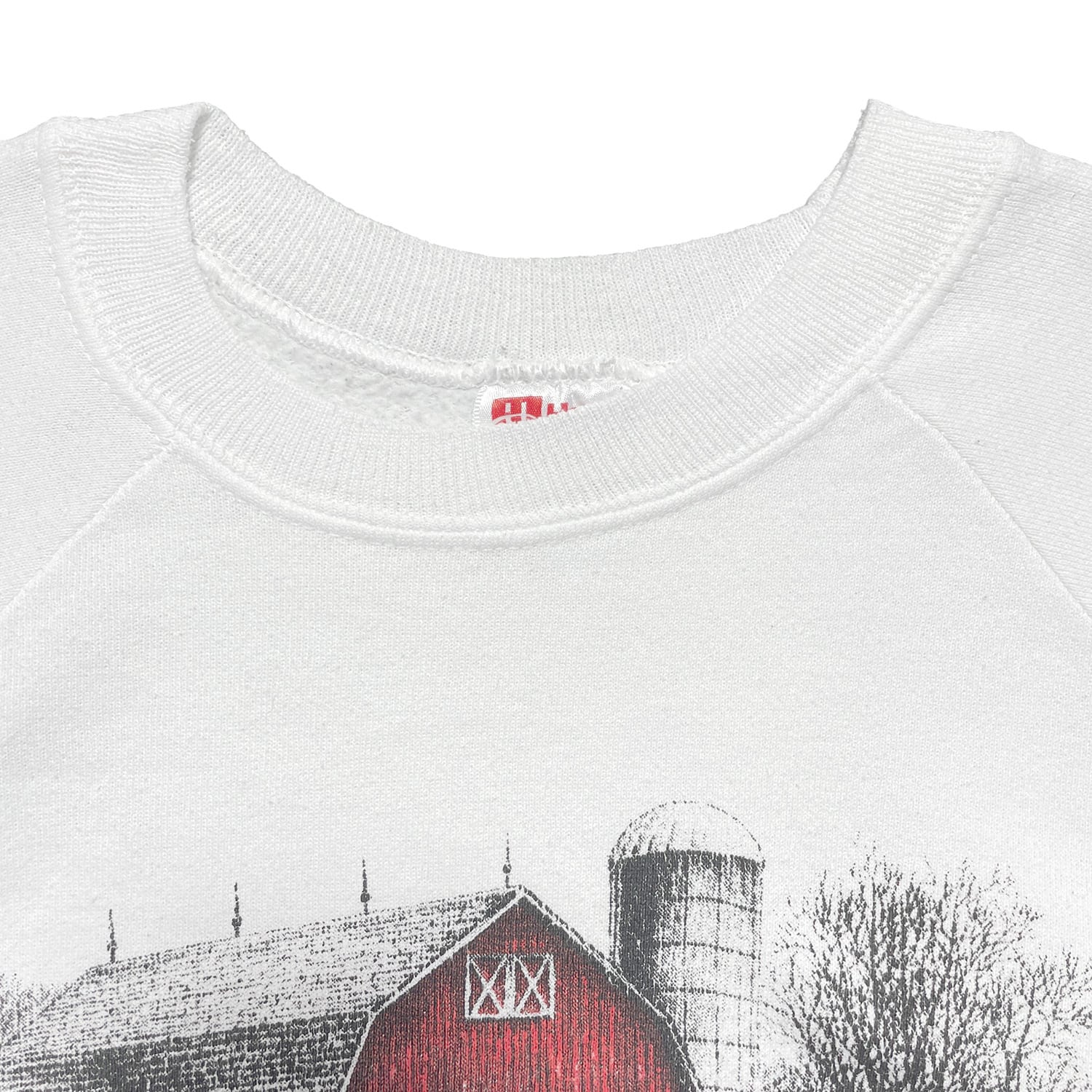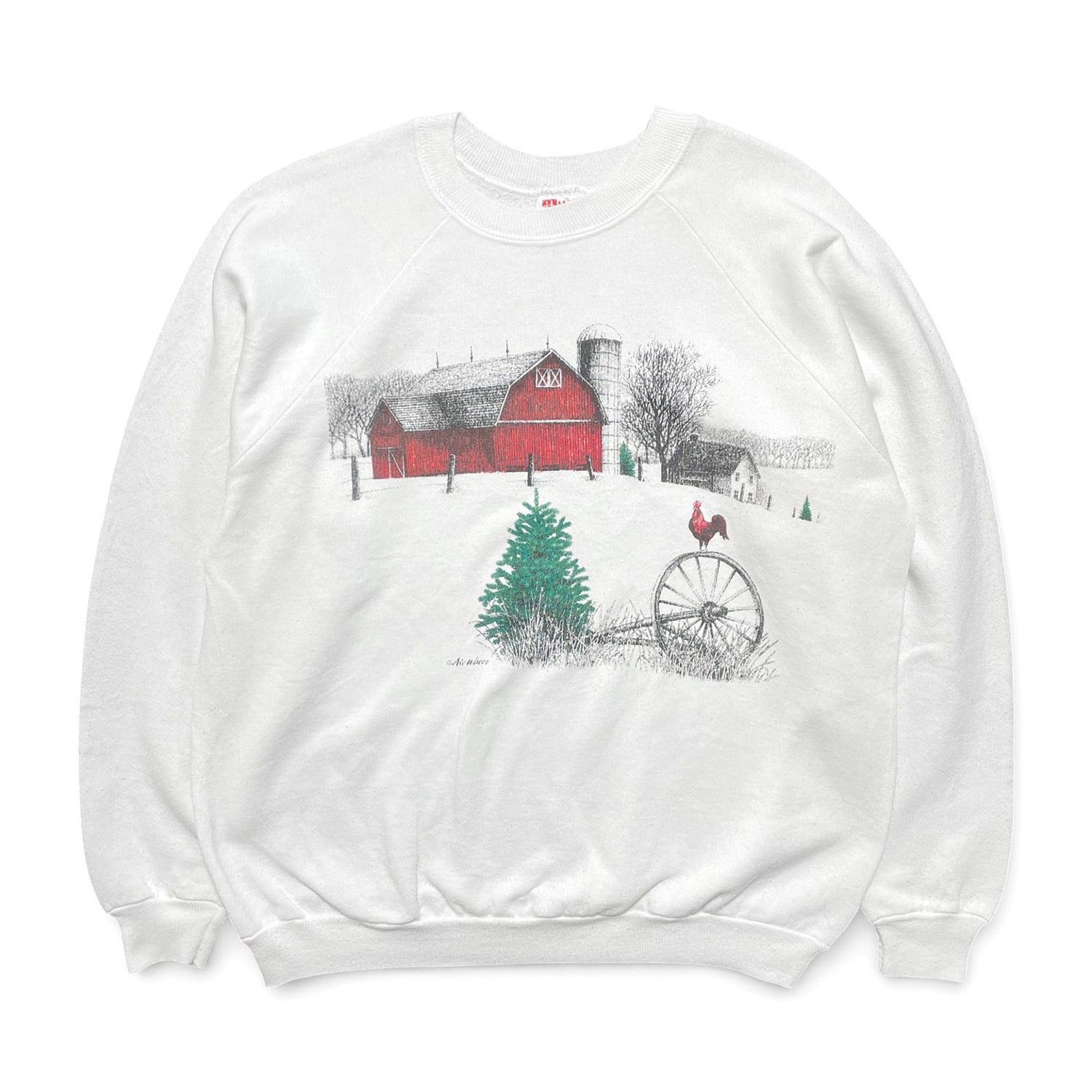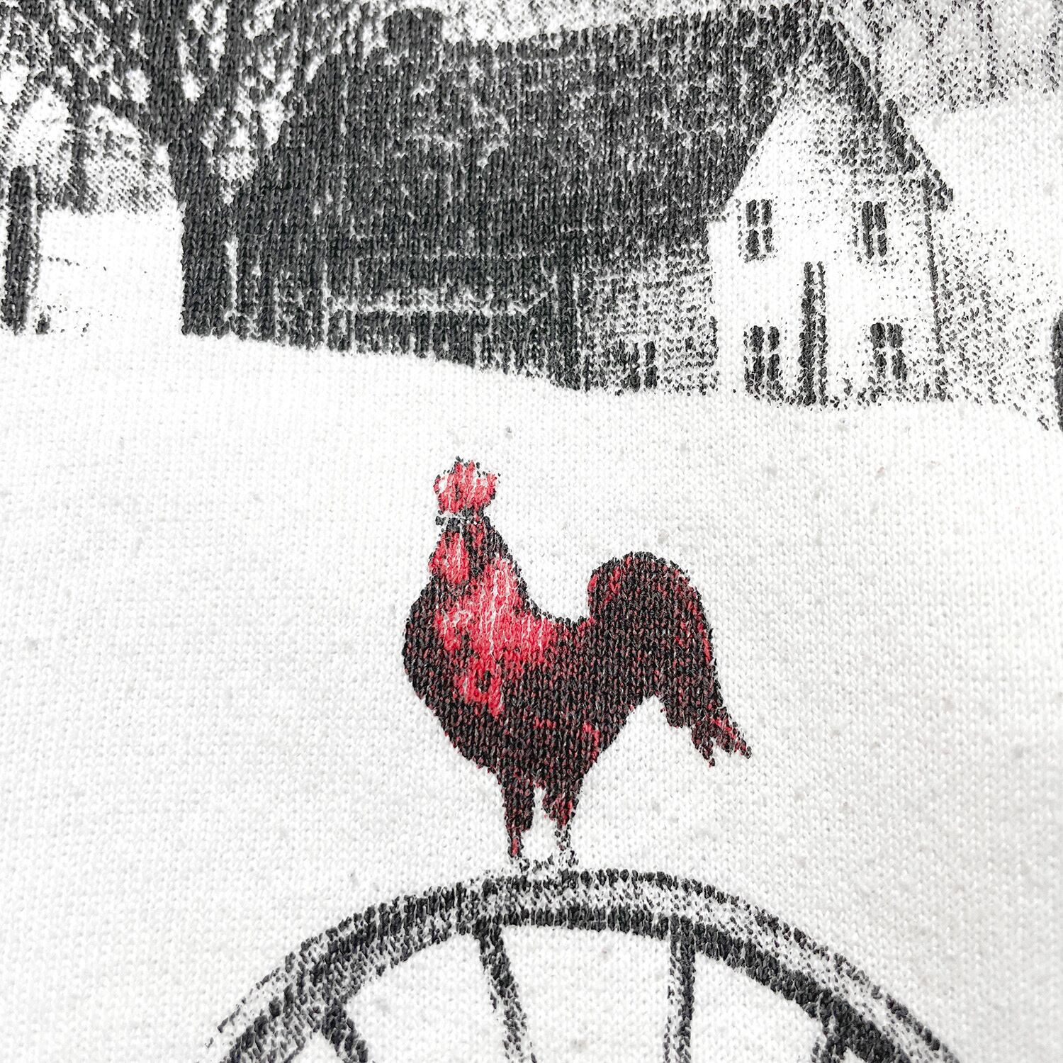 古着 USA製 90S クルーネック ヴィンテージ アート 「朝を告げるニワトリと赤い納屋」 スウェット トレーナー プリント ホワイト メンズL BD3280