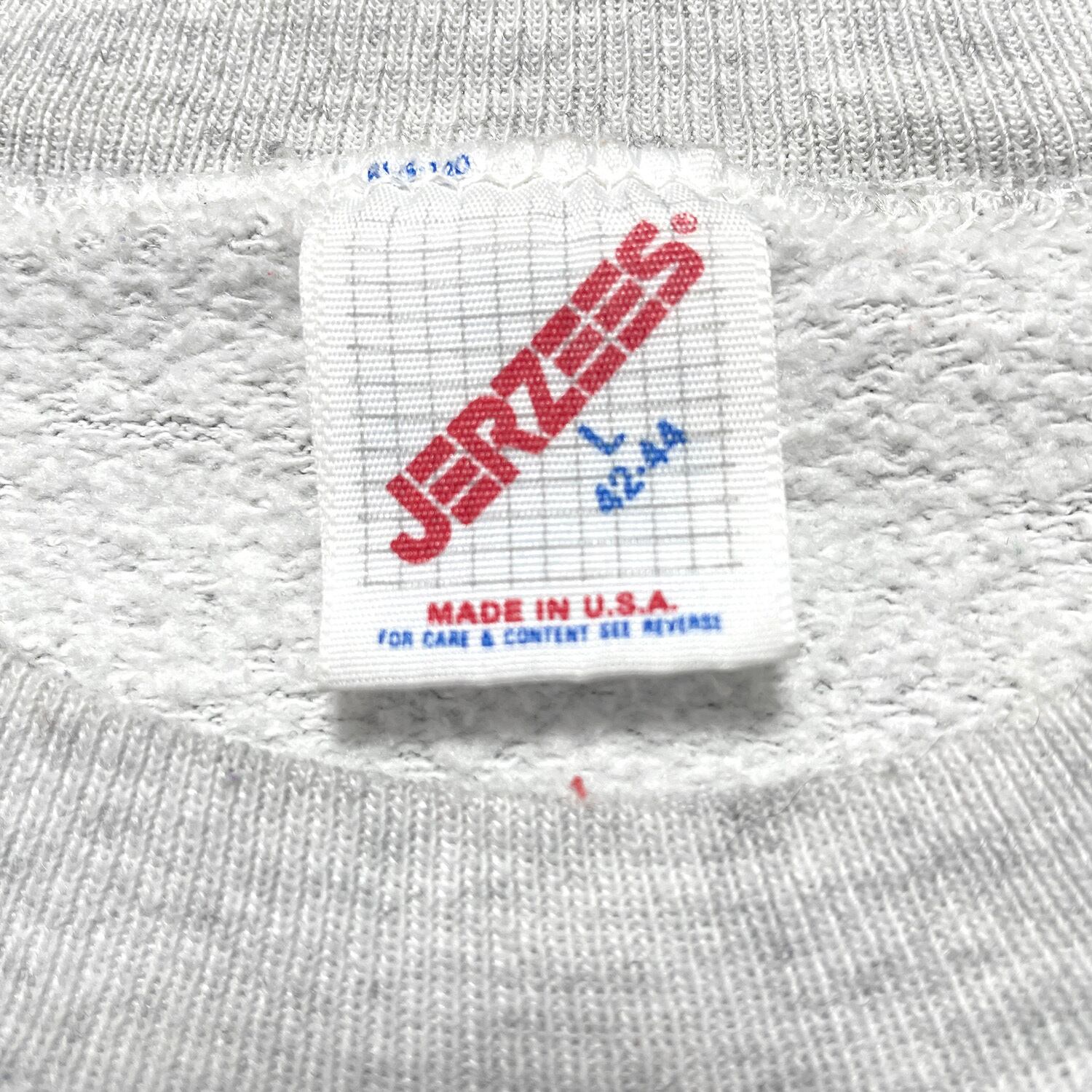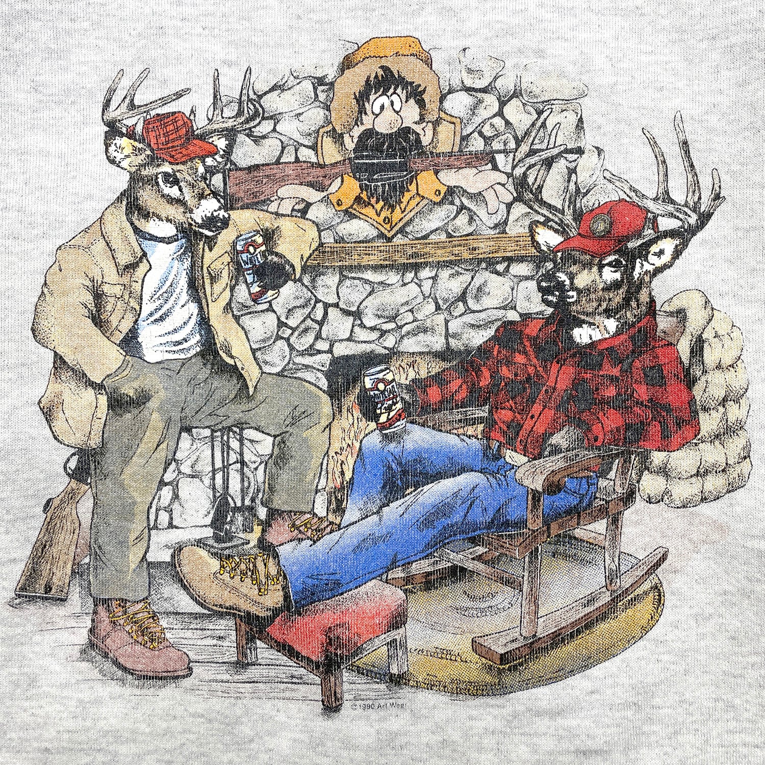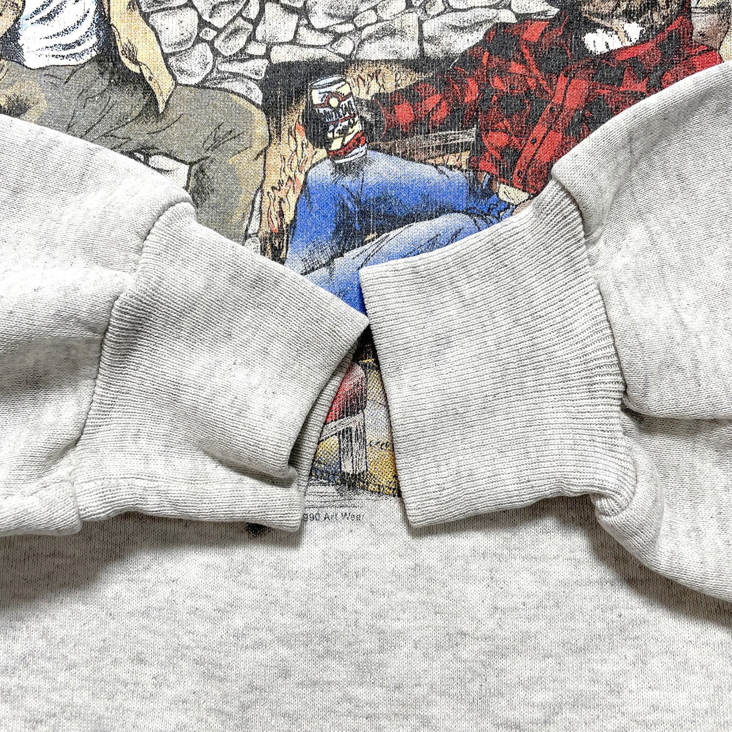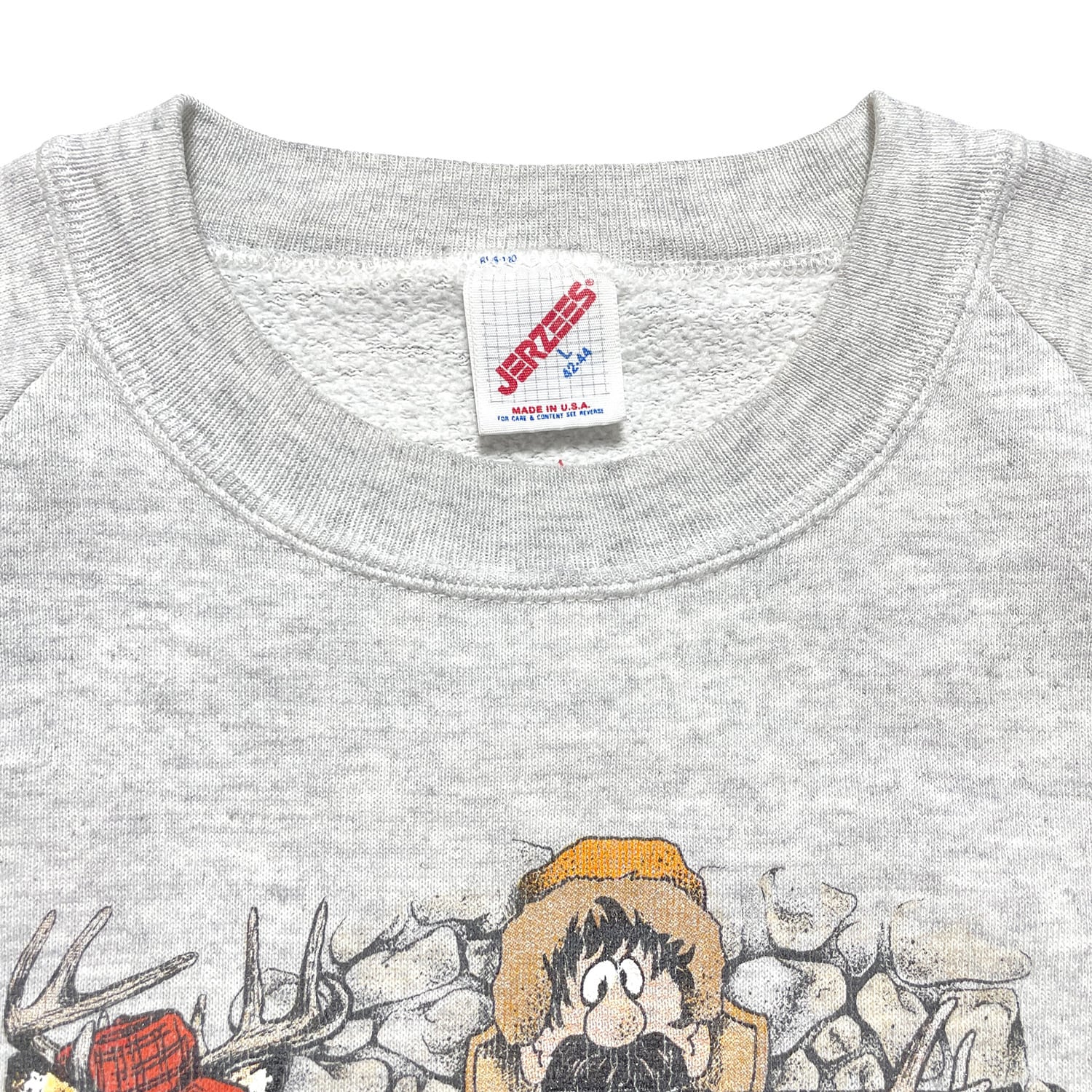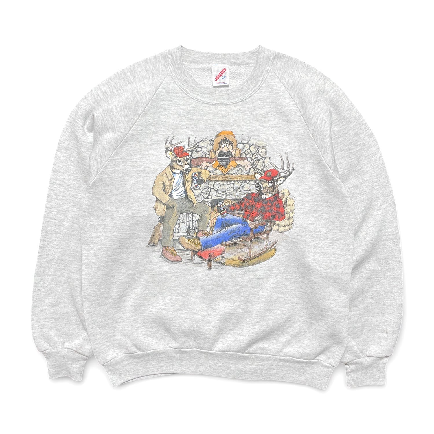 古着 90S USA製 ヴィンテージ クルーネック 「ハンターとトナカイ」 スウェット トレーナー 風刺画 プリント グレー メンズL BD3283