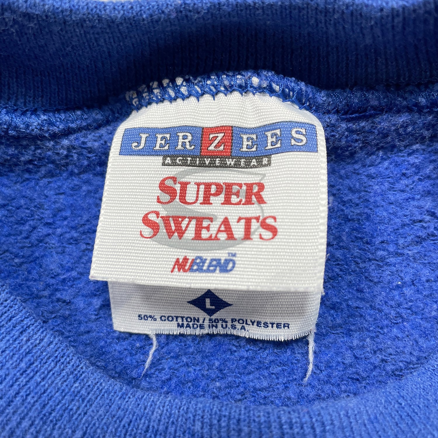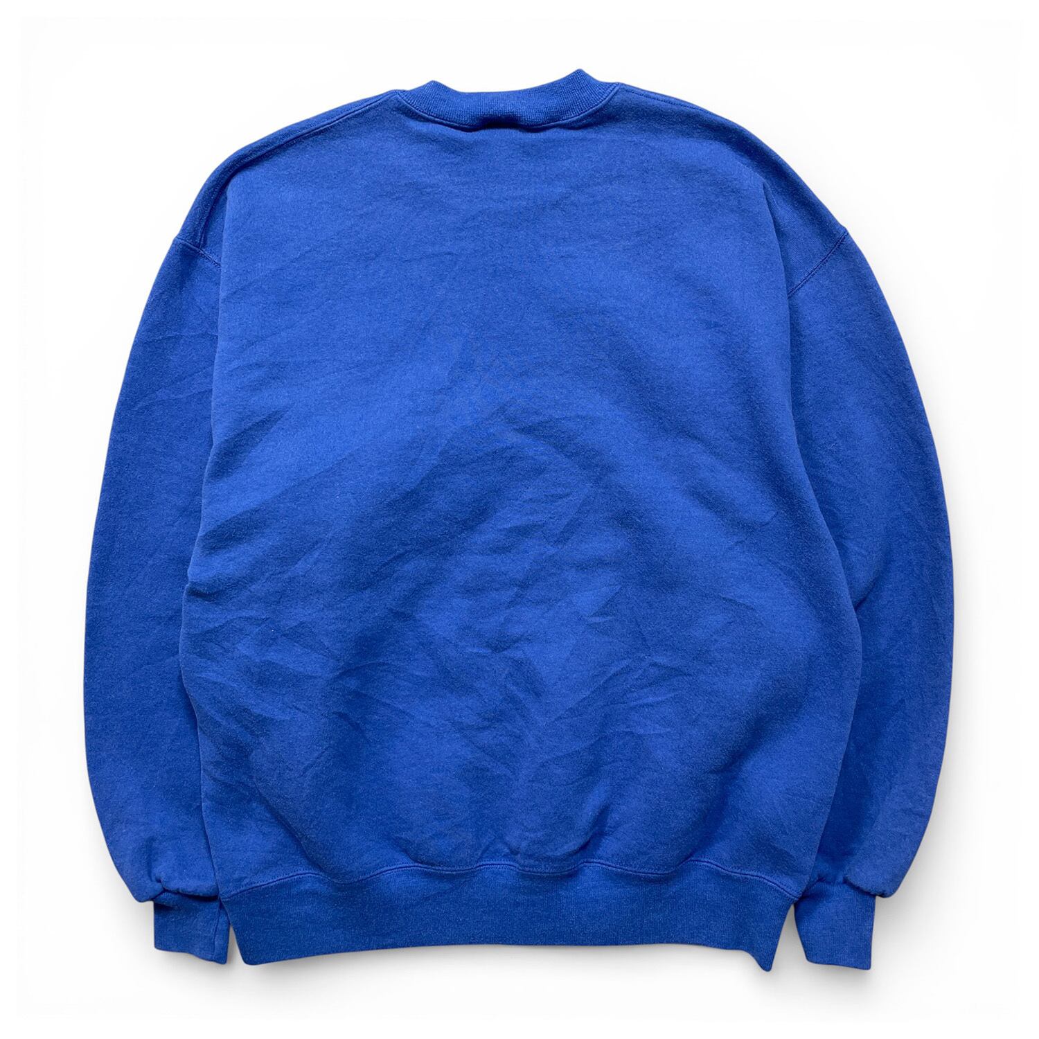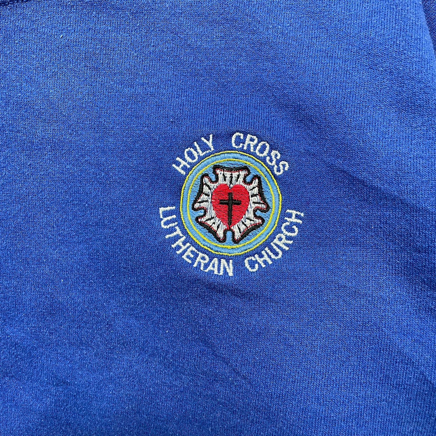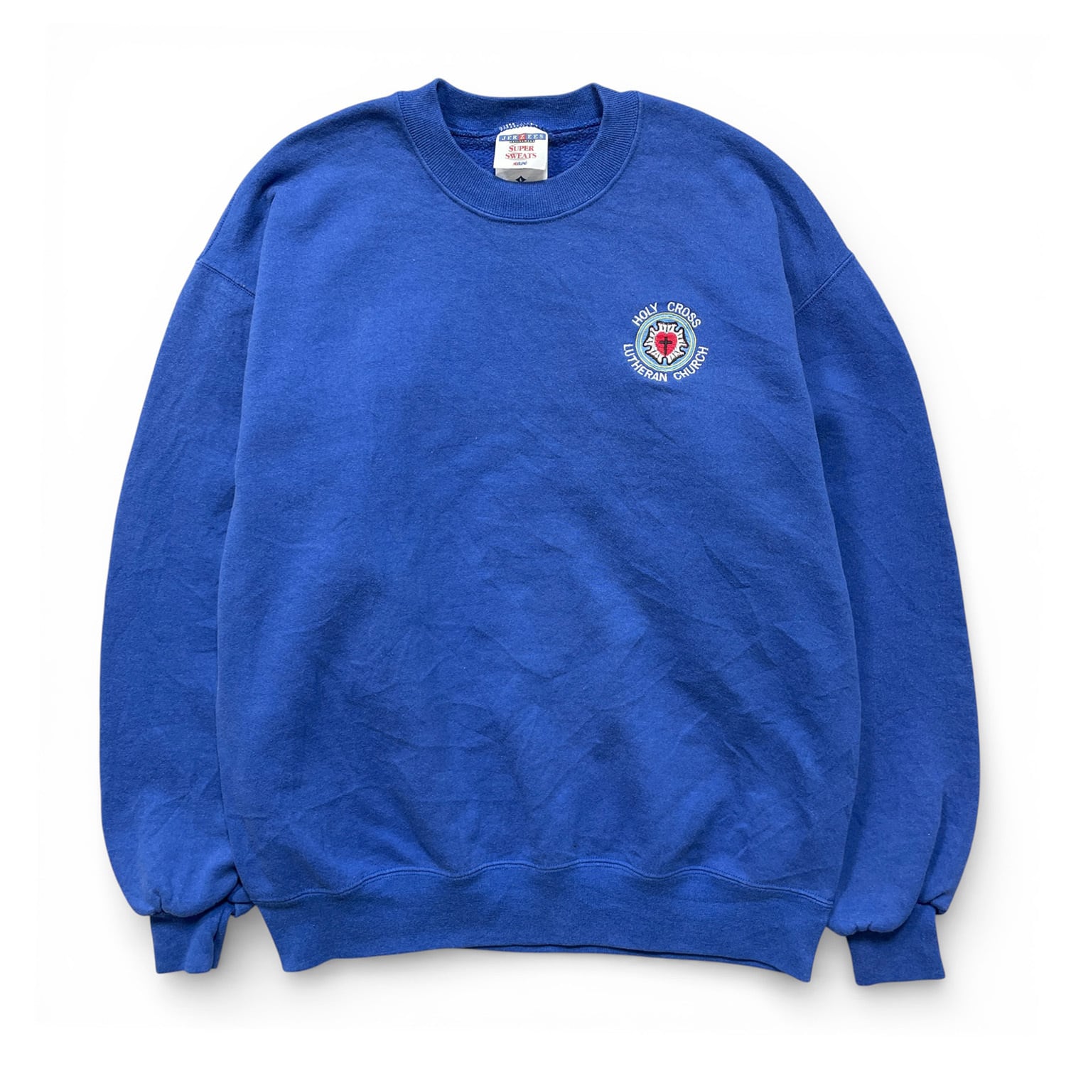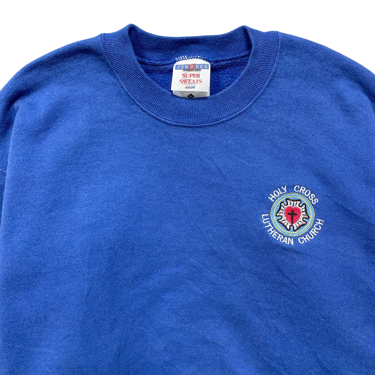 古着 USA製 90S JERZEES ホーリークロス ルーテル教会 チャーチ クルーネック スウェット トレーナー 刺繍ロゴ ブルー メンズL BD3332