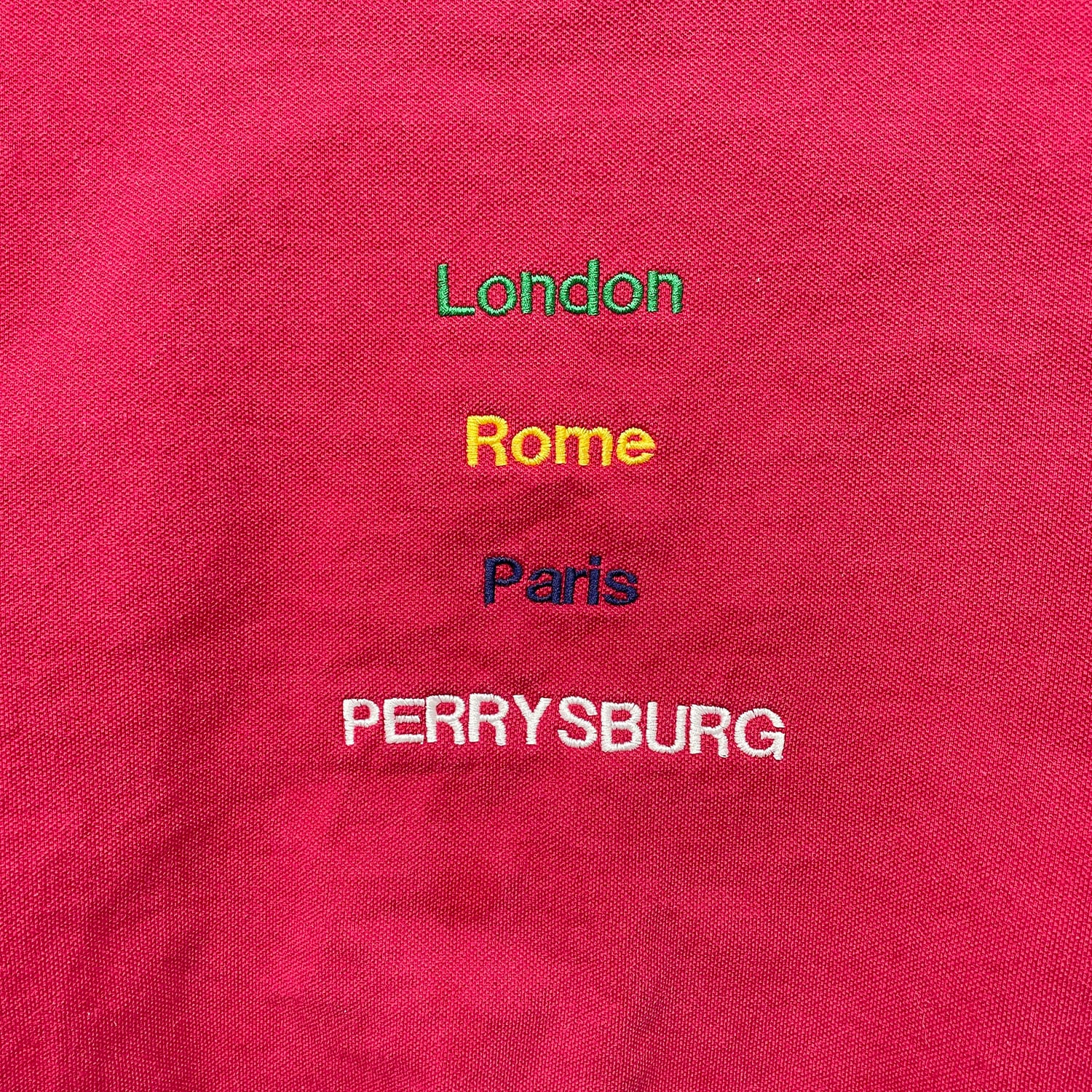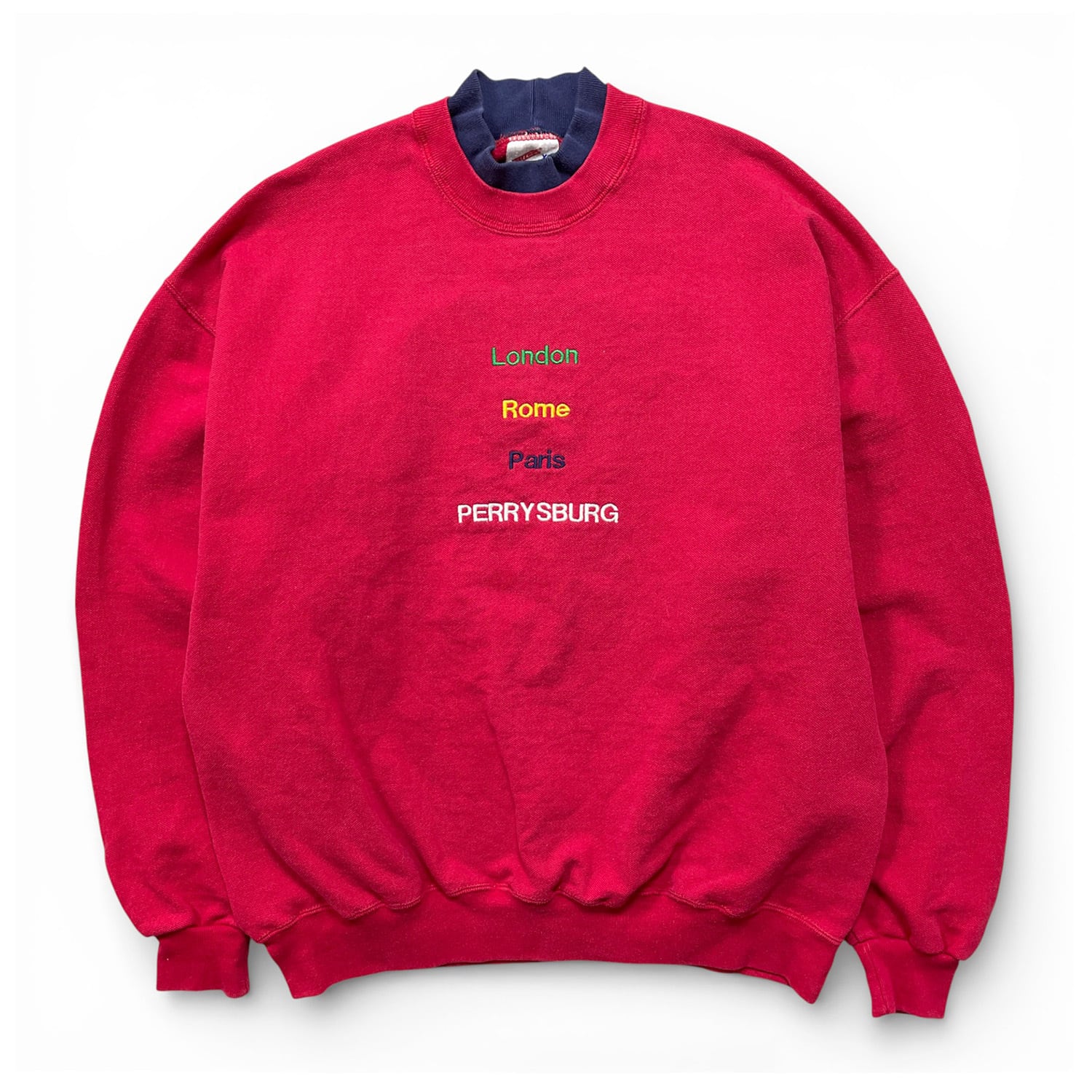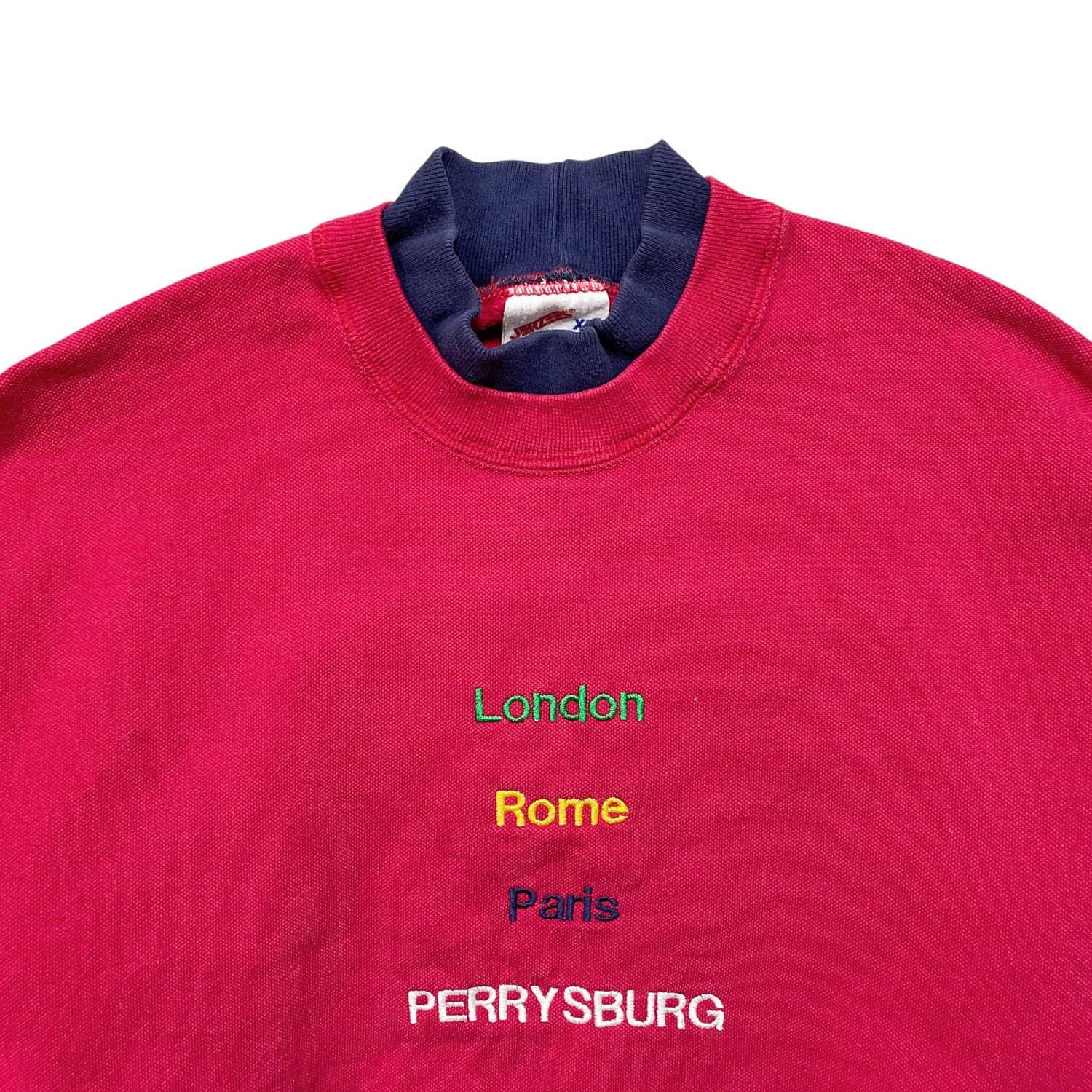 古着 USA製 90S ダブルネック スウェット トレーナー ロンドン ローマ パリ ペリーズバーグ 刺繍 レッド メンズXL BD3336