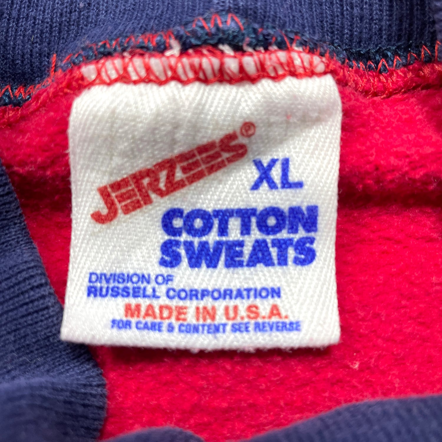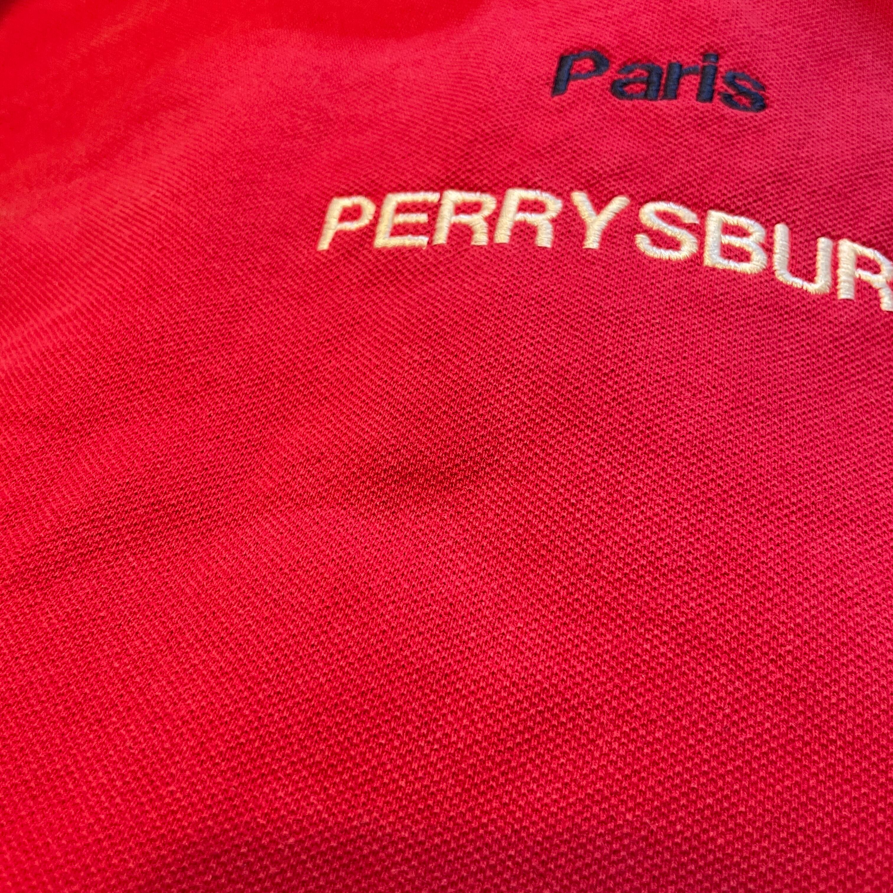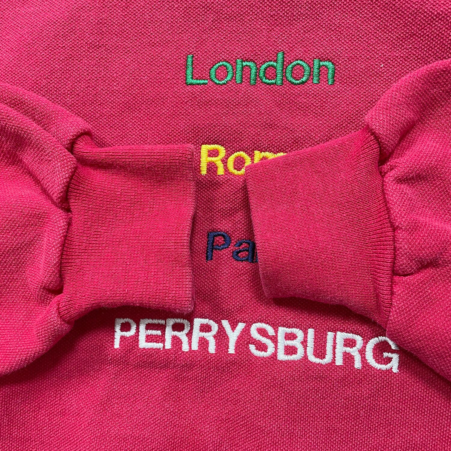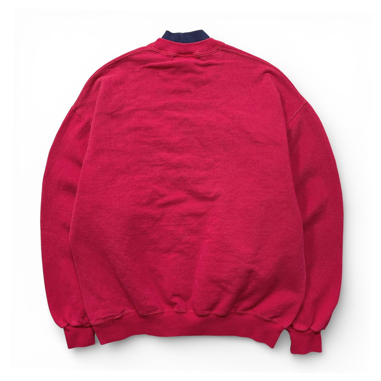 古着 USA製 90S ダブルネック スウェット トレーナー ロンドン ローマ パリ ペリーズバーグ 刺繍 レッド メンズXL BD3336