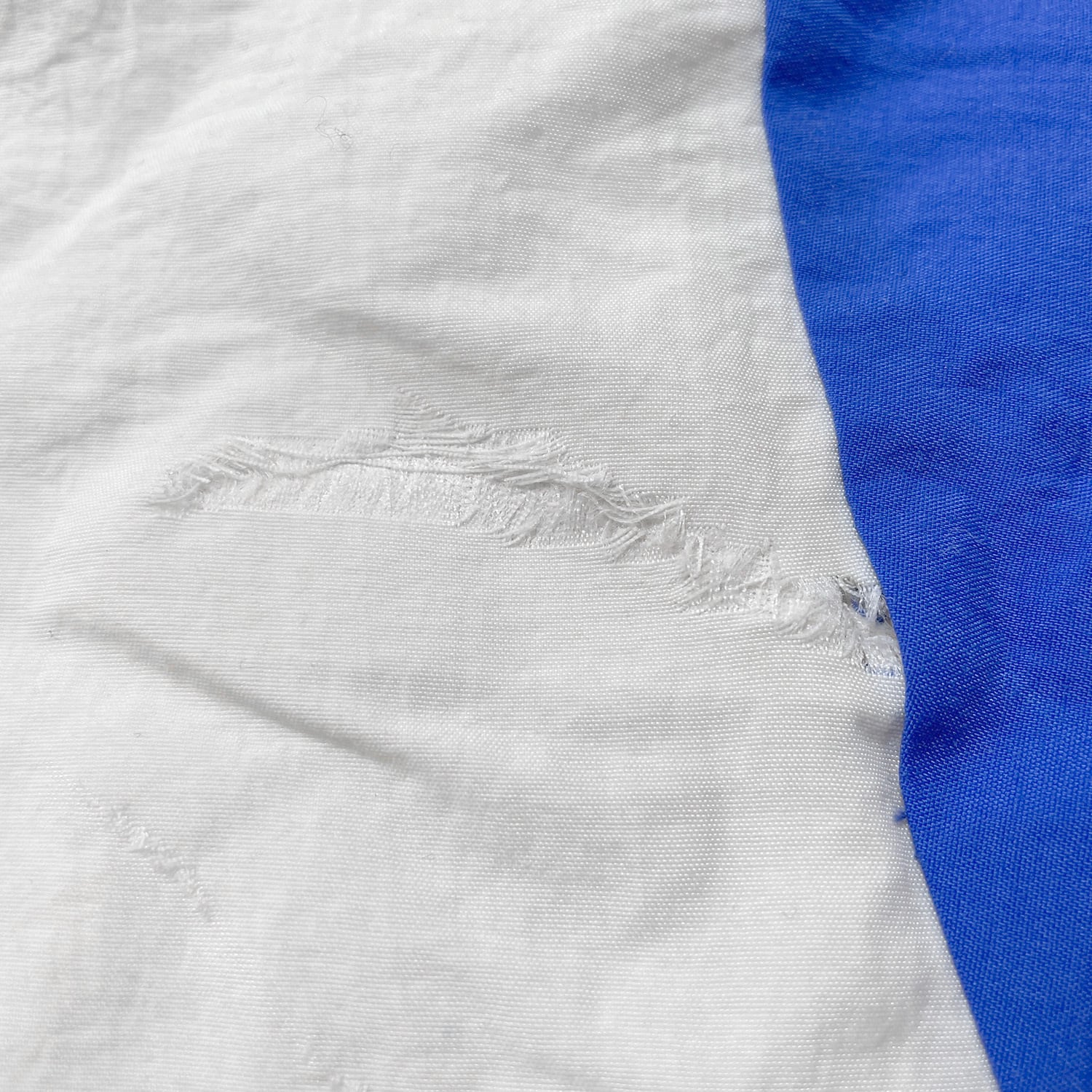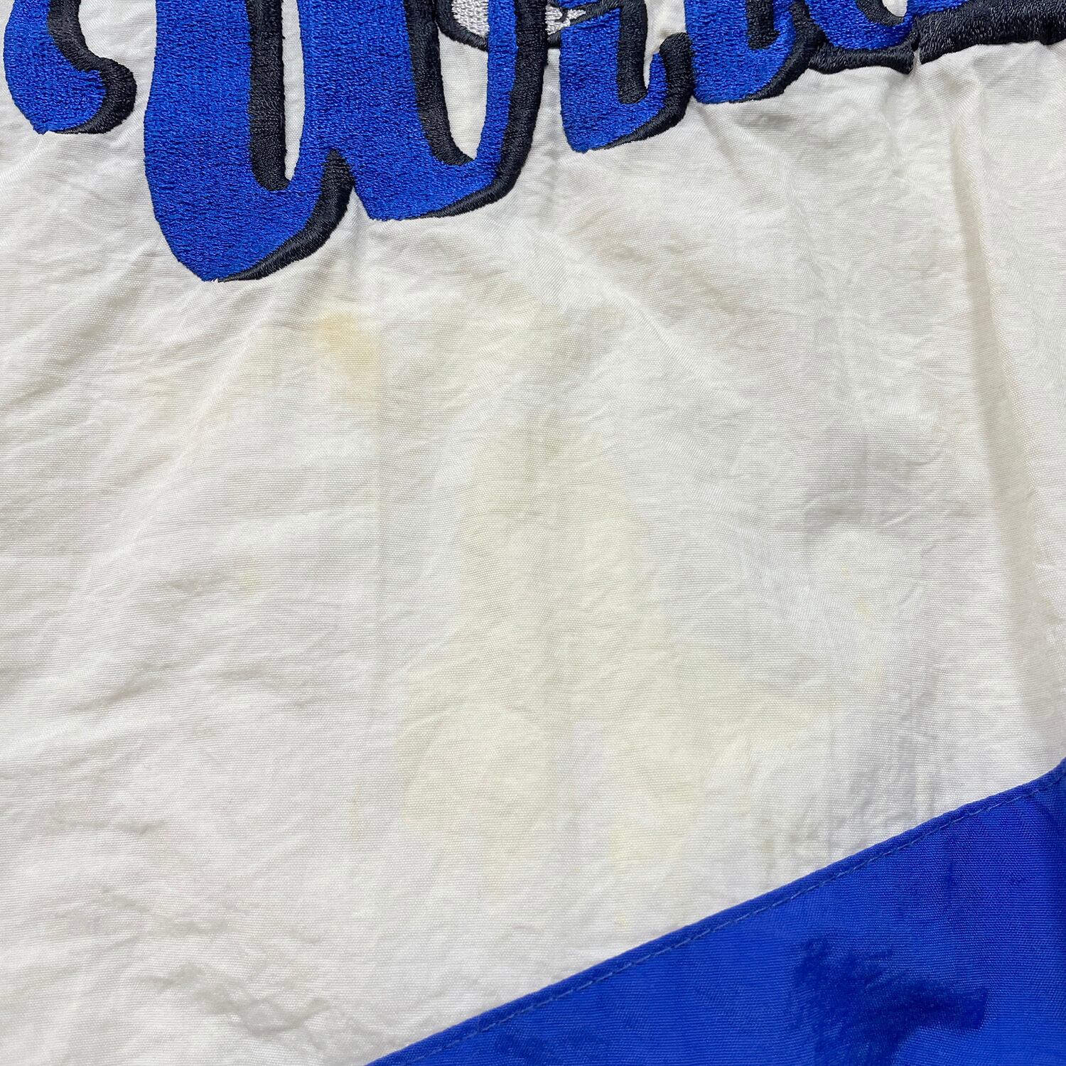 フロント面・背中面の白い箇所に薄汚れ、背中面にダメージの補修跡がみられるコンディションになります。