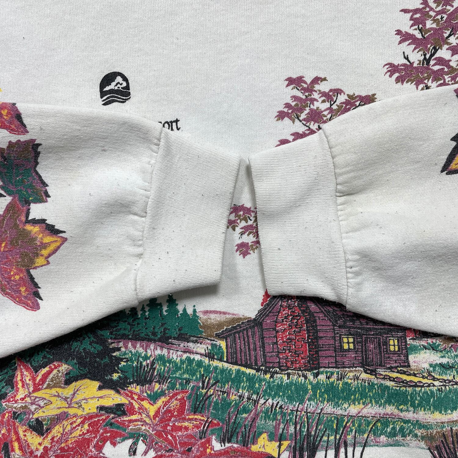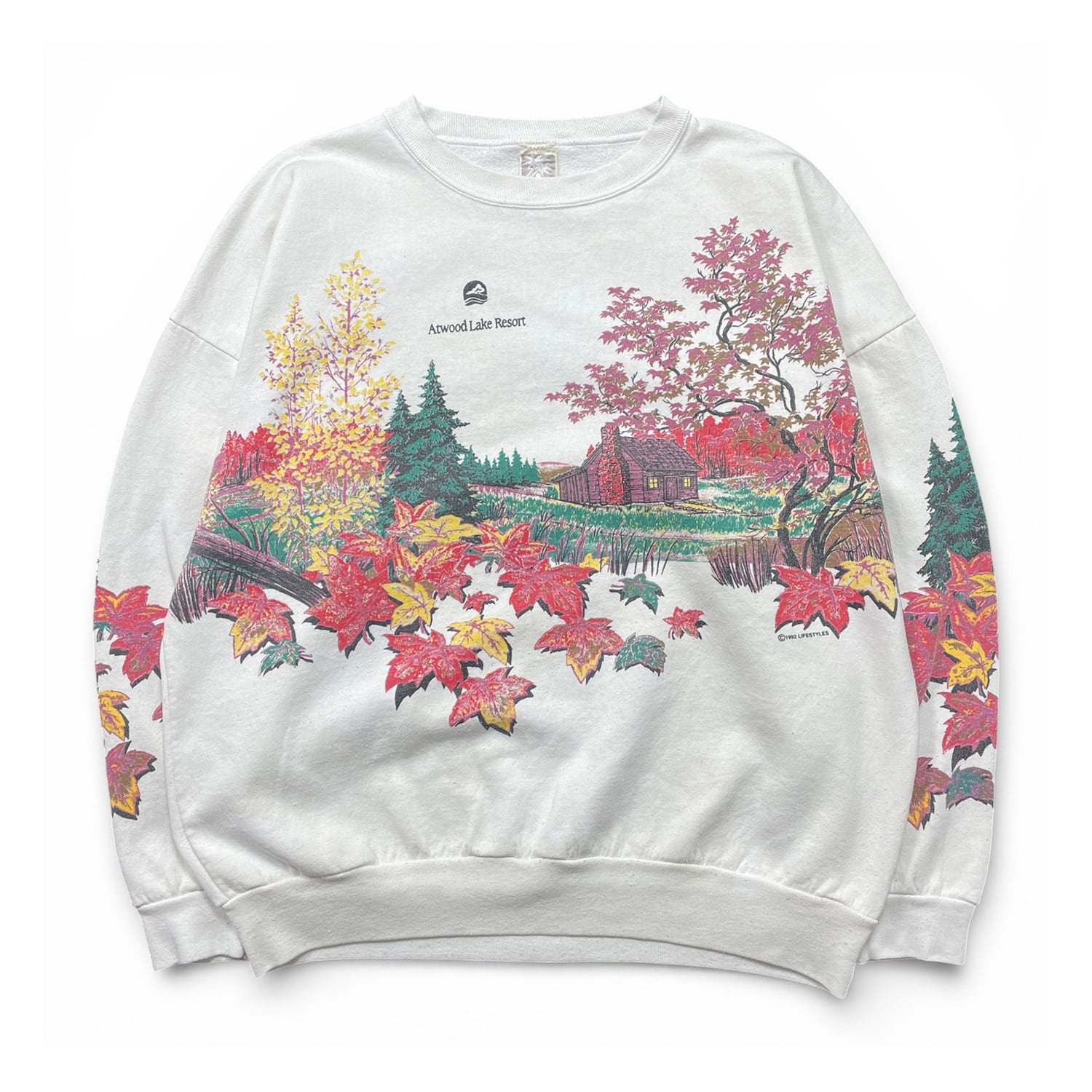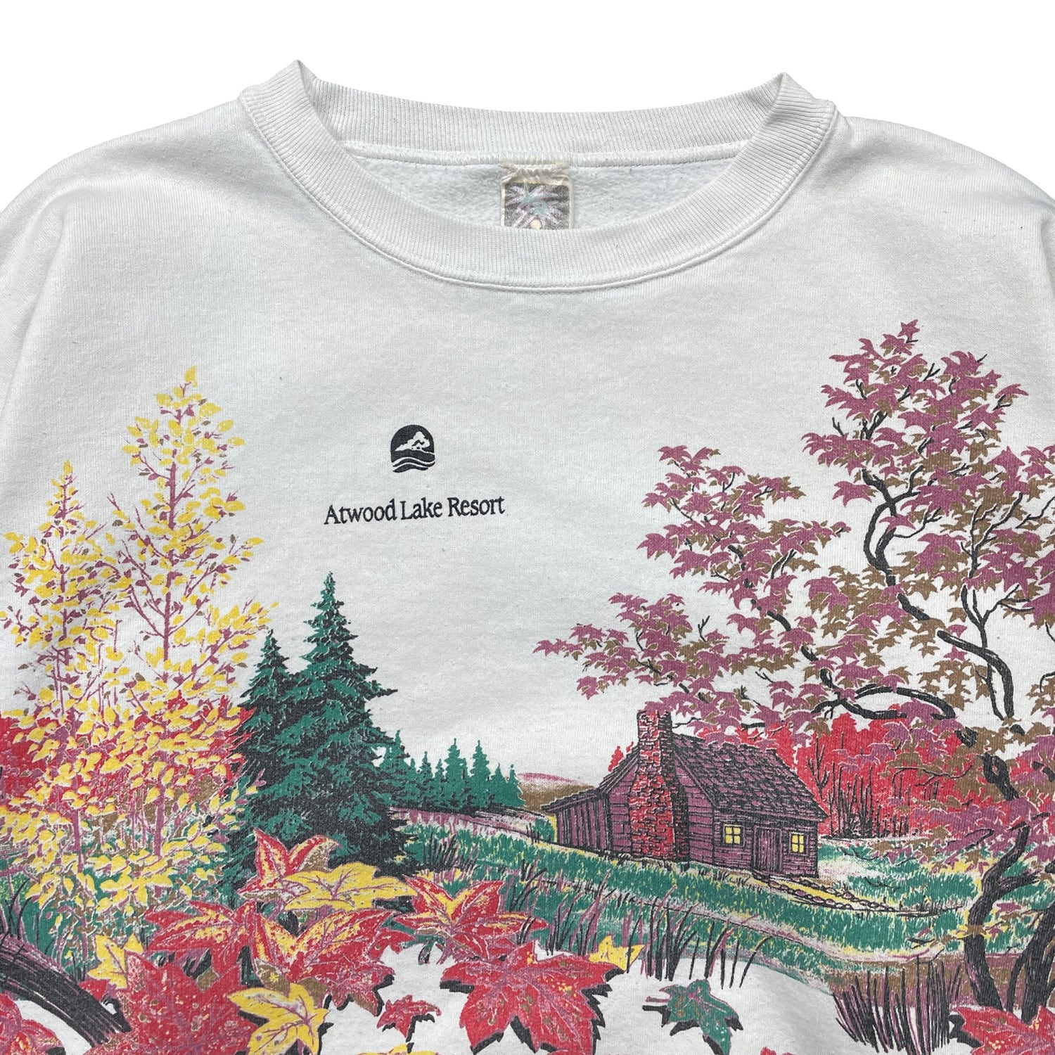古着 USA製 90S アトウッド湖 ヴィンテージ クルーネック スウェット トレーナー アート プリント ホワイト メンズXL BD3370