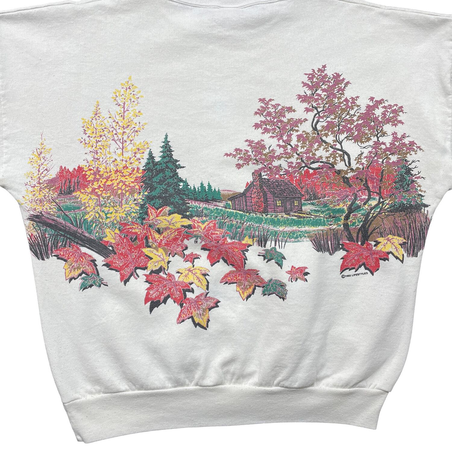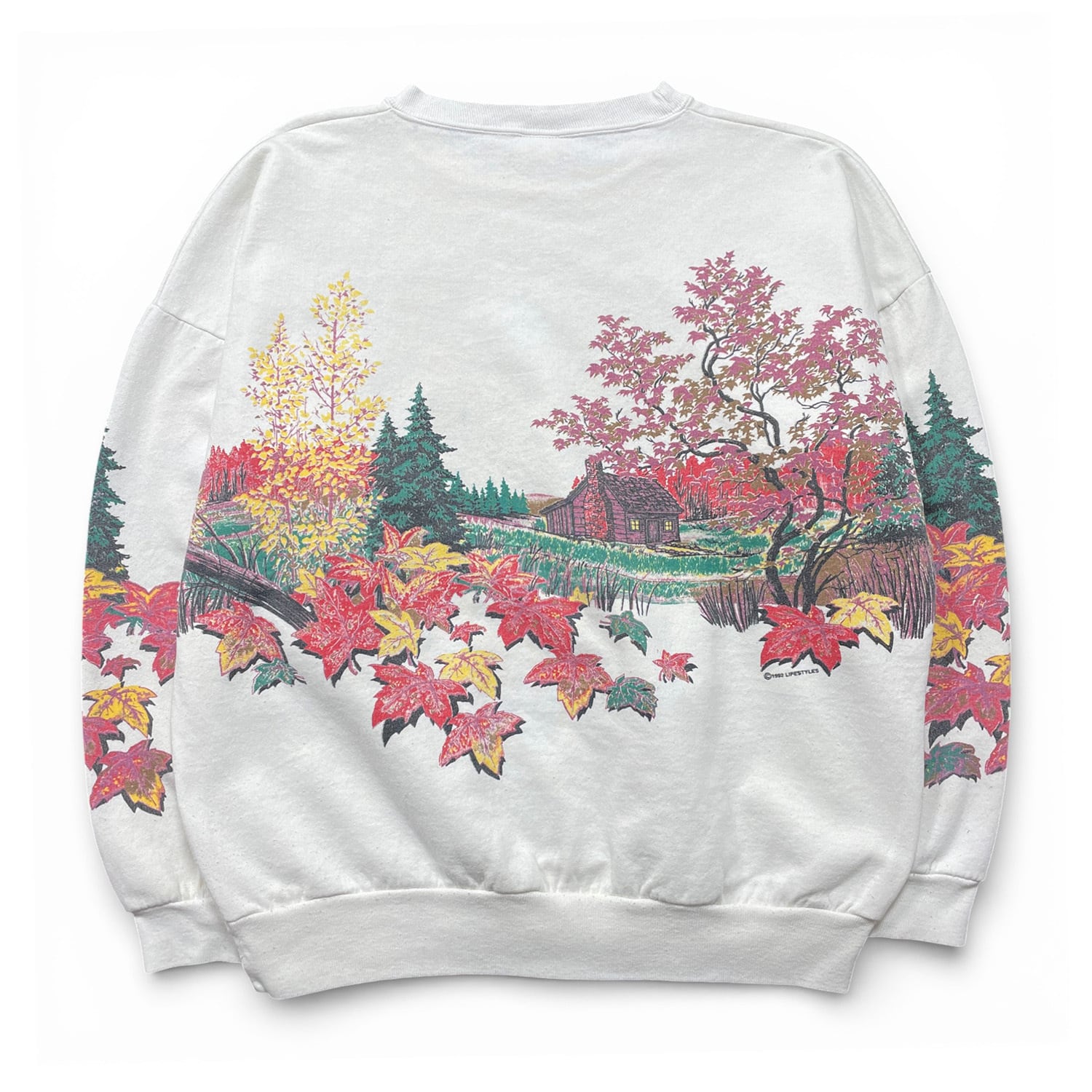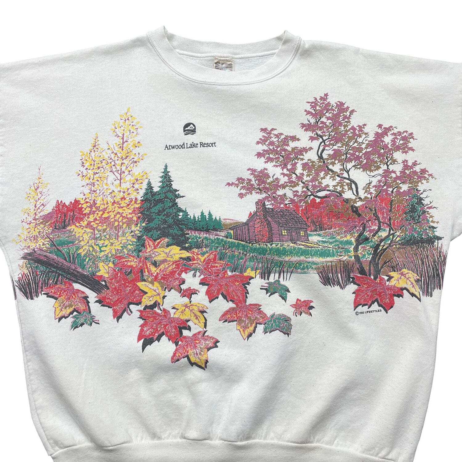 古着 USA製 90S アトウッド湖 ヴィンテージ クルーネック スウェット トレーナー アート プリント ホワイト メンズXL BD3370