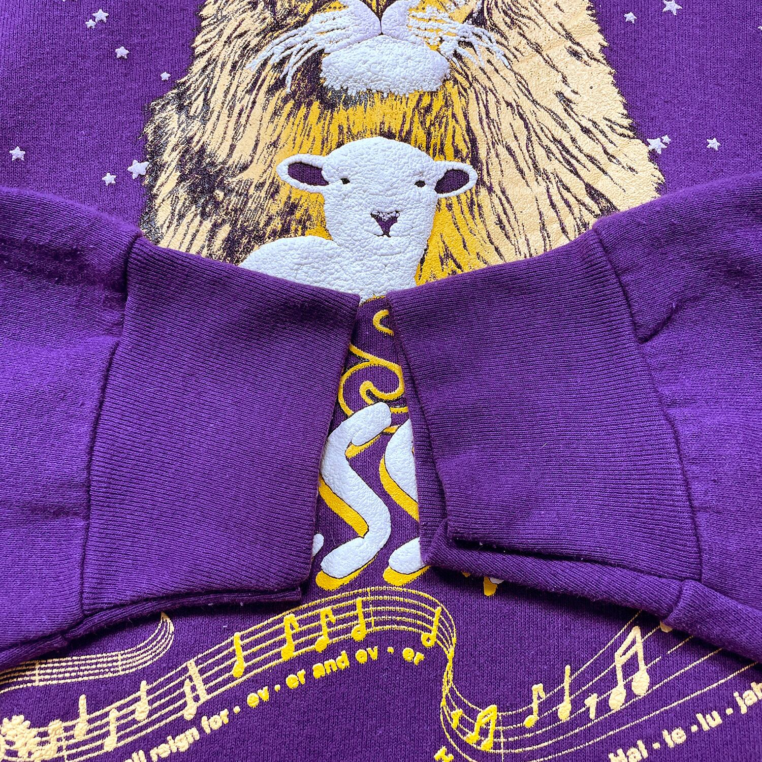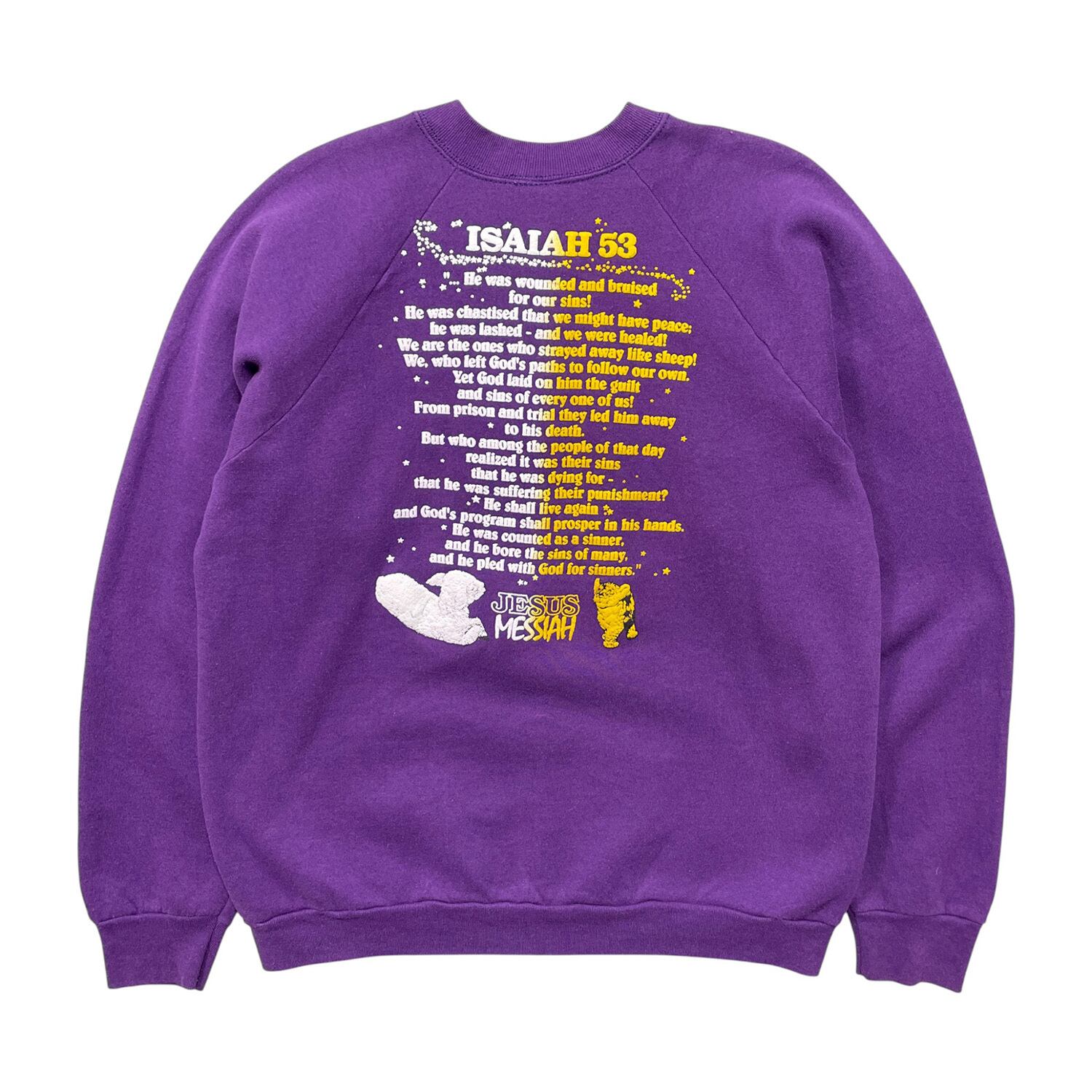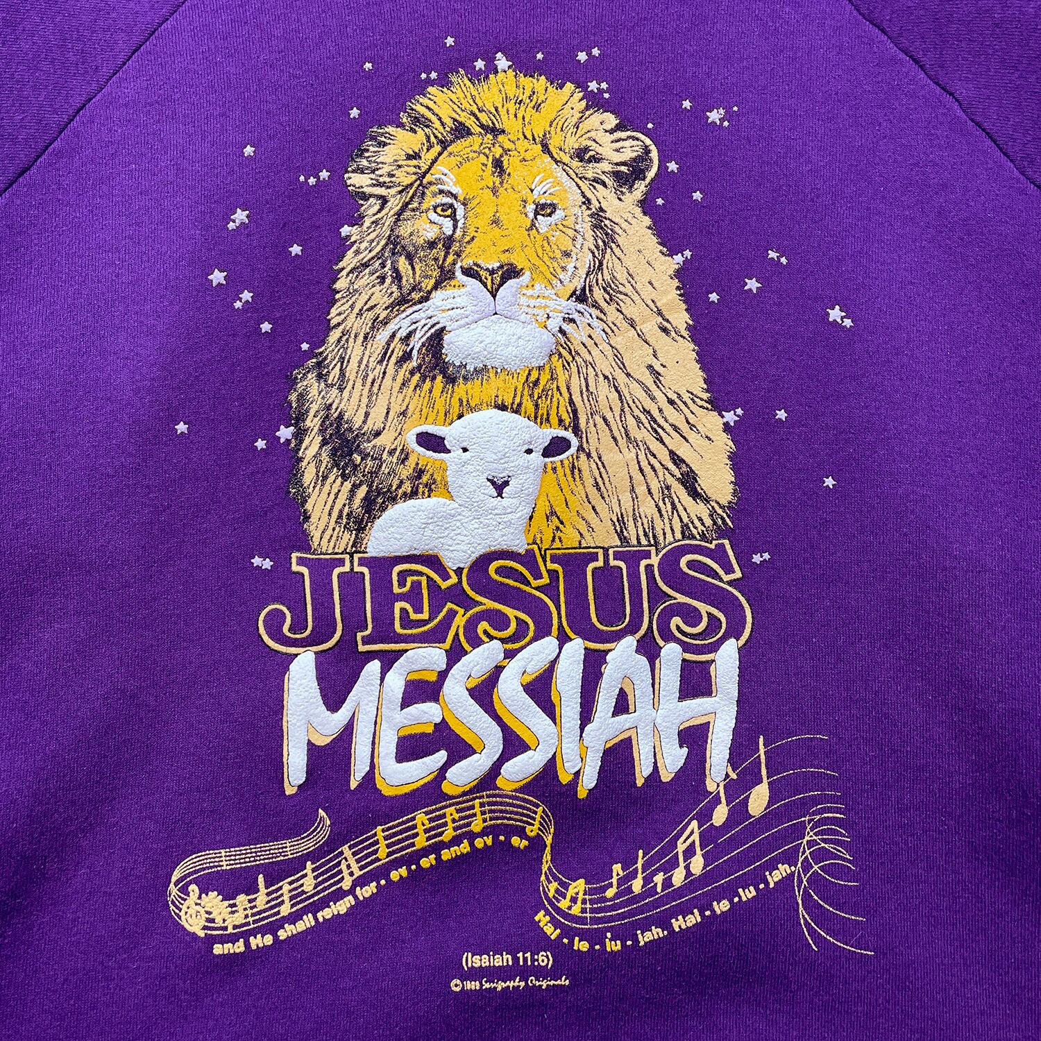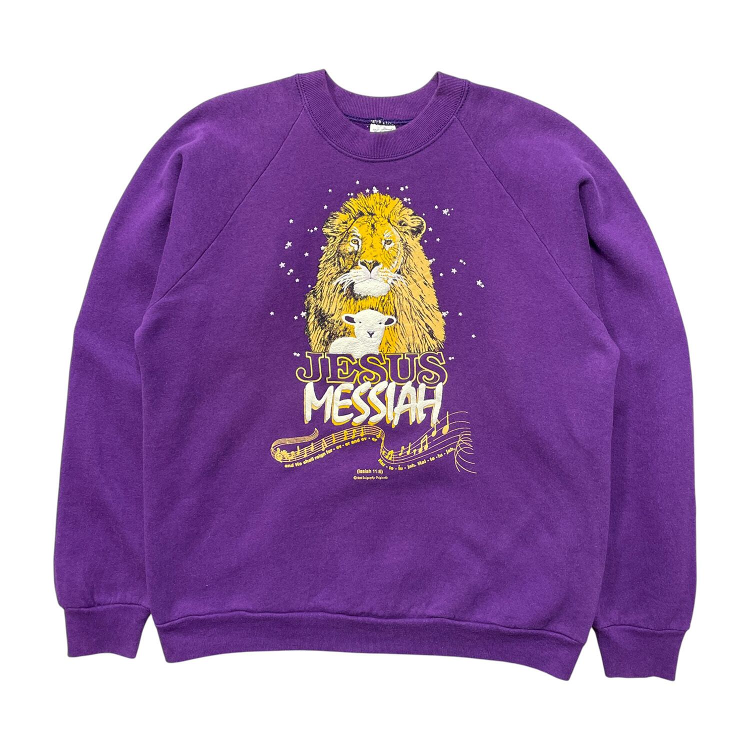 古着 USA製 80S ジーザスメシア 旧約聖書 イザヤ書 11章6節 ヴィンテージ クルーネック スウェット トレーナー 発砲プリント パープル メンズXL BD3395