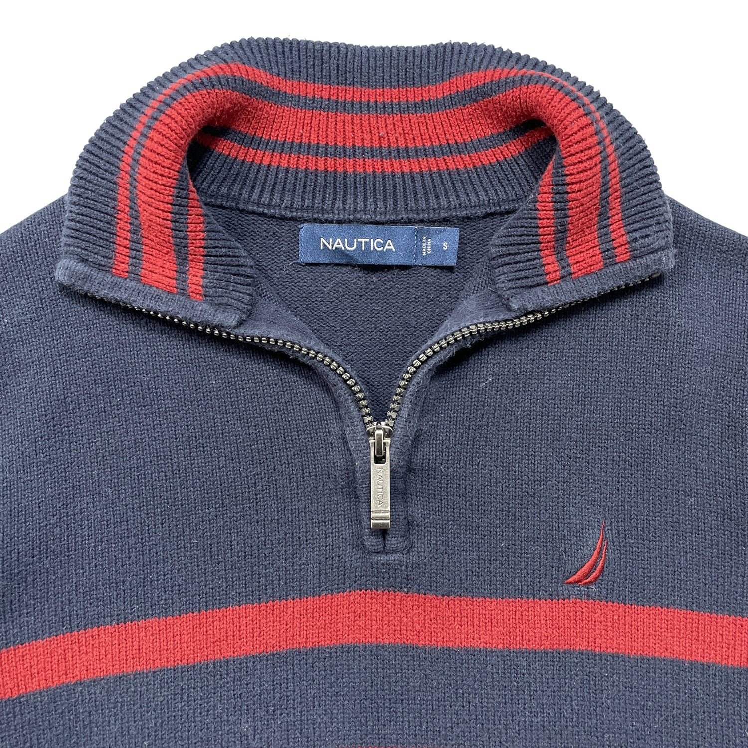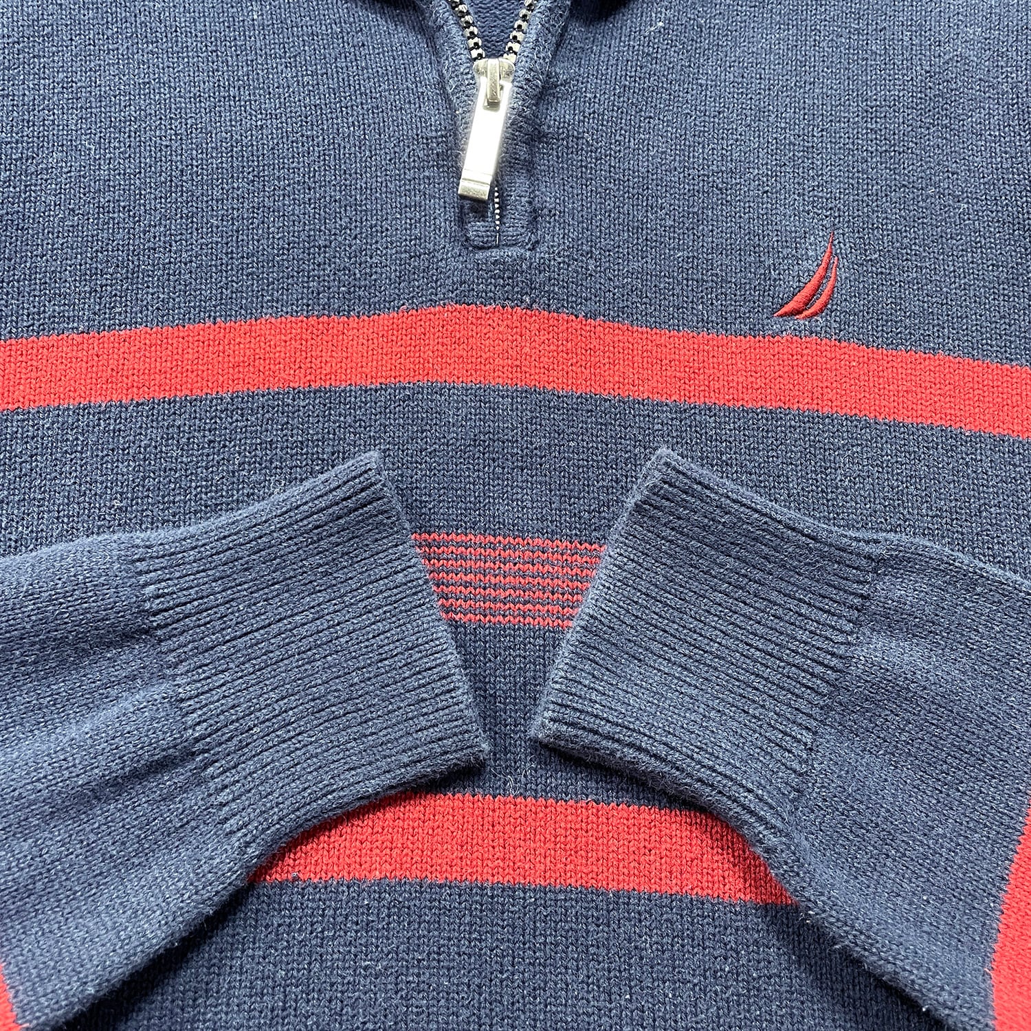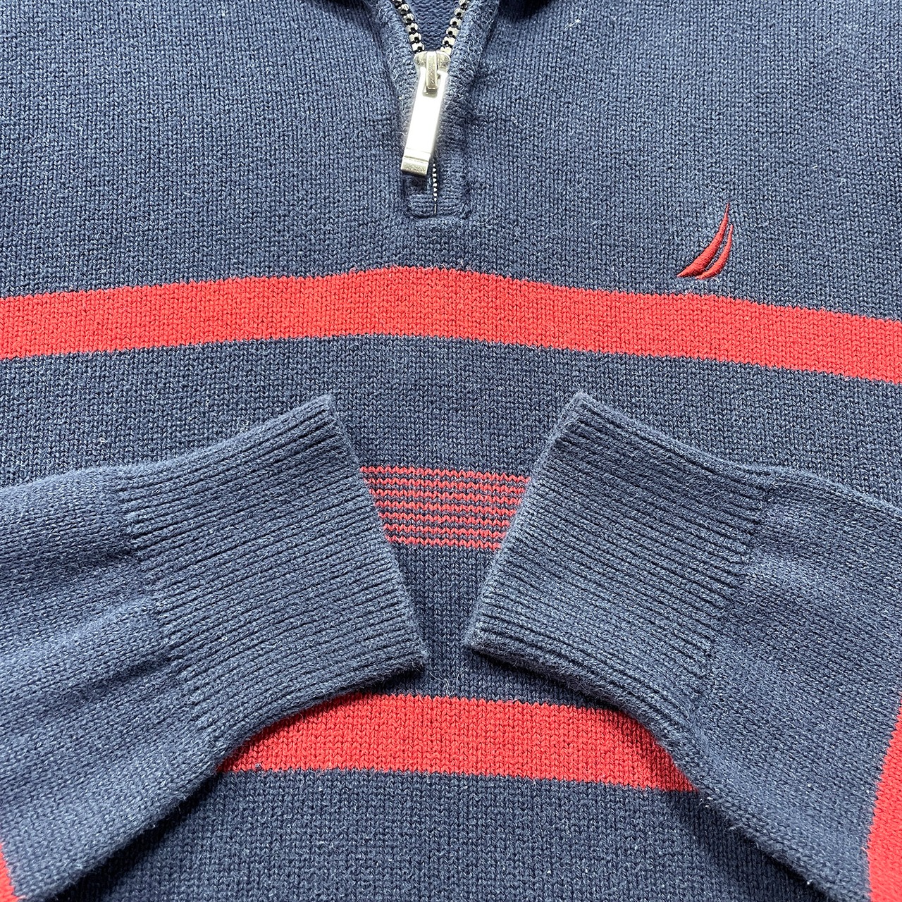 USA 古着 NAUTICA ノーティカ コットン ハーフジップ 薄地 ボーダー セーター ネイビー メンズS BJ1069