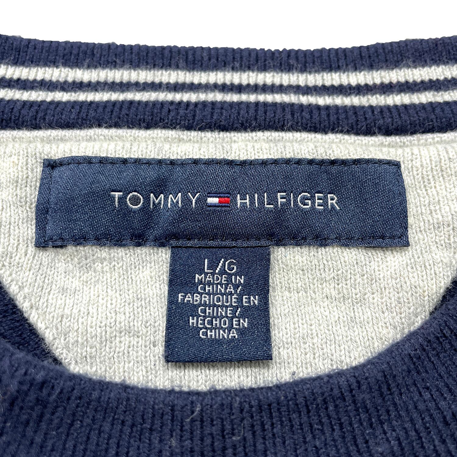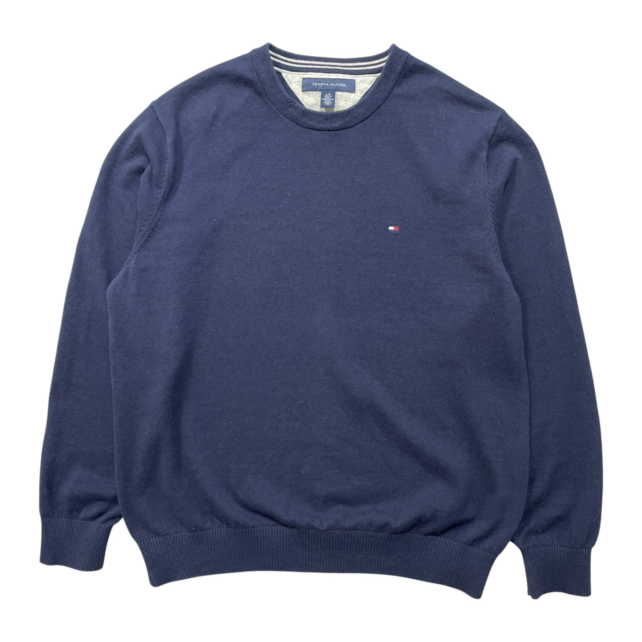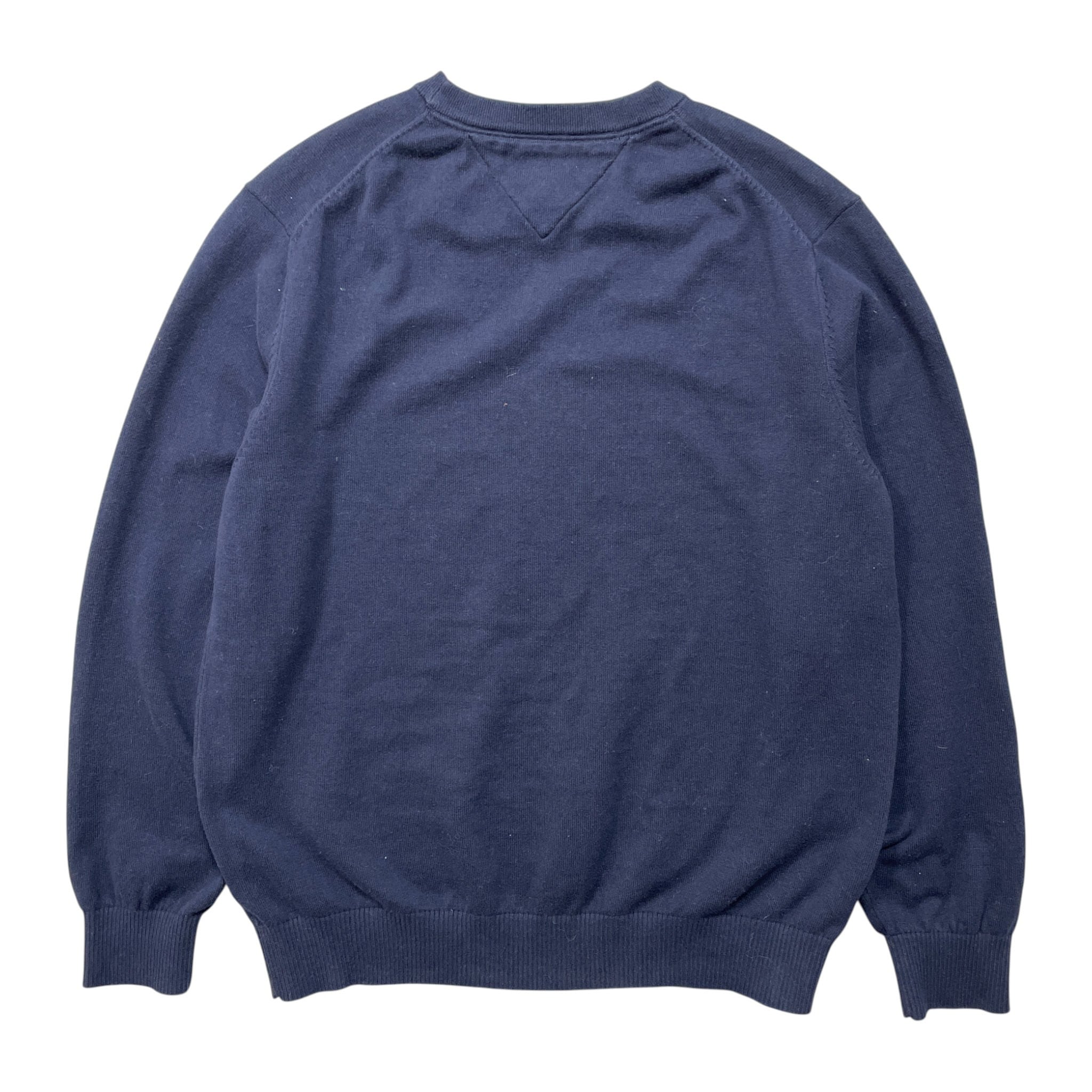 USA 古着 TOMMY HILFIGER トミーヒルフィガー コットン クルーネック 刺繍ロゴ 薄地 セーター ネイビー メンズL BJ1071