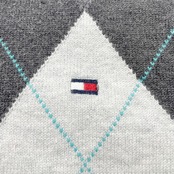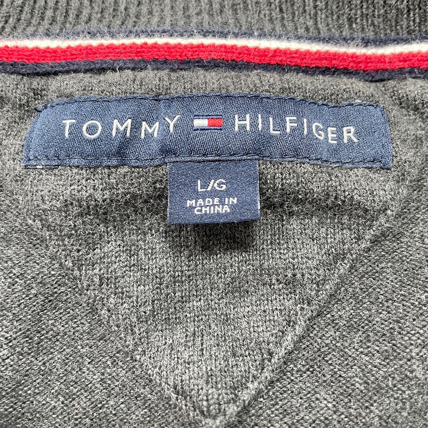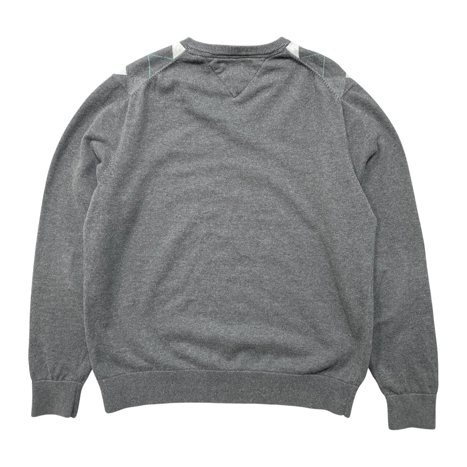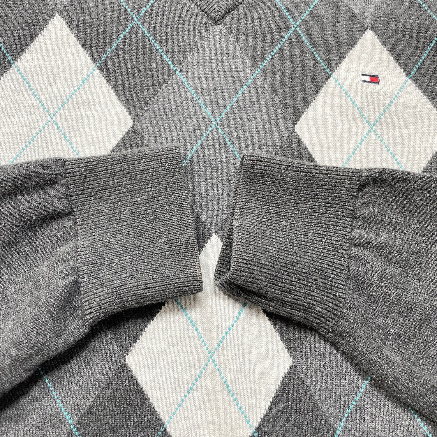 USA 古着 TOMMY HILFIGER トミーヒルフィガー コットン Vネック 刺繍ロゴ アーガイル柄 薄地 セーター メンズL チャコール BJ1073
