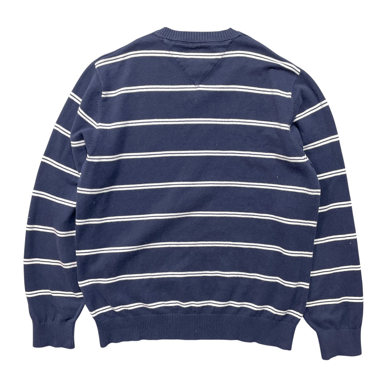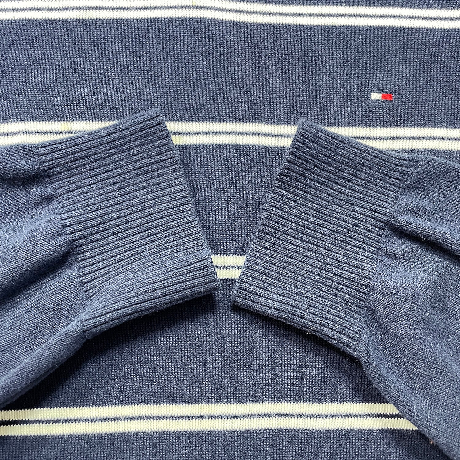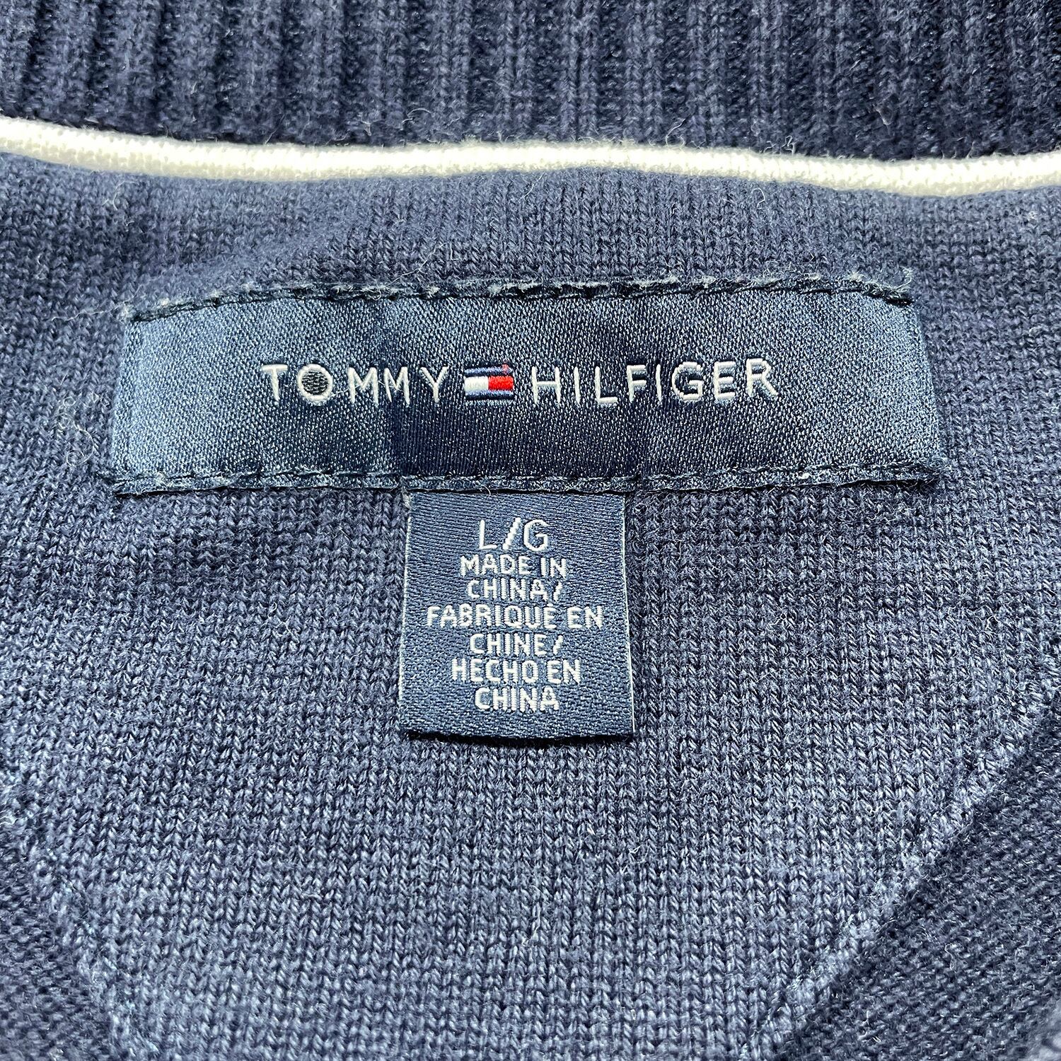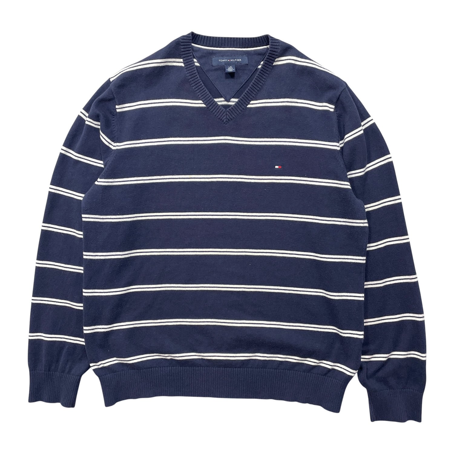USA 古着 TOMMY HILFIGER トミーヒルフィガー コットン Vネック 刺繍ロゴ ボーダー柄 薄地 セーター メンズL ネイビー BJ1075