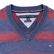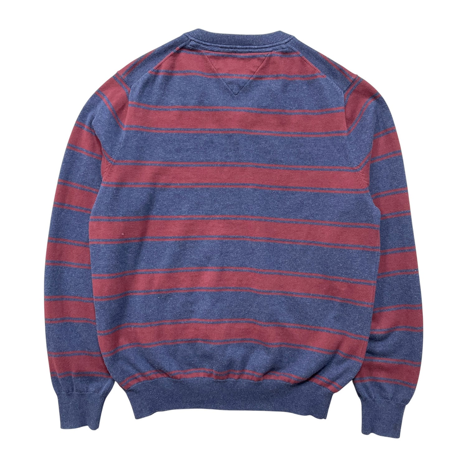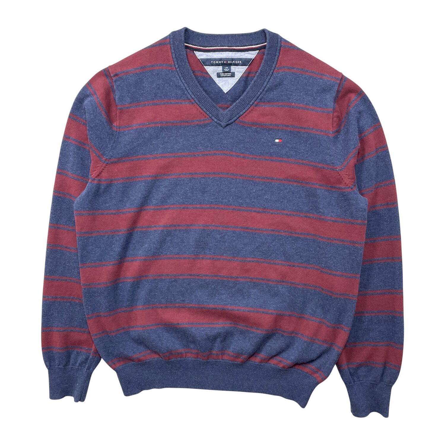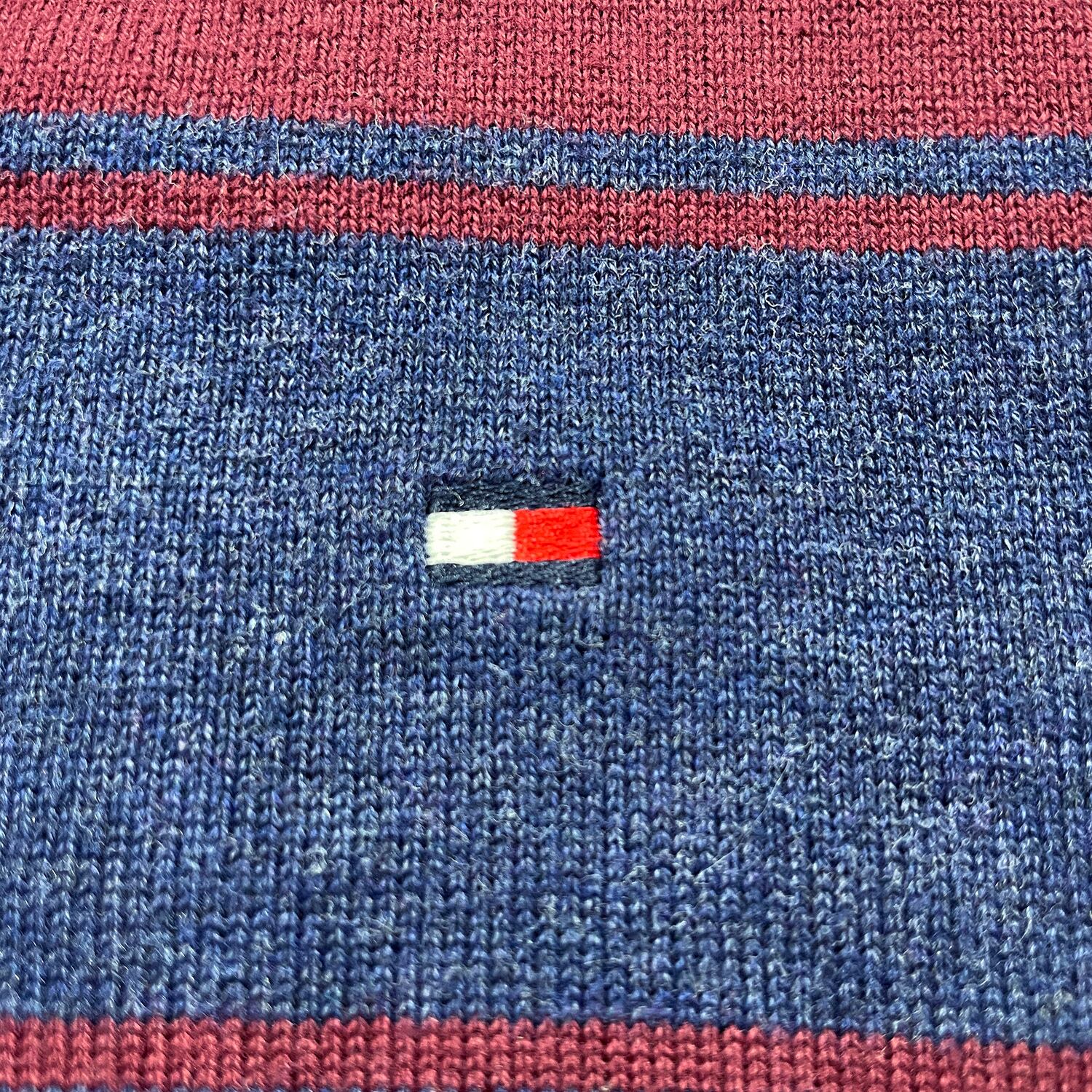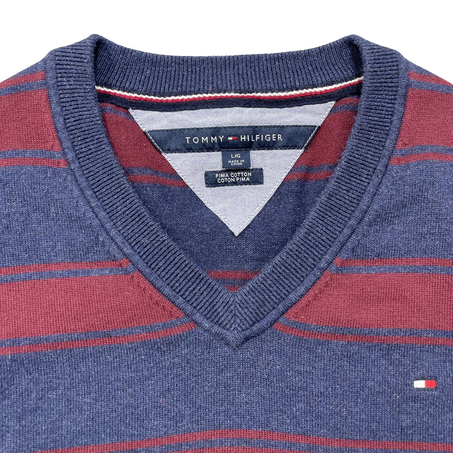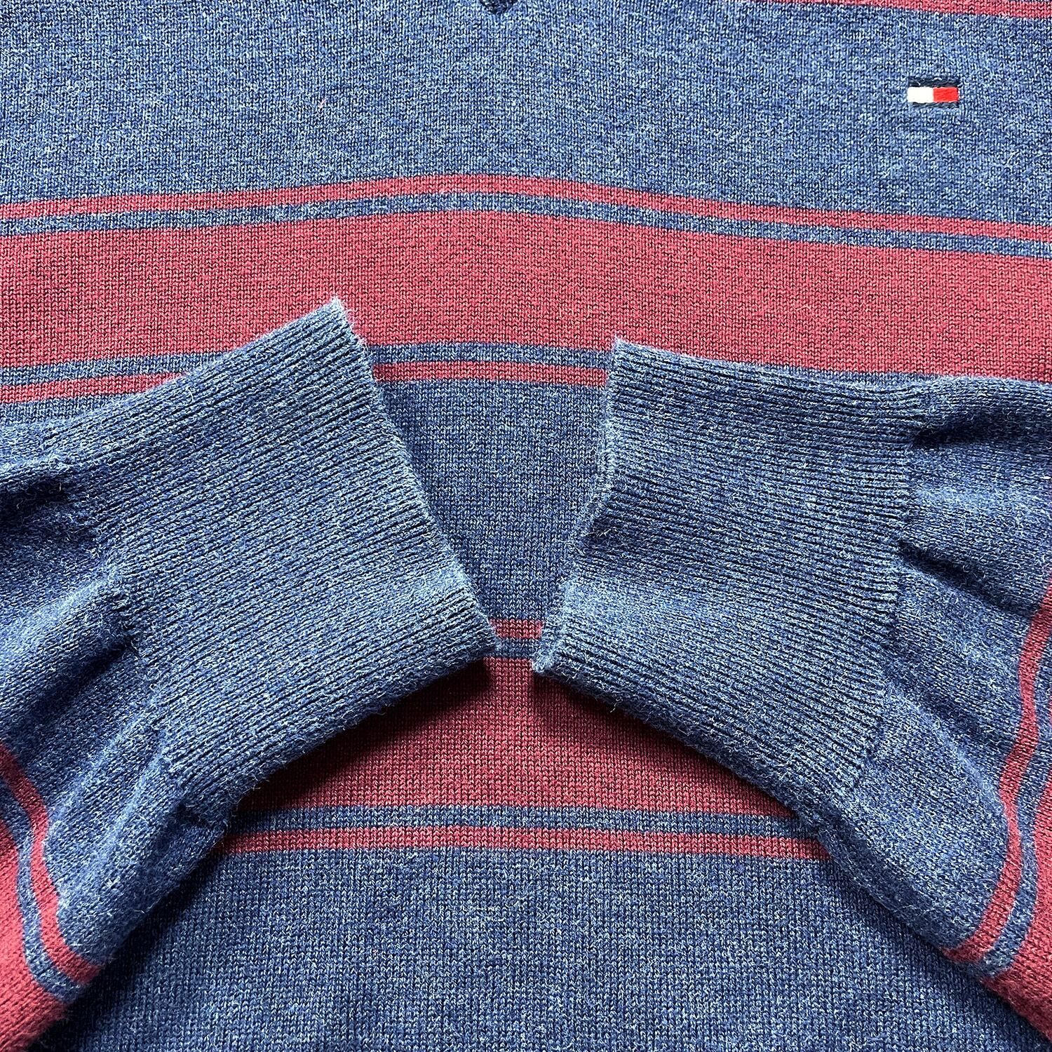 USA 古着 TOMMY HILFIGER トミーヒルフィガー ピマコットン Vネック 刺繍ロゴ ボーダー柄 薄地 セーター メンズL ネイビー BJ1076