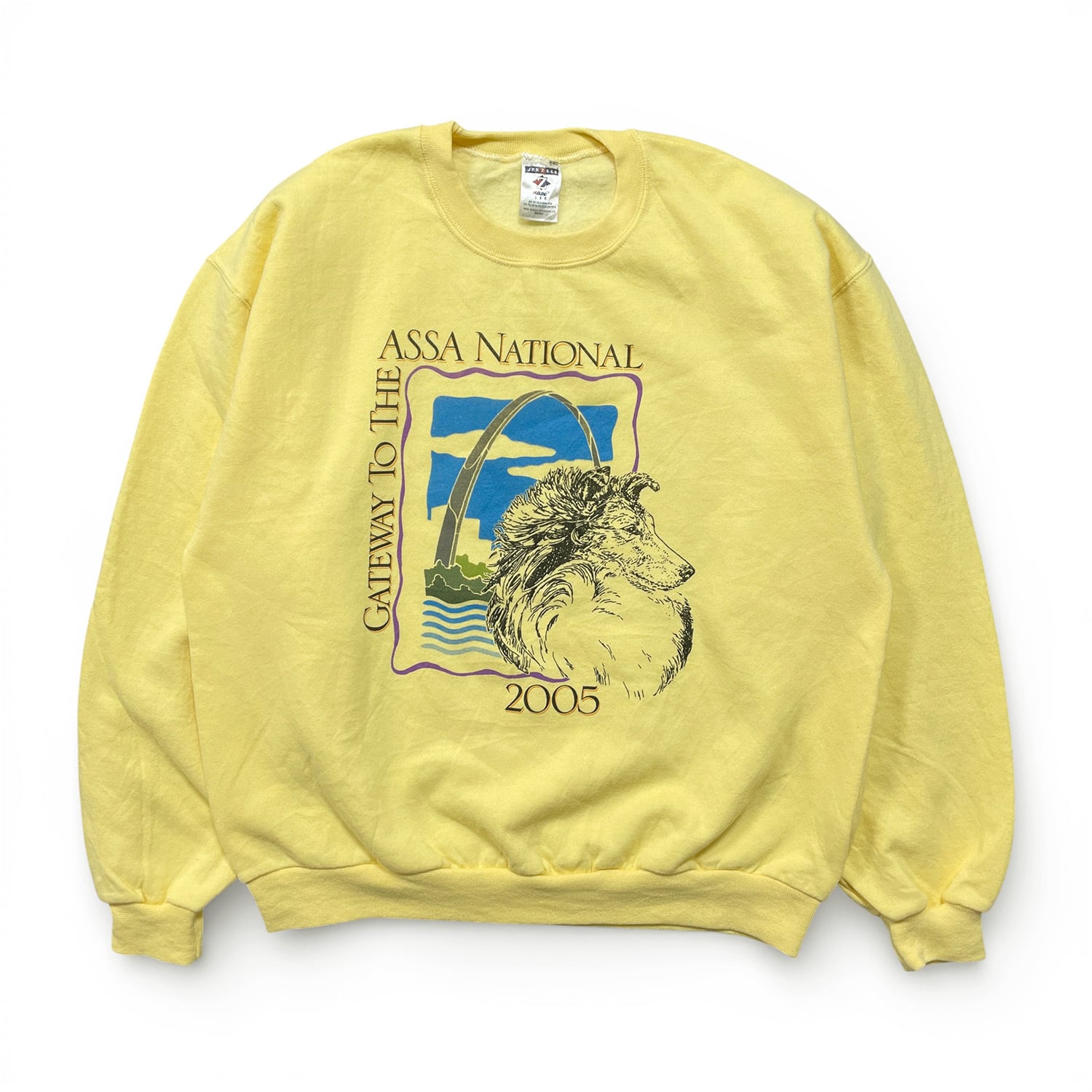 USA 古着 00S コリー犬 ヴィンテージ クルーネック スウェット トレーナー ドッグ プリント イエロー メンズL BD3466