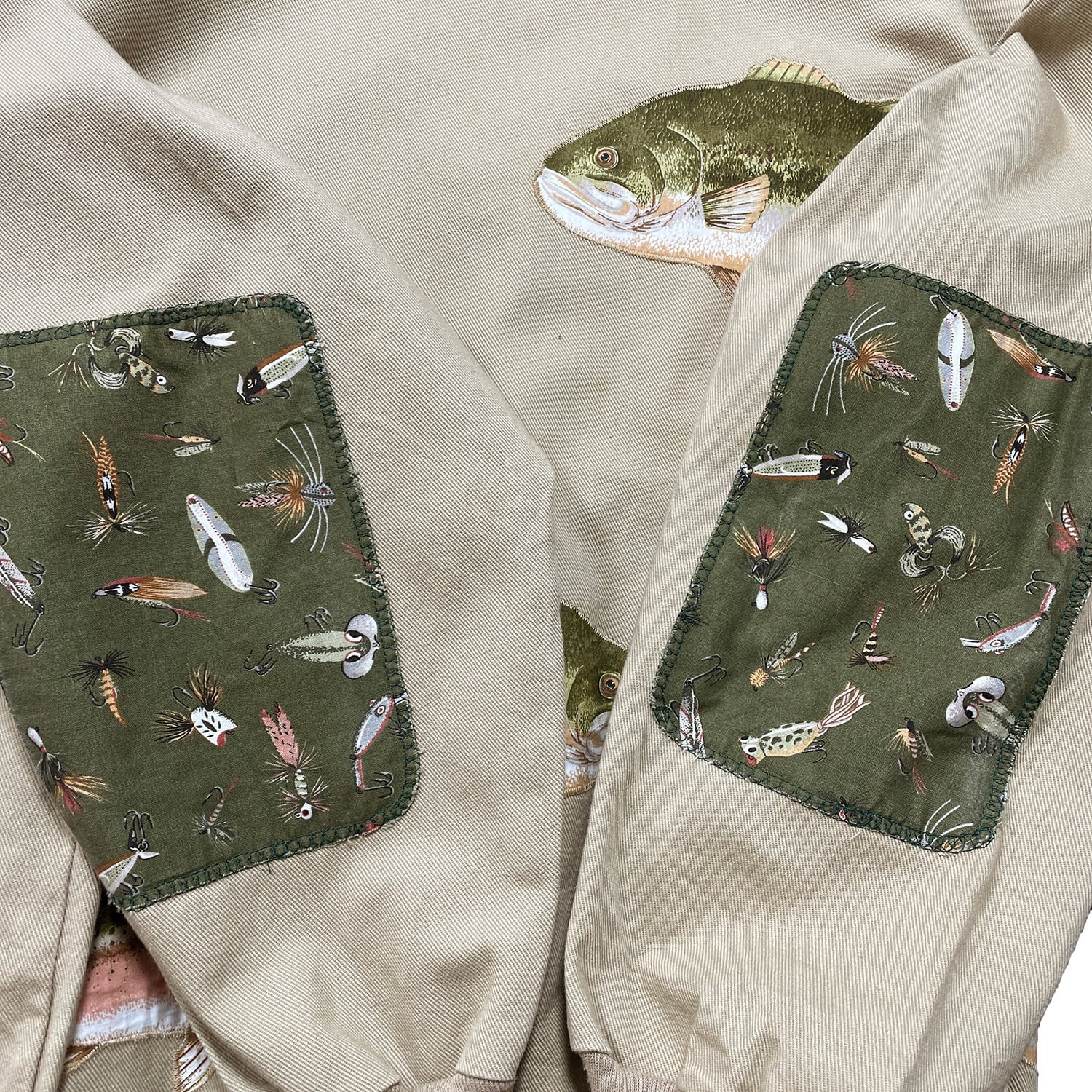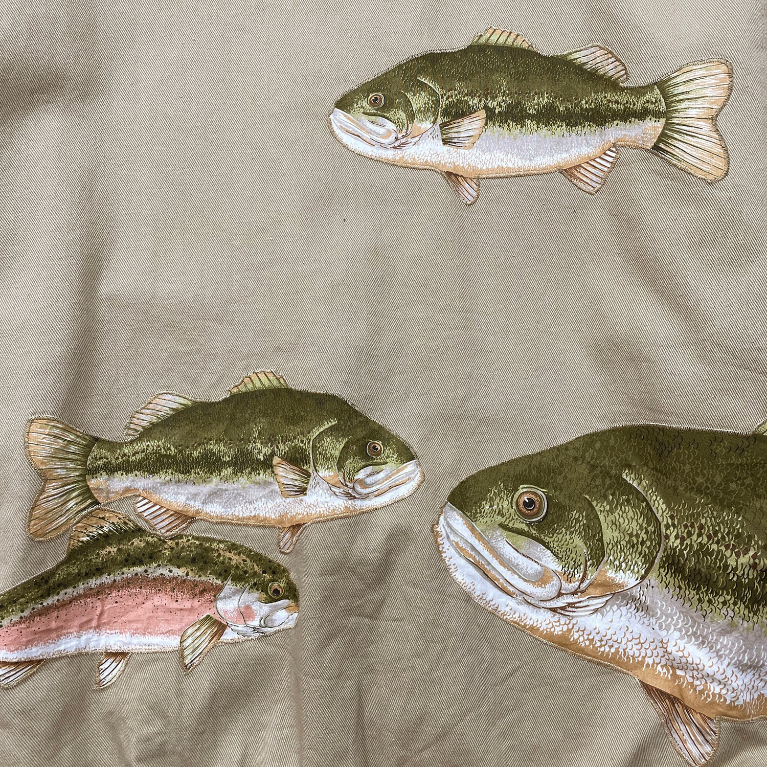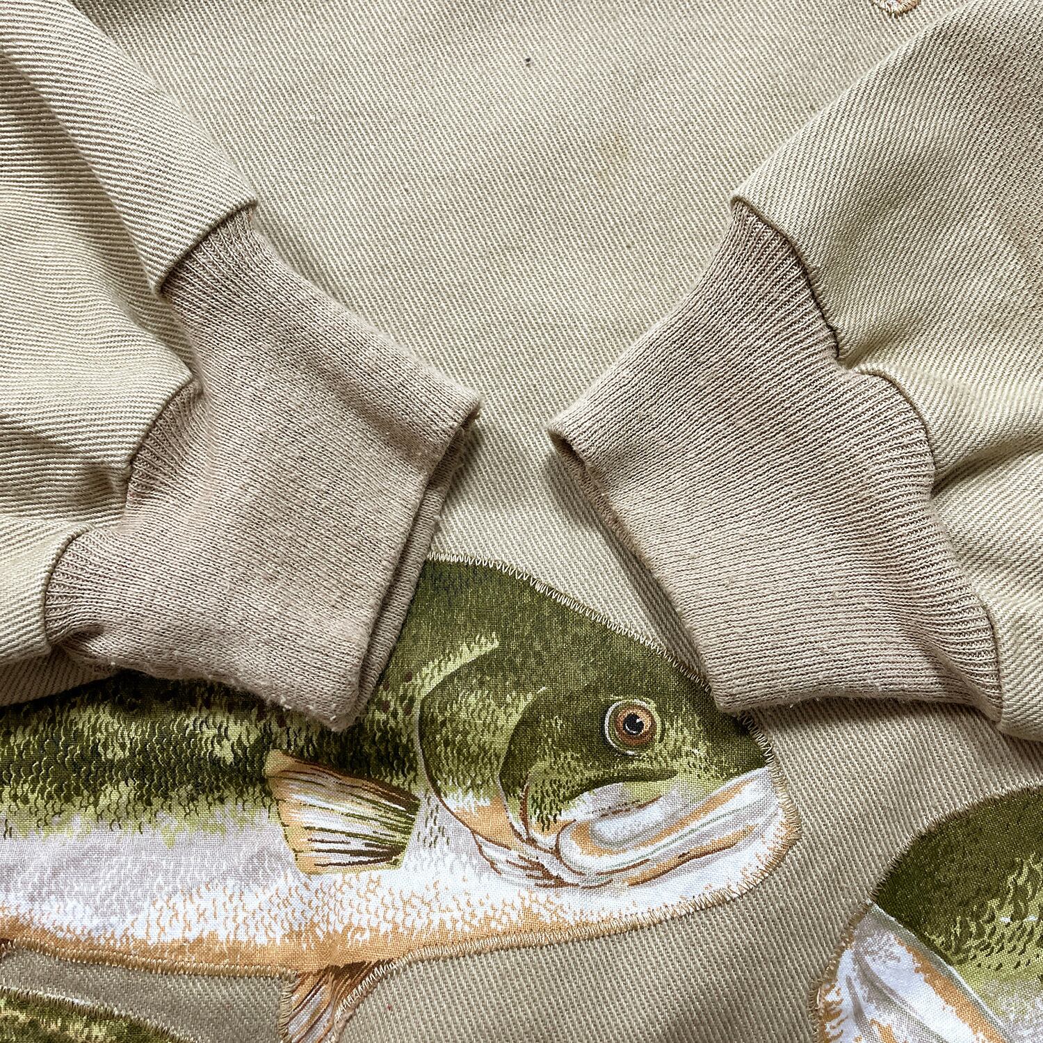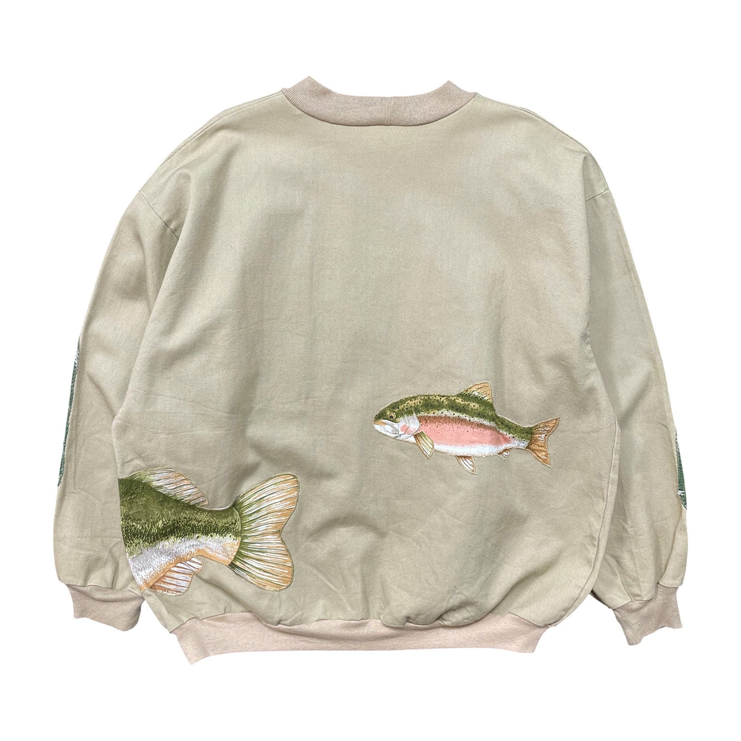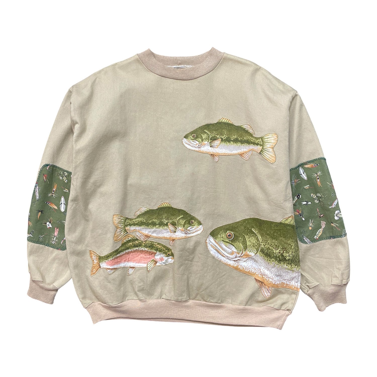 USA 古着 ヴィンテージ クルーネック スウェット トレーナー ブラックバス ニジマス ルアー ワッペン ベージュ メンズXL 程度 BD3420