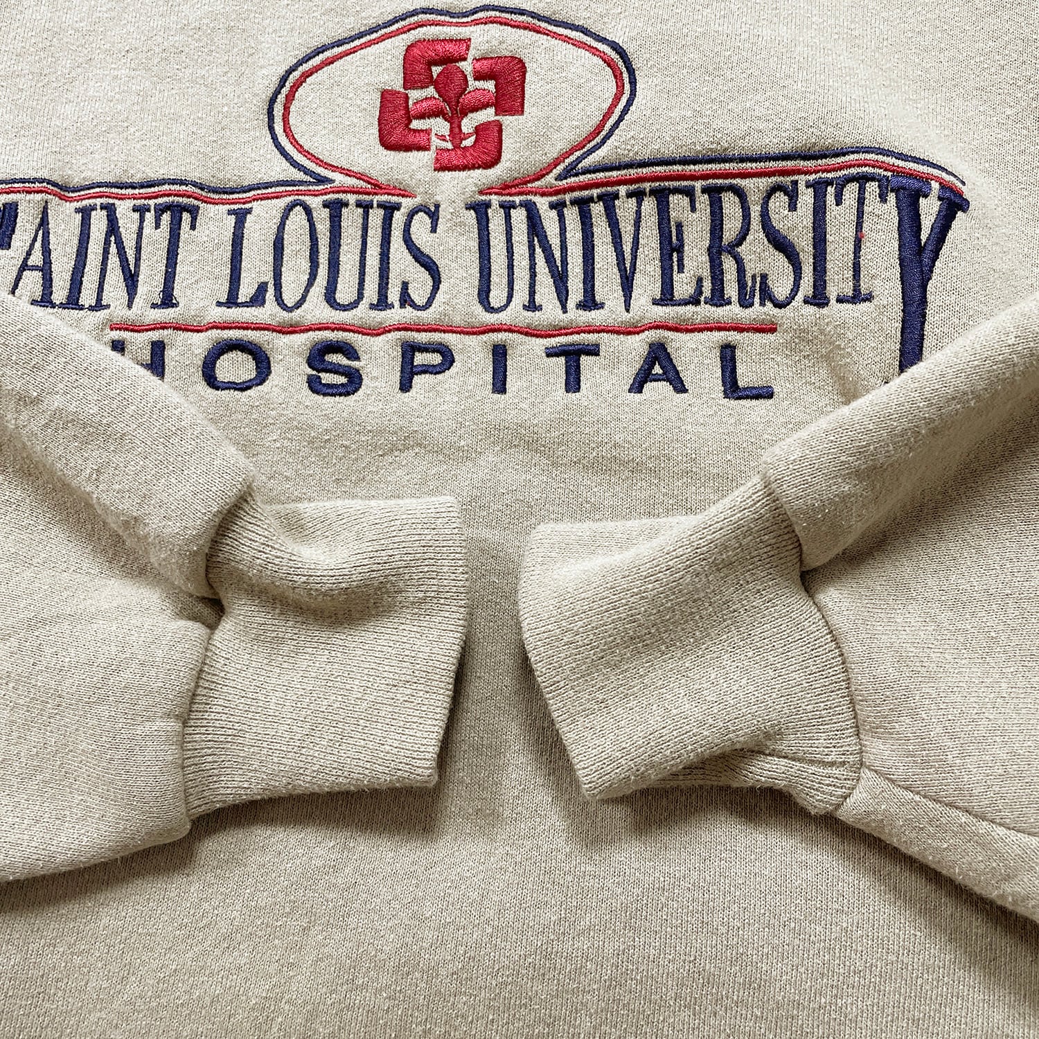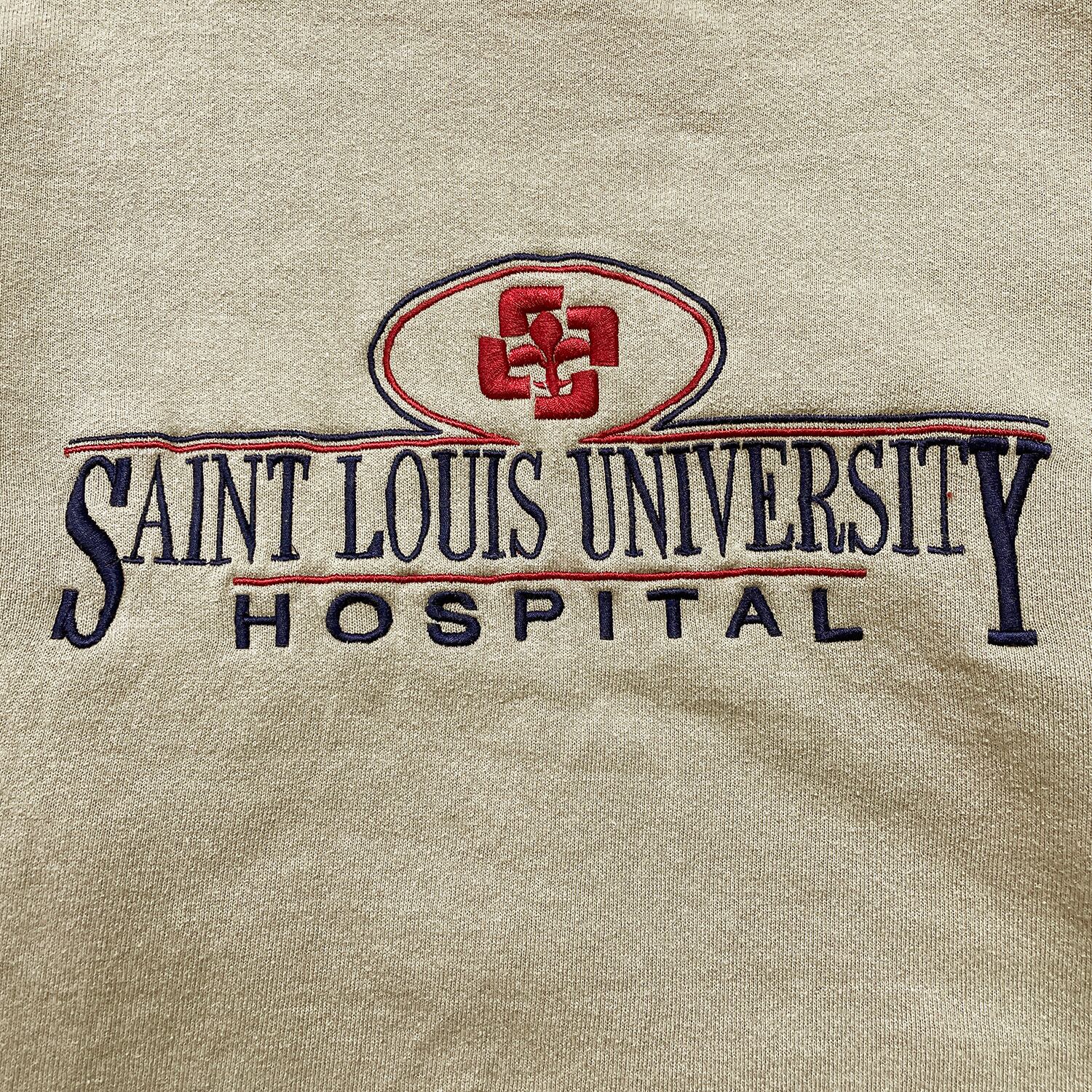 古着 USA製 90S セントルイス大学 カレッジ ヴィンテージ クルーネック スウェット トレーナー 刺繍 ベージュ メンズM BD3474