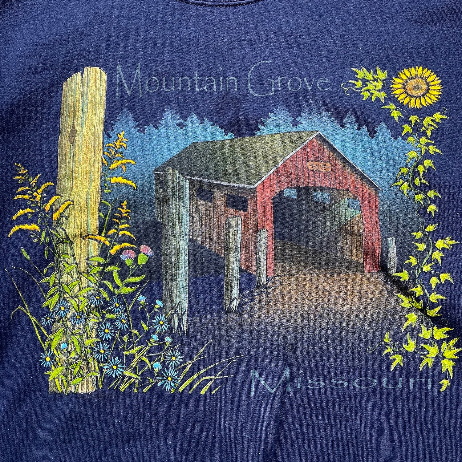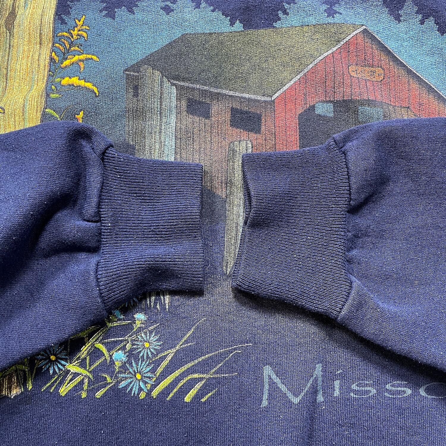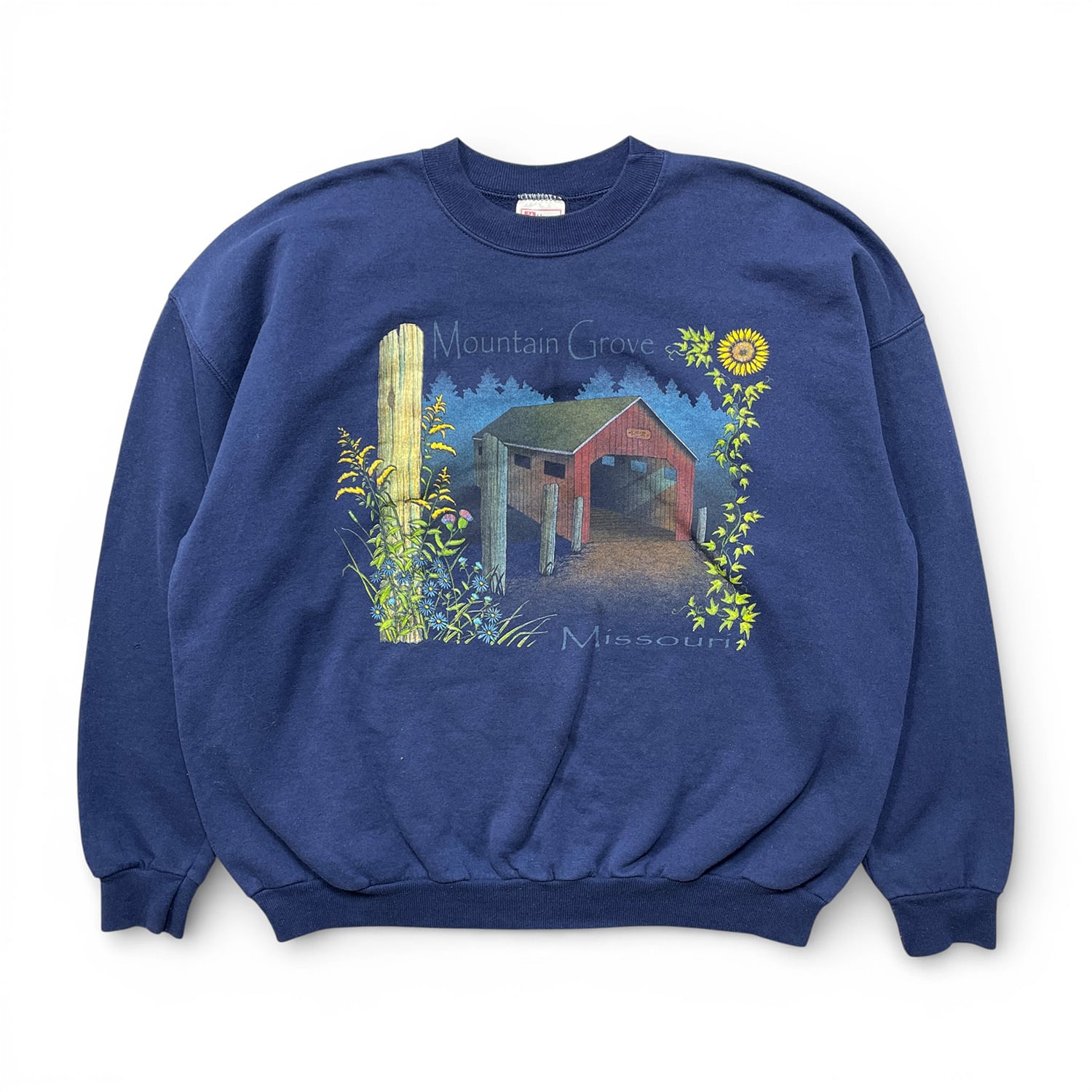 USA 古着 アート 「ひまわりと赤い納屋のある風景」 クルーネック スウェット トレーナー プリント メンズXL BD3484