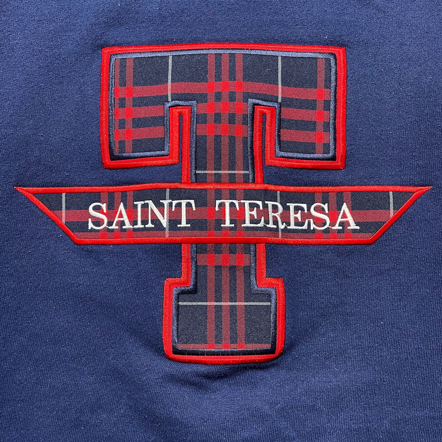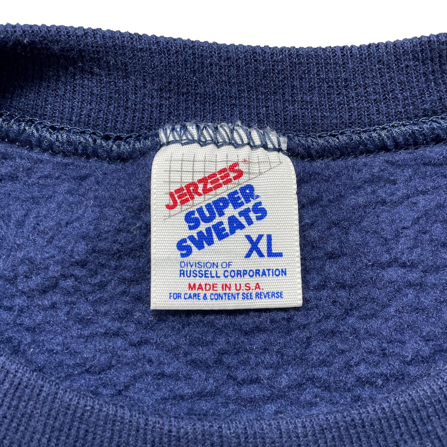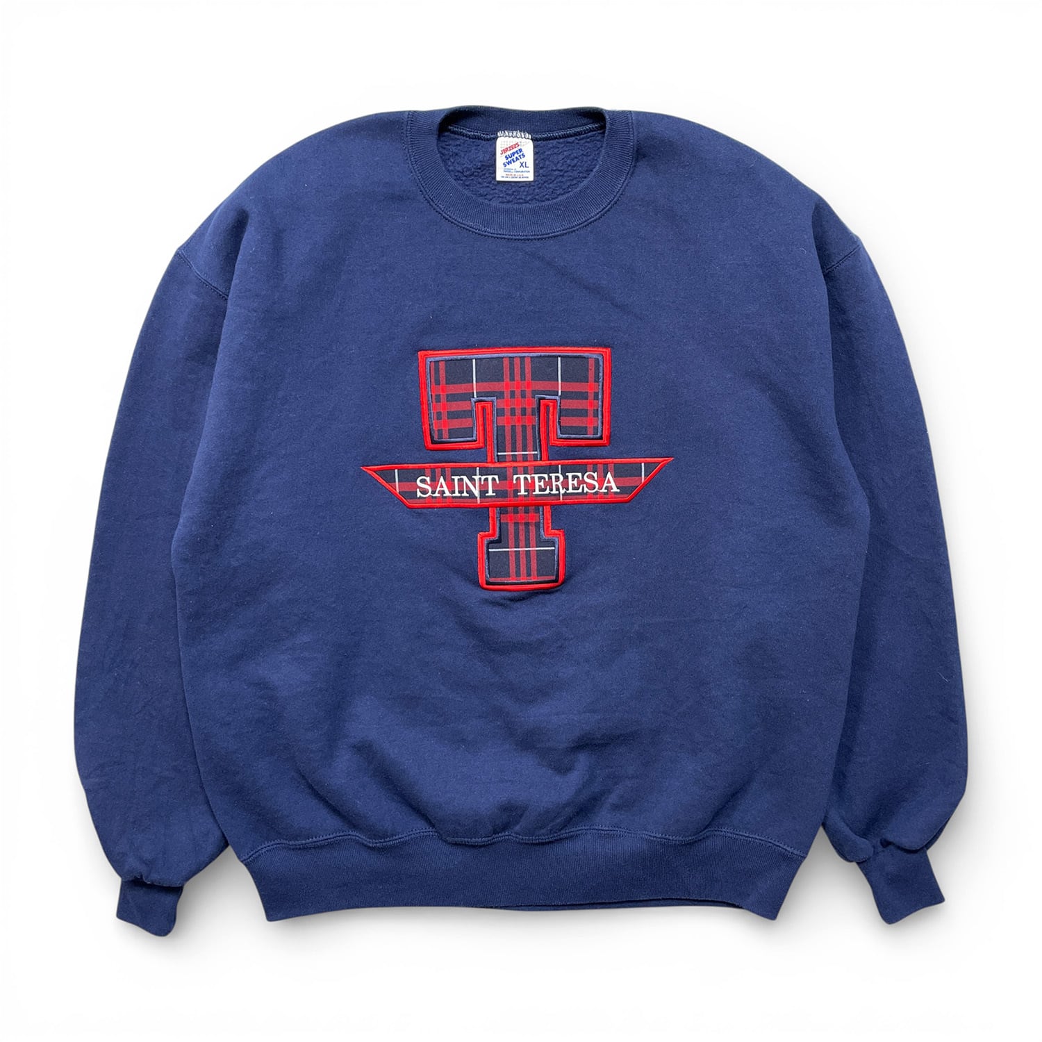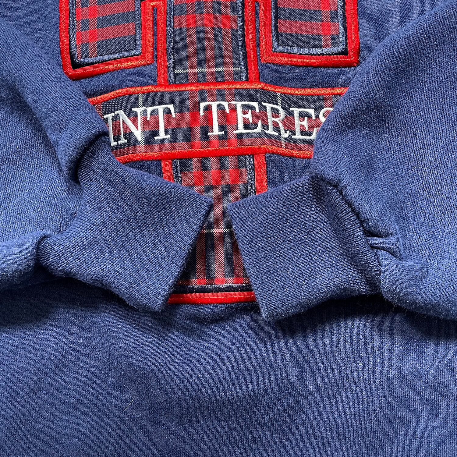 古着 USA製 90S カトリック教会 聖テレサ ヴィンテージ クルーネック スウェット トレーナー タータンチェック 刺繍 ネイビー メンズXL BD3487