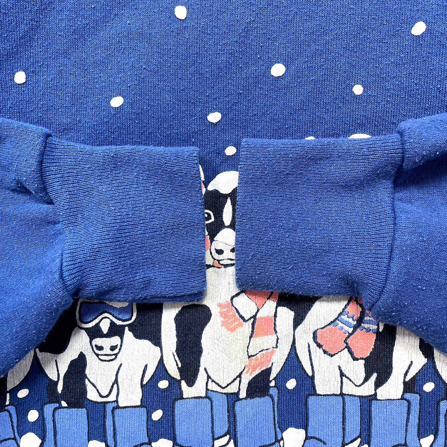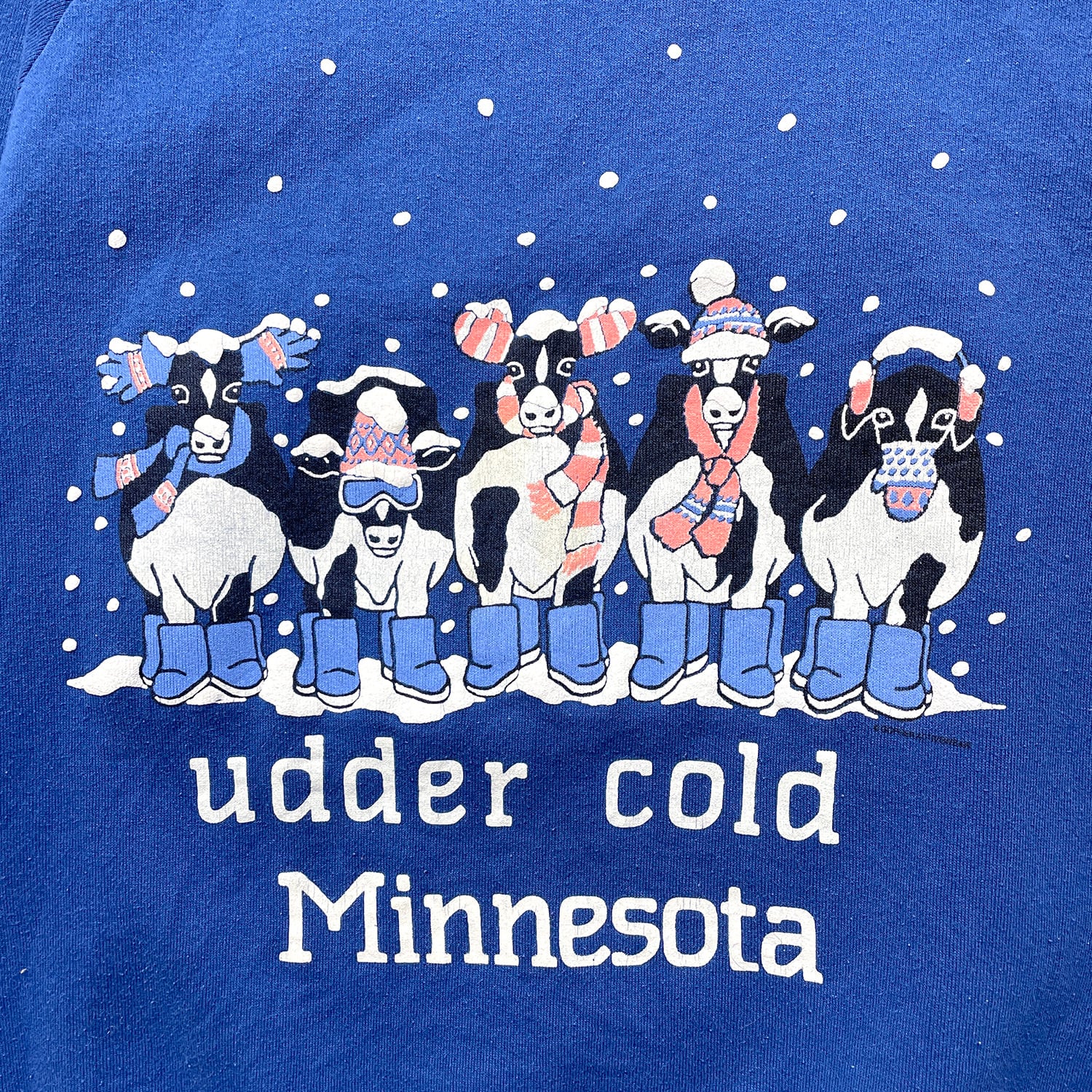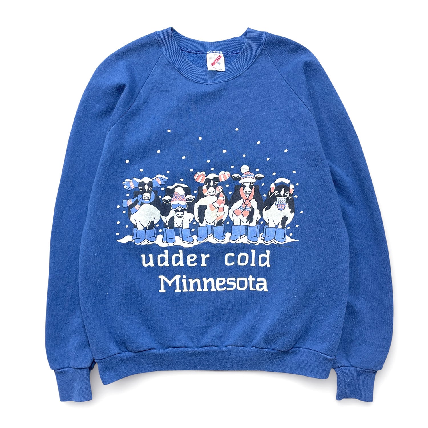 古着 USA製 90S ヴィンテージ 「乳房も凍るほど寒いミネソタ」 スウェット トレーナー アニマル プリント メンズXL ブルー BD3569
