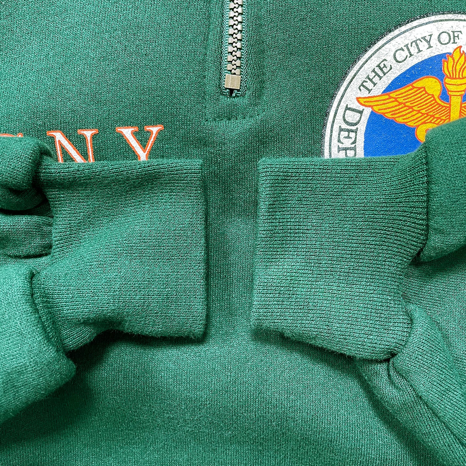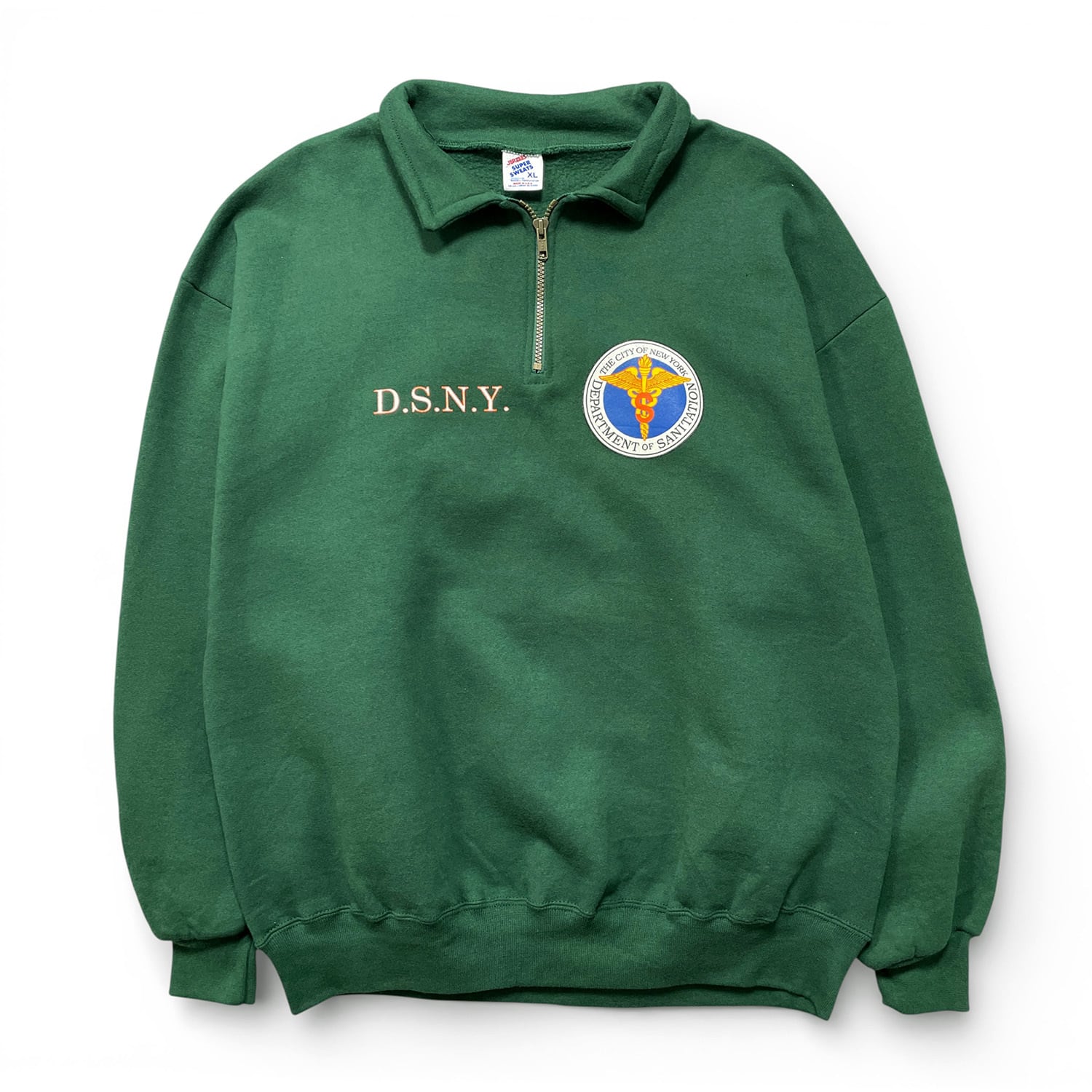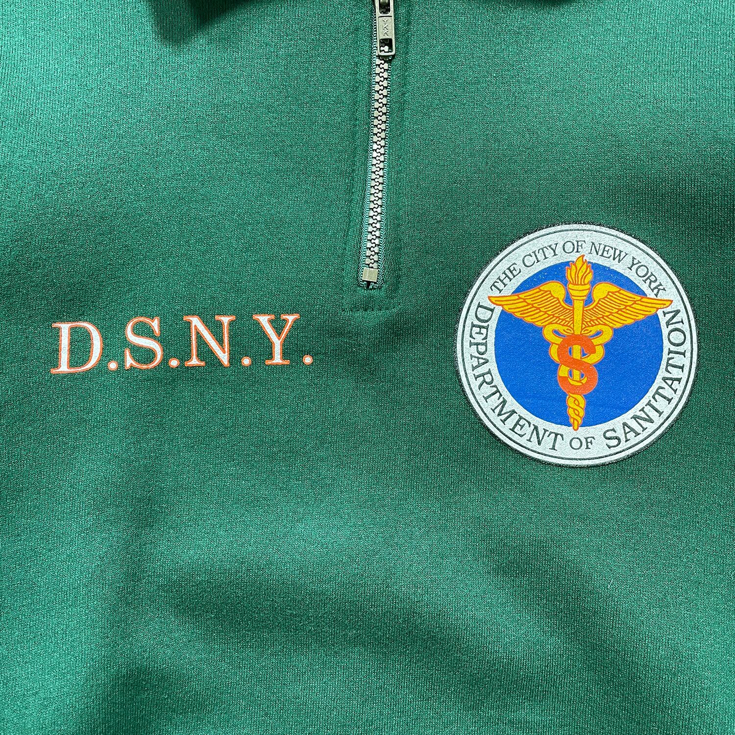 古着 USA製 90S JERZEES ジャージーズ DSNY ニューヨーク市衛生局 ハーフジップ スウェット トレーナー プリント メンズXL グリーン BD3560