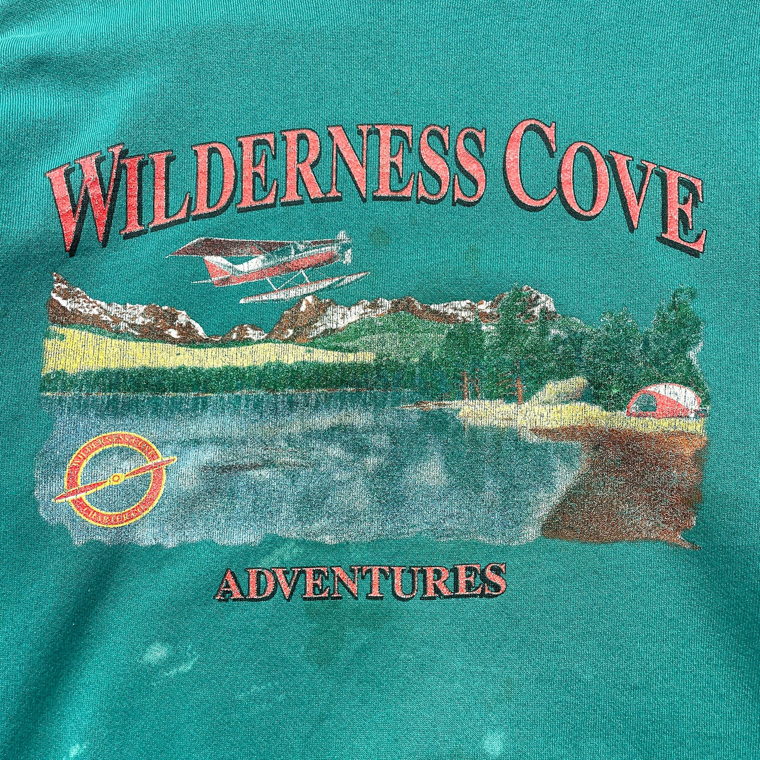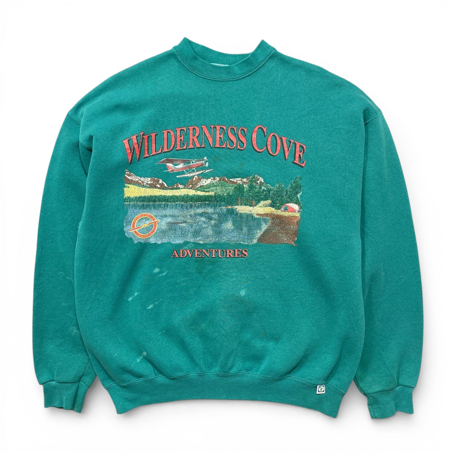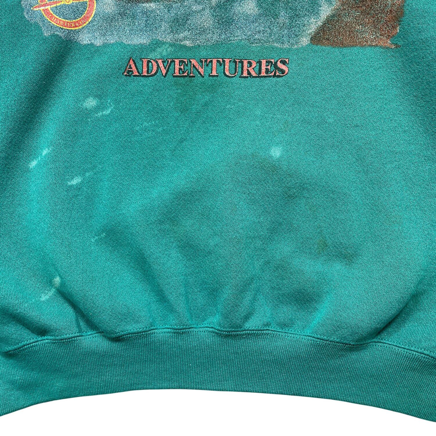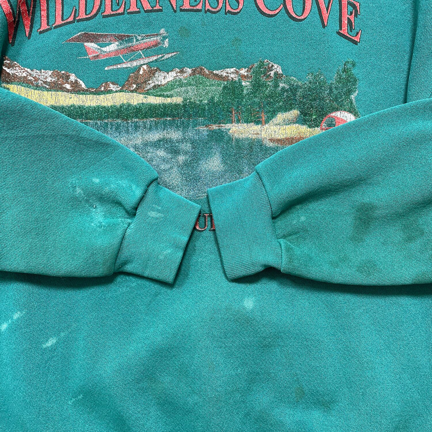 古着 USA製 90S DISCUS ATHLETIC ウィルダネスコーブアドベンチャー ヴィンテージ クルーネック スウェット トレーナー プリント メンズL エメラルドグリーン BD3617