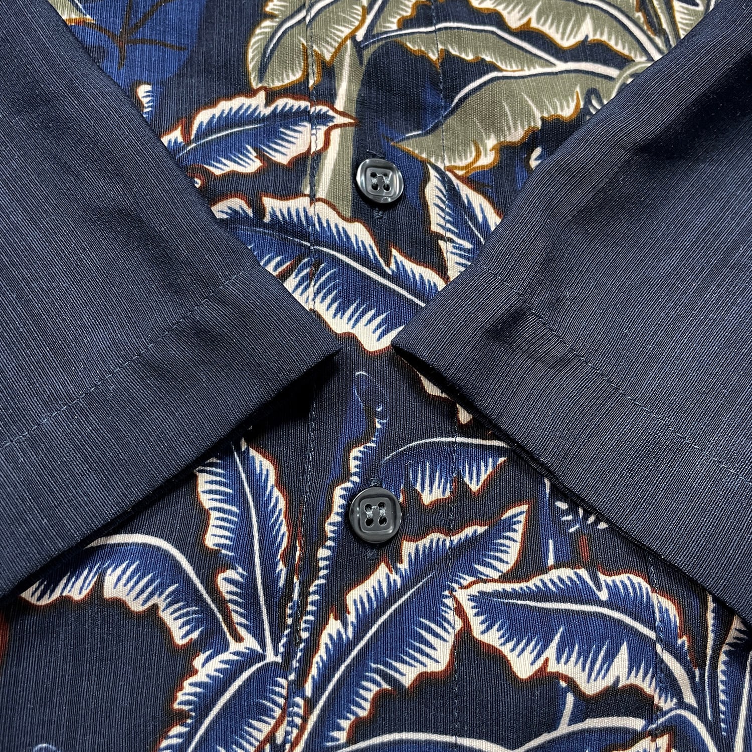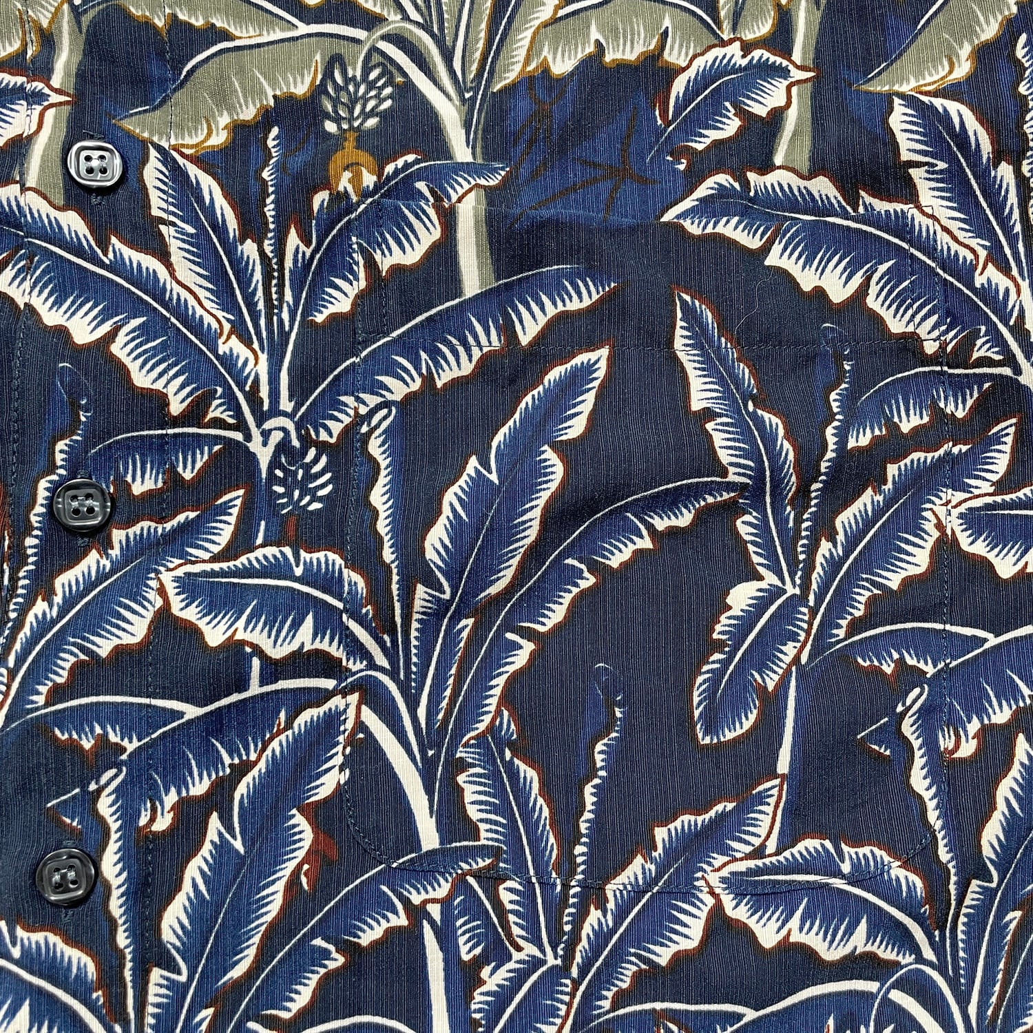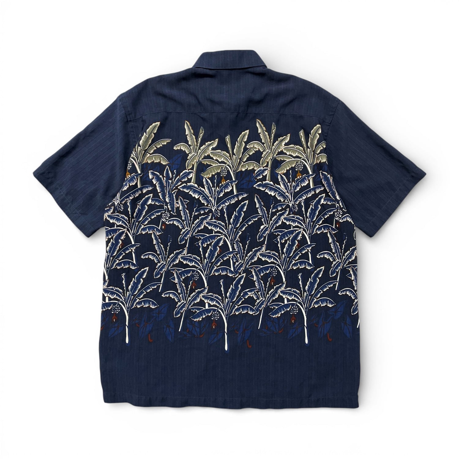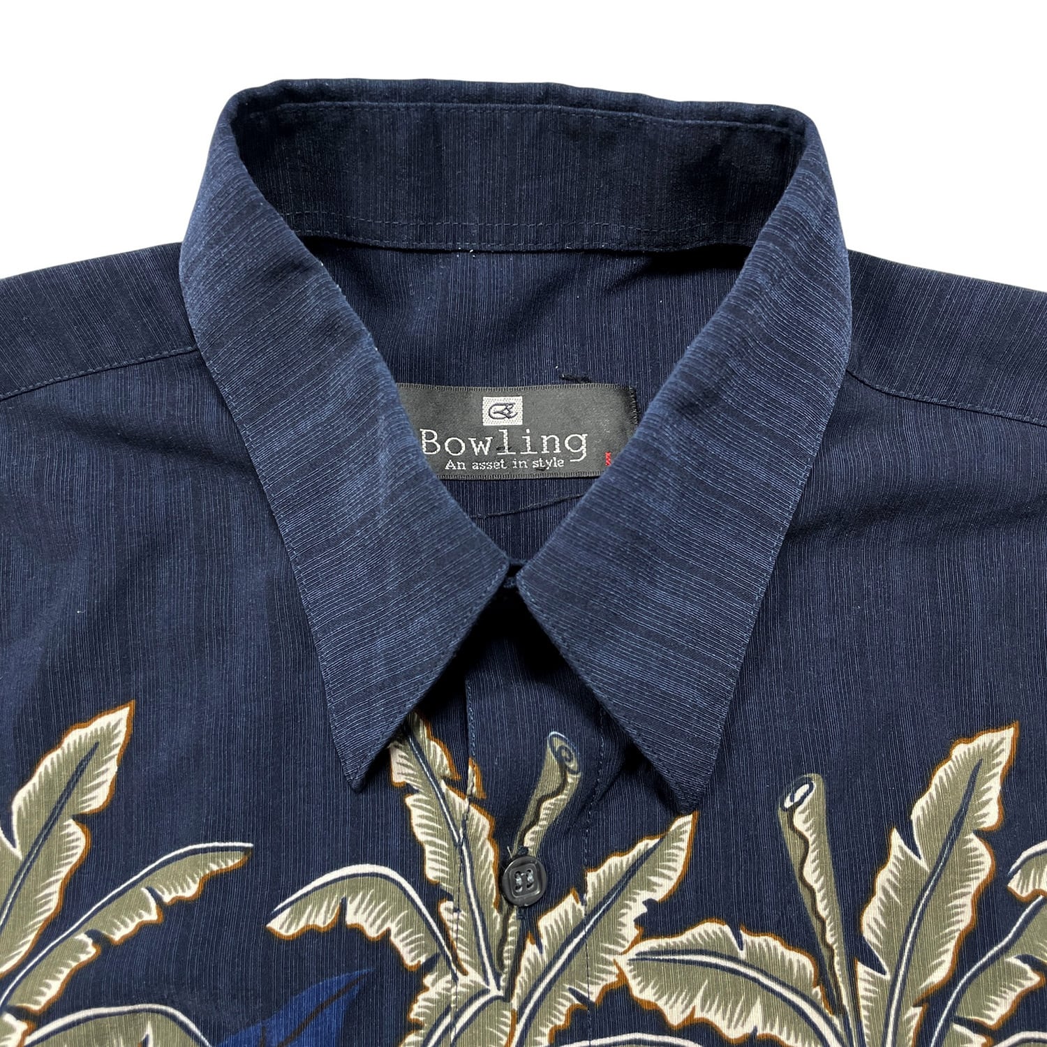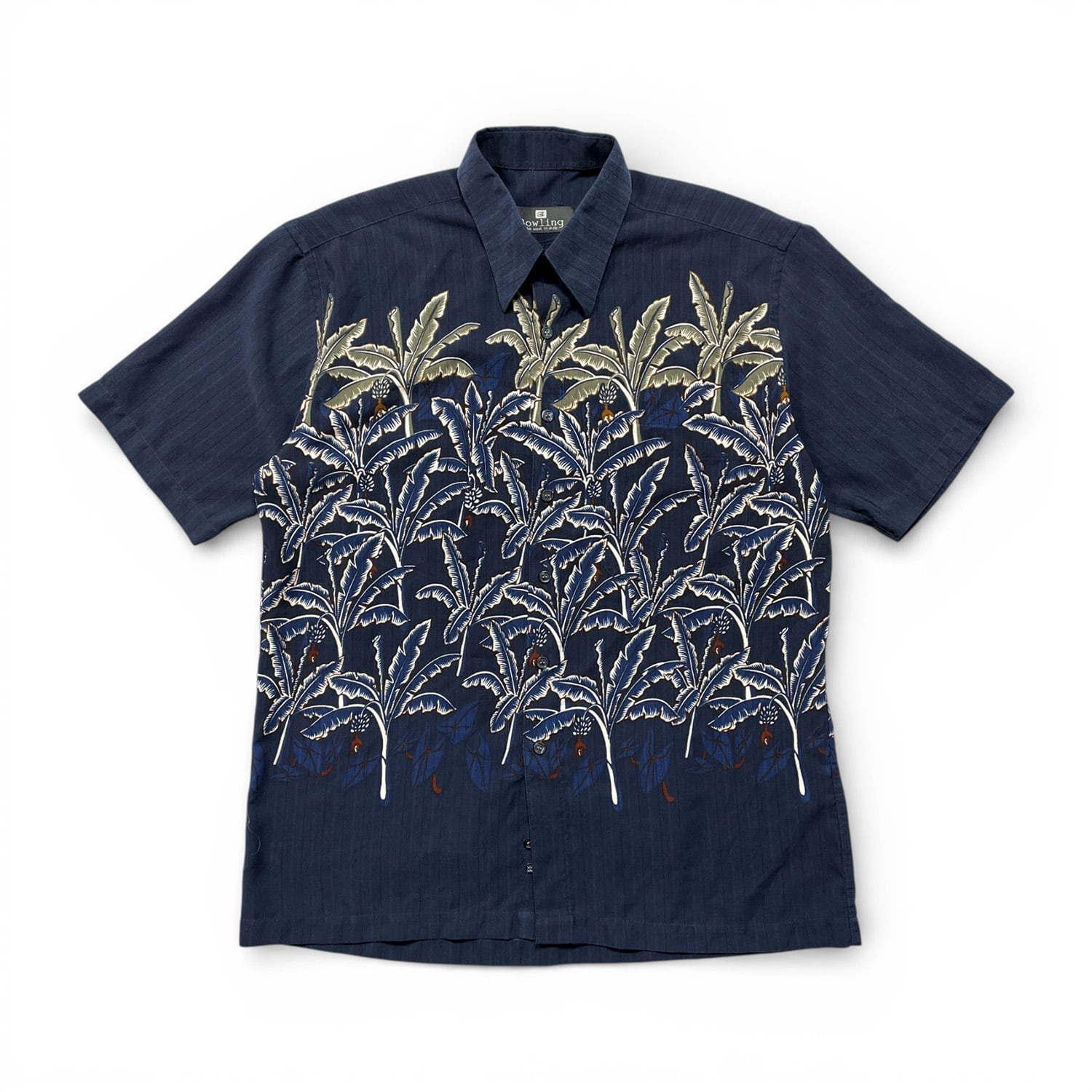 USA 古着 Bowling ヴィンテージ シルク ハワイアンシャツ アロハシャツ リーフ柄 メンズL ネイビー BF3867