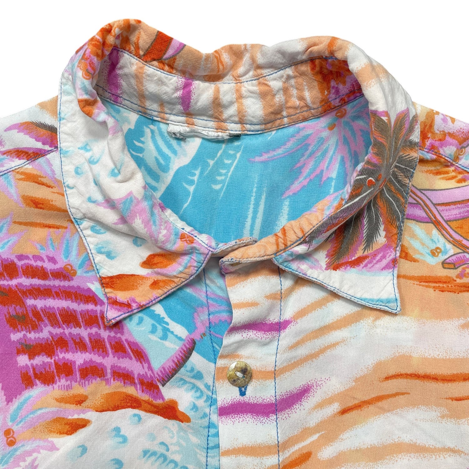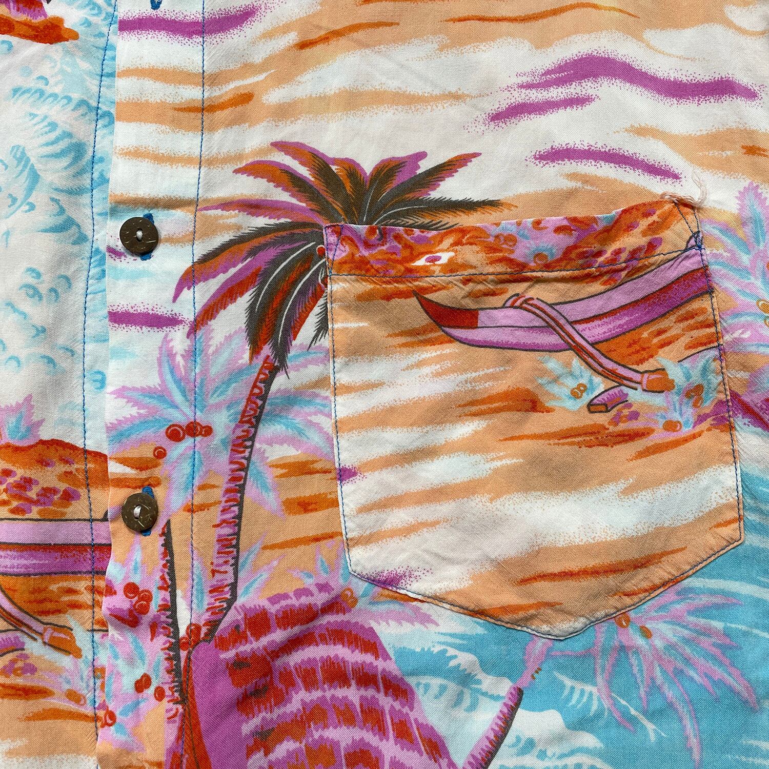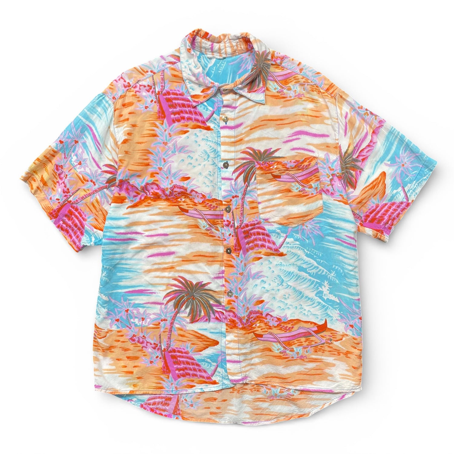 USA 古着 アロハシャツ ハワイアンシャツ レーヨン パームツリー カヌー柄 メンズL/XL 程度 オレンジ ピンク BF3923