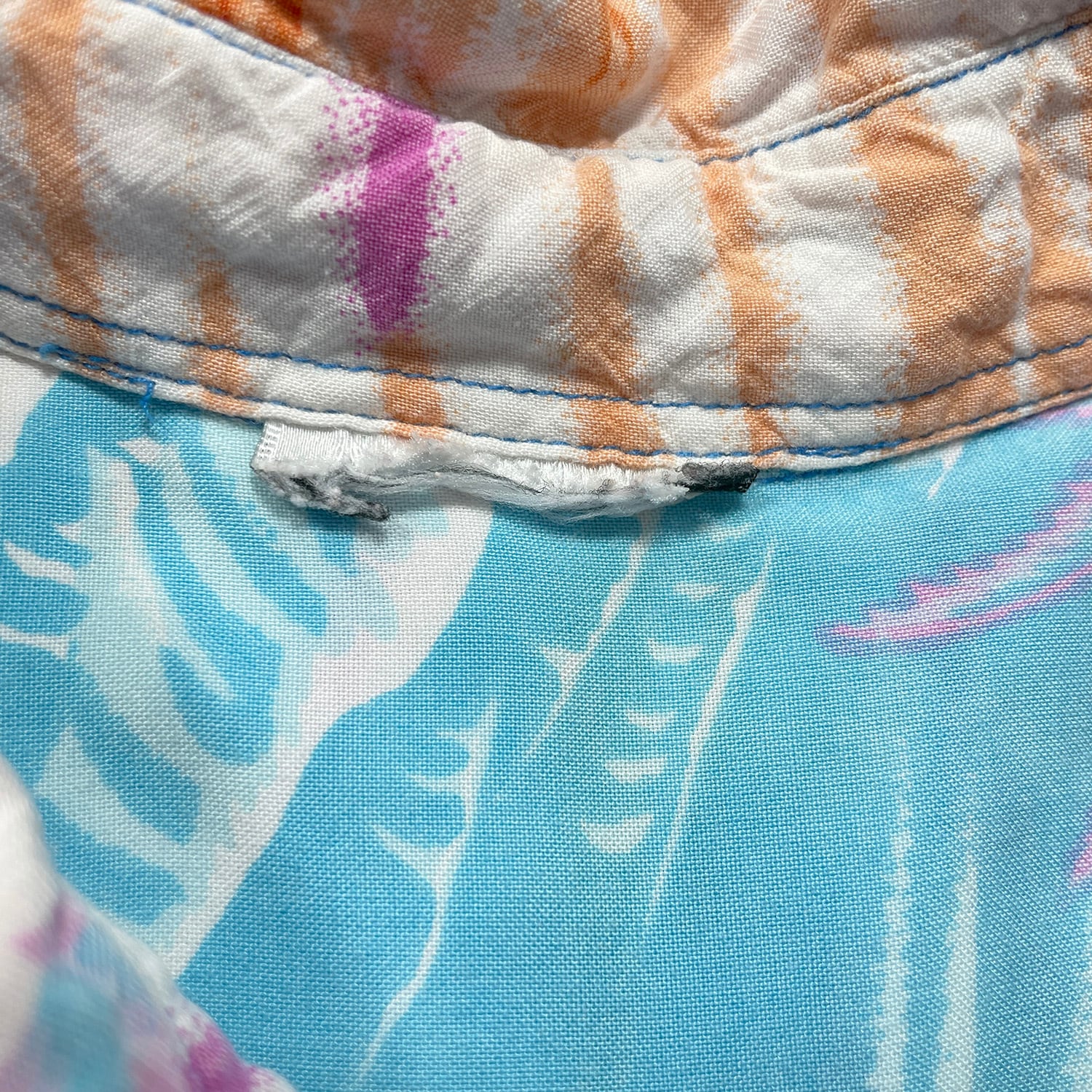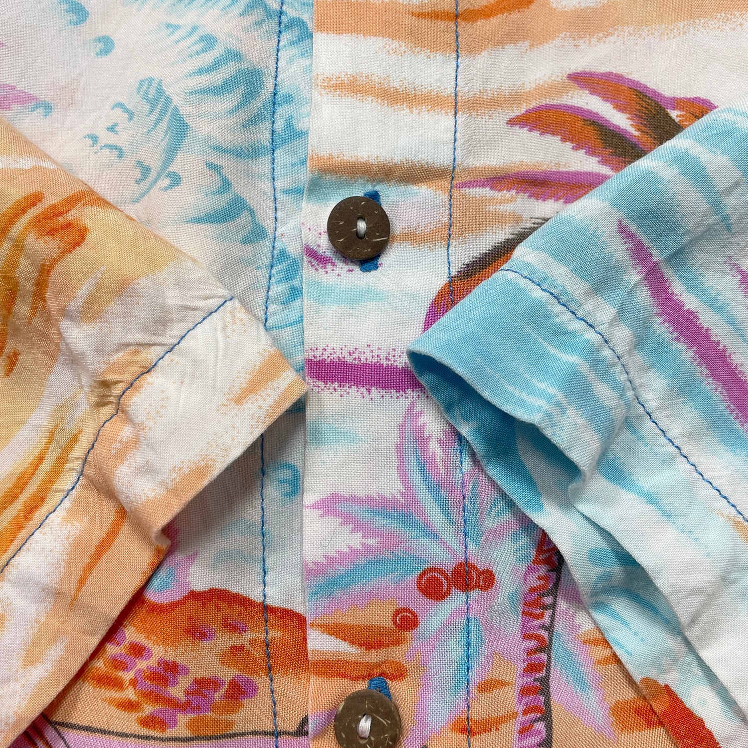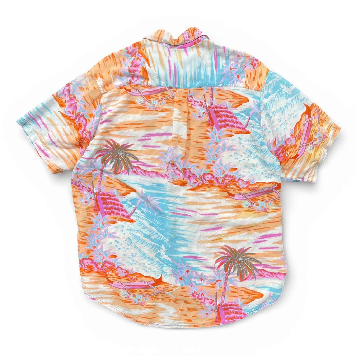 USA 古着 アロハシャツ ハワイアンシャツ レーヨン パームツリー カヌー柄 メンズL/XL 程度 オレンジ ピンク BF3923