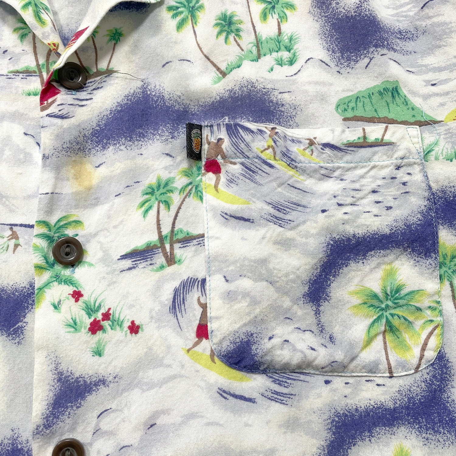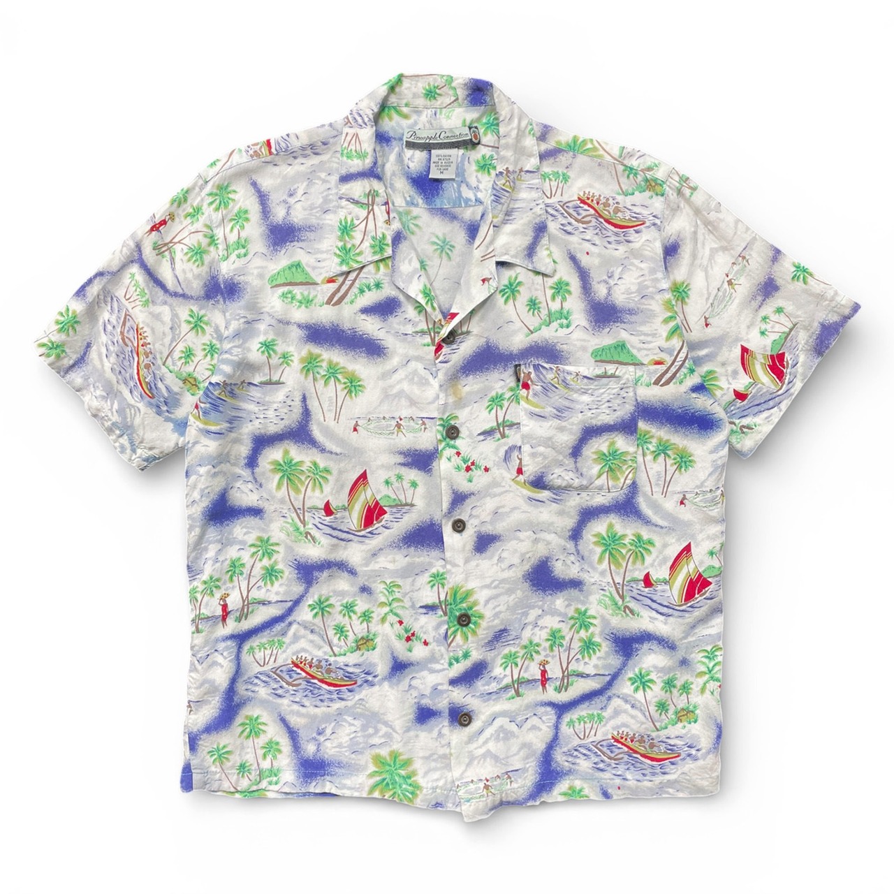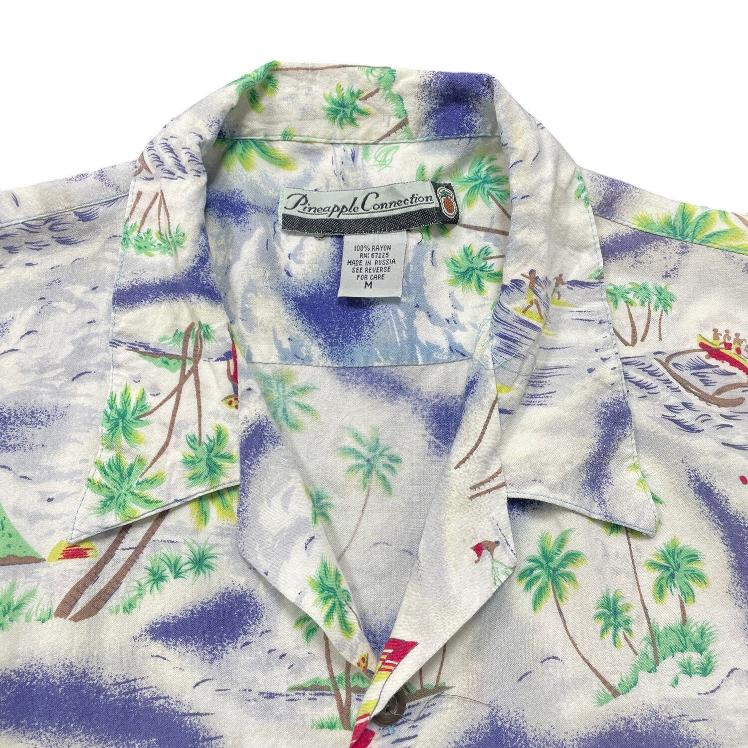 USA 古着 Pineapple Connection パイナップルコネクション レーヨン 開襟 アロハシャツ ハワイアンシャツ 総柄 サーフィン柄 メンズM ホワイト BF3927