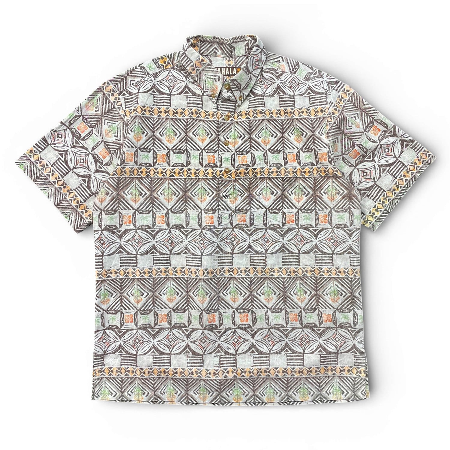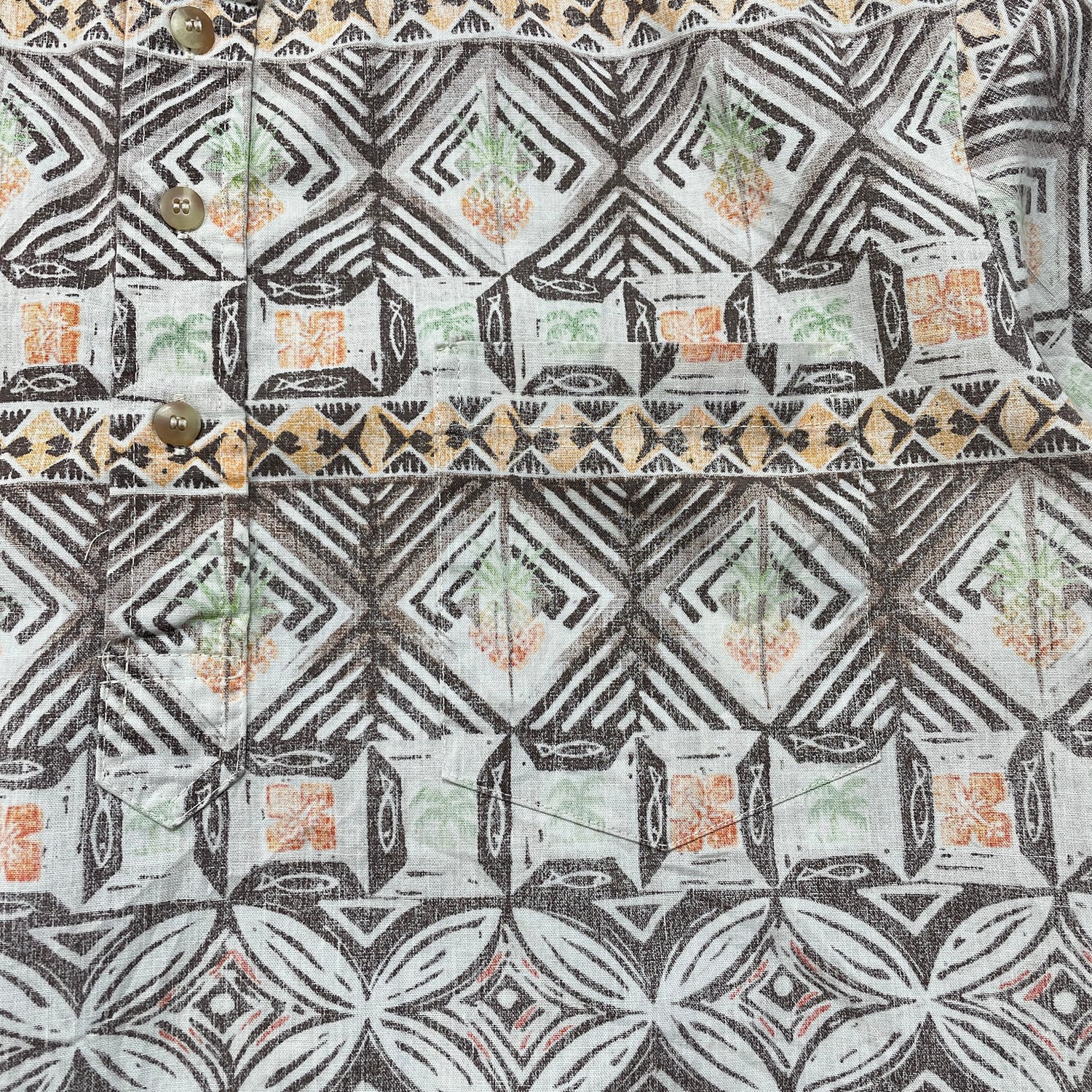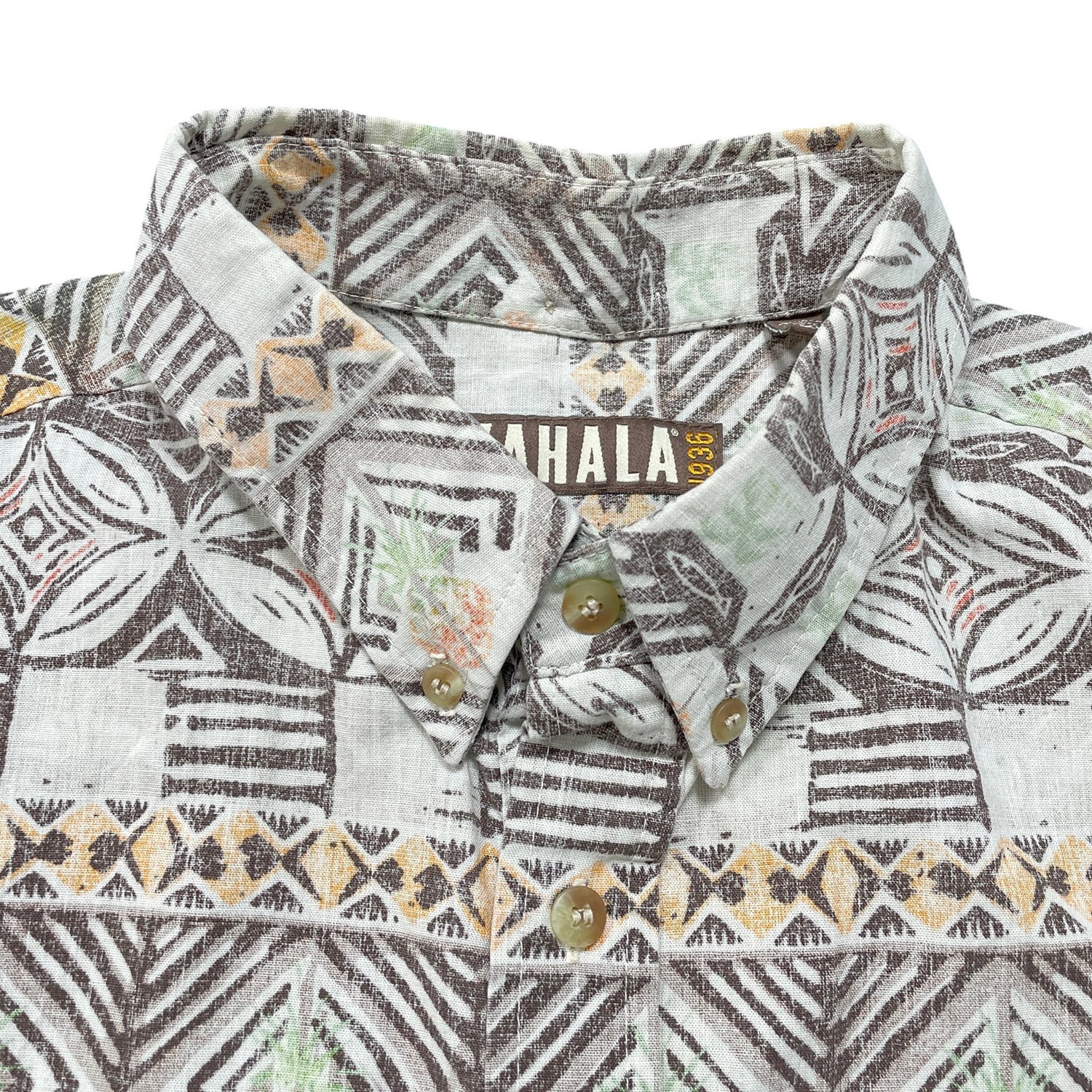 古着 USA製 KAHALA カハラ コットン/ポリ アロハシャツ ハワイアンシャツ プルオーバー BDシャツ ボタンダウン パイナップル柄 幾何学柄 メンズXL ブラウン BF3928