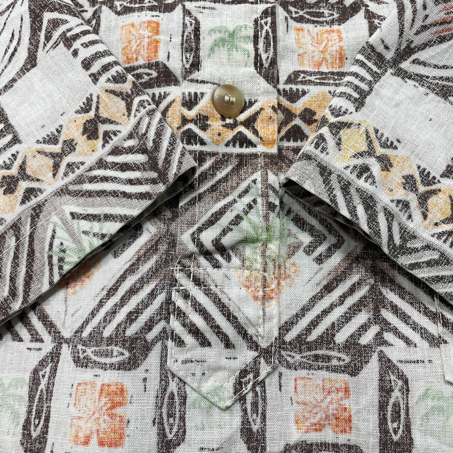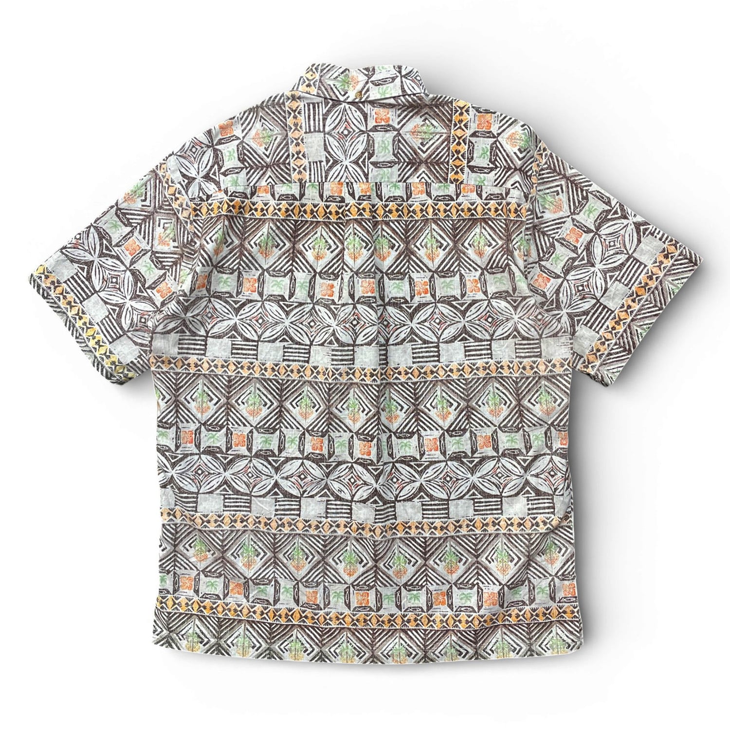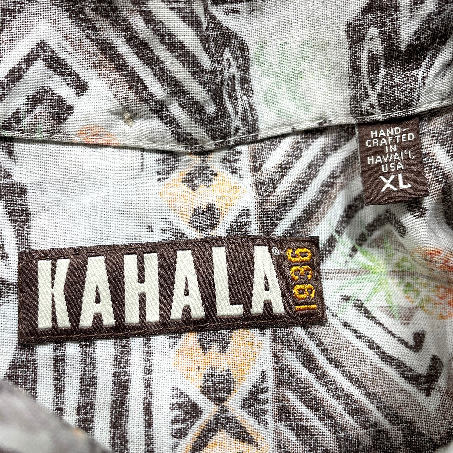 古着 USA製 KAHALA カハラ コットン/ポリ アロハシャツ ハワイアンシャツ プルオーバー BDシャツ ボタンダウン パイナップル柄 幾何学柄 メンズXL ブラウン BF3928