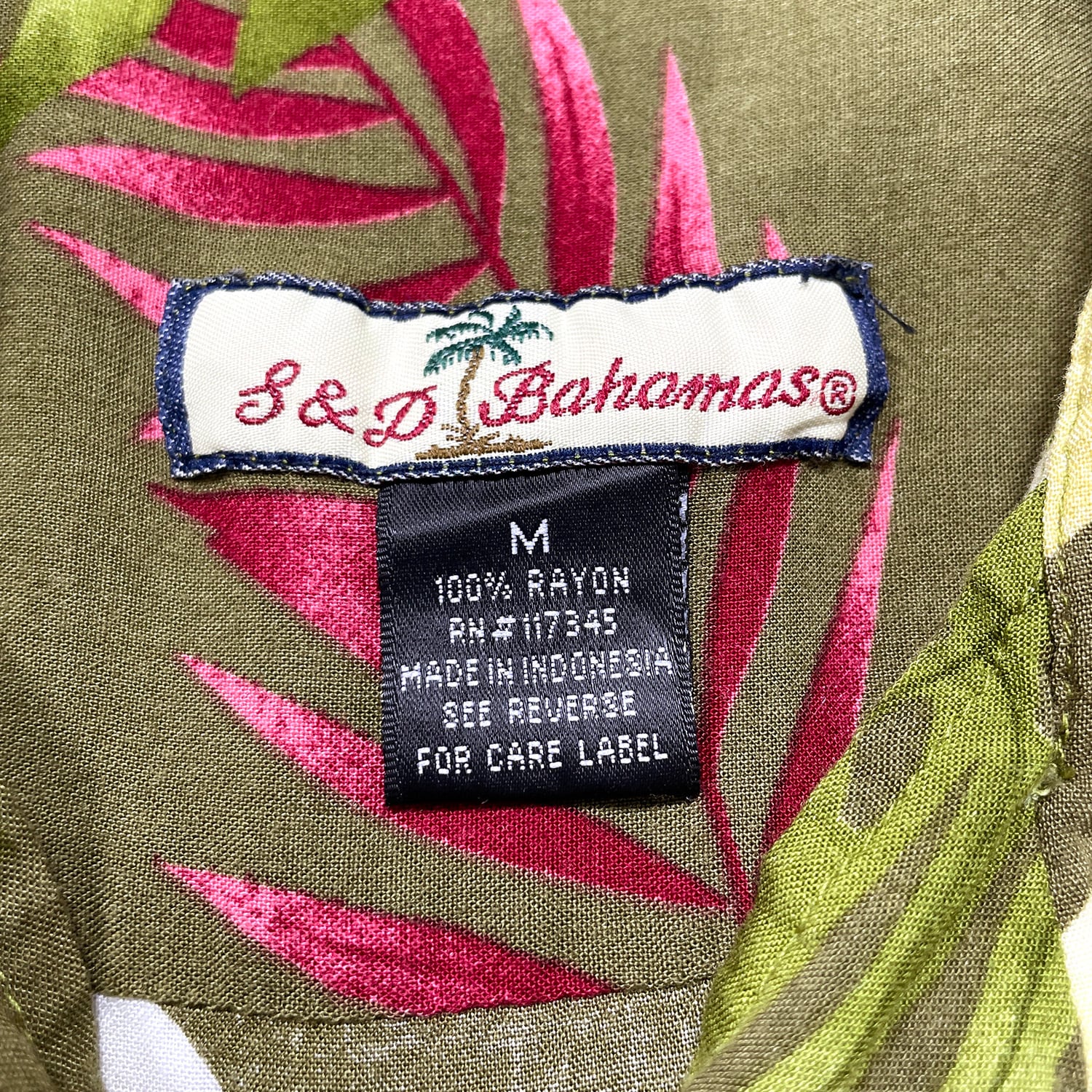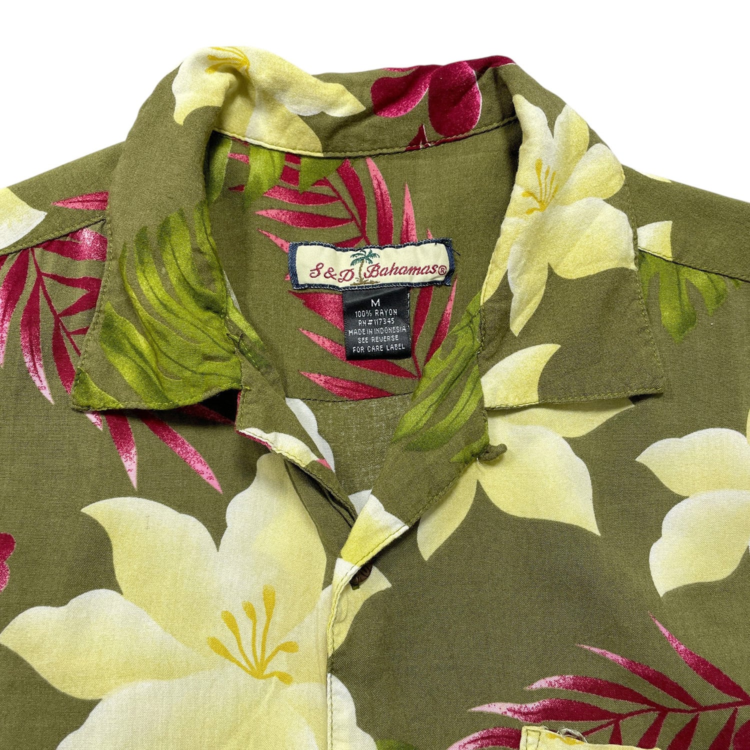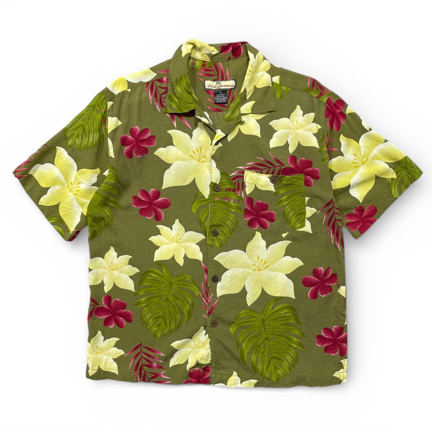 USA 古着 S&D Bahamas S&Dバハマ レーヨン 開襟 アロハシャツ ハワイアンシャツ 花柄 モンステラ柄 メンズM オリーブ BF3902