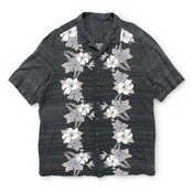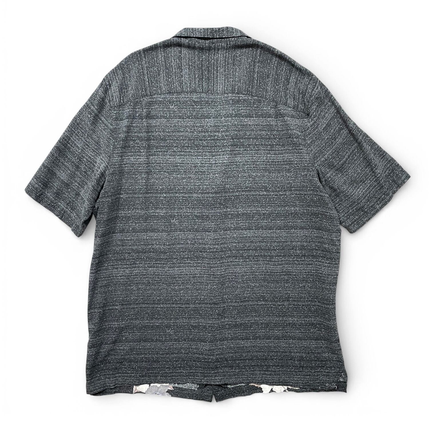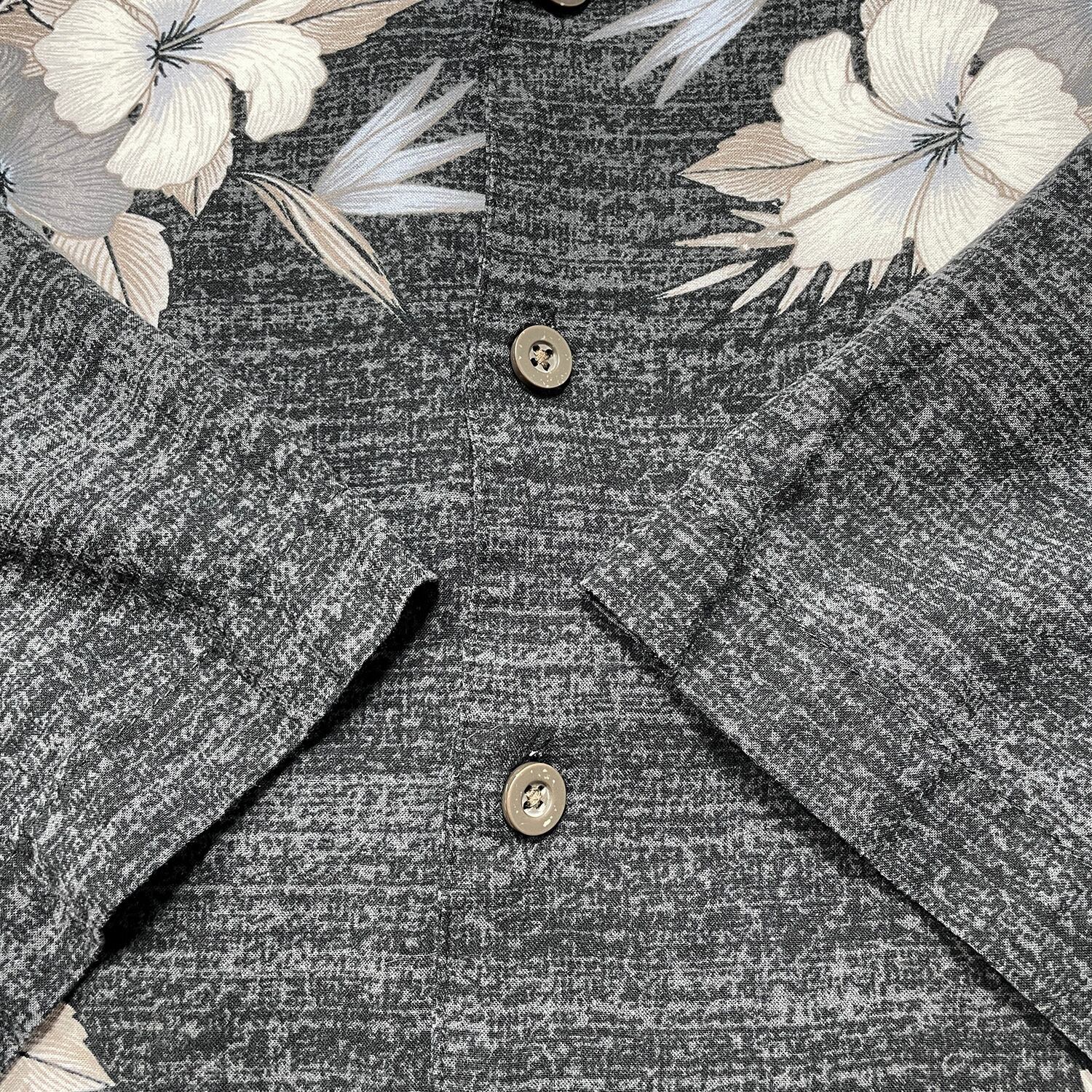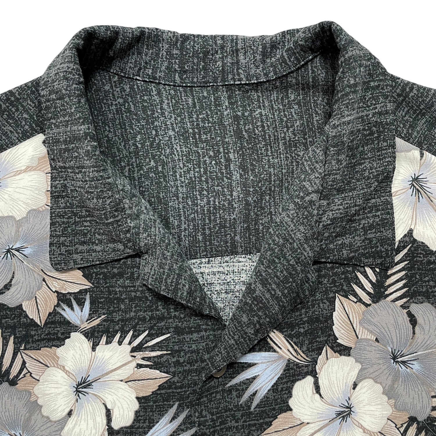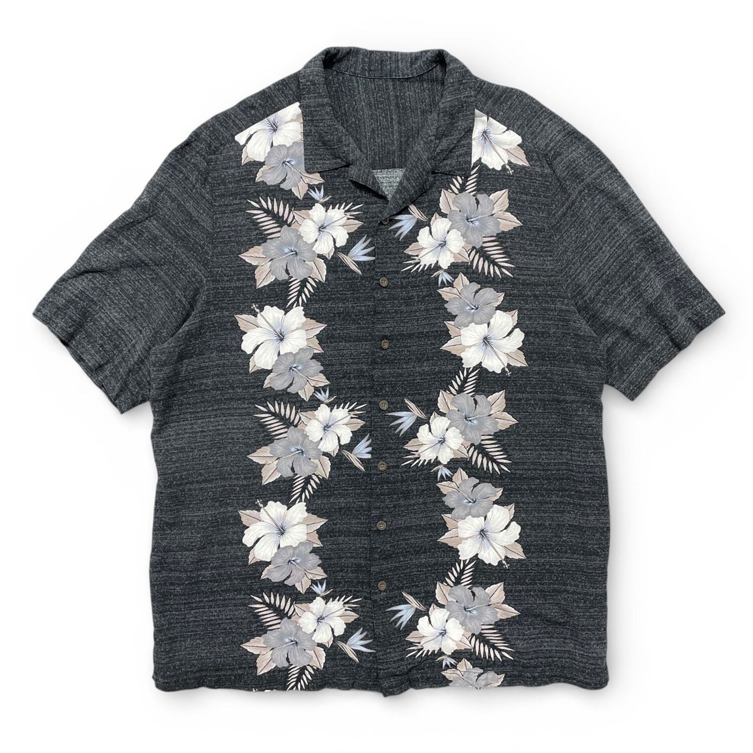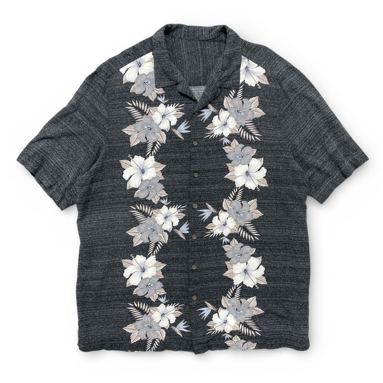 USA 古着 レーヨン 開襟 アロハシャツ ハワイアンシャツ ハイビスカス柄 ボーダー柄 メンズXL 相当 ブラック BF3910