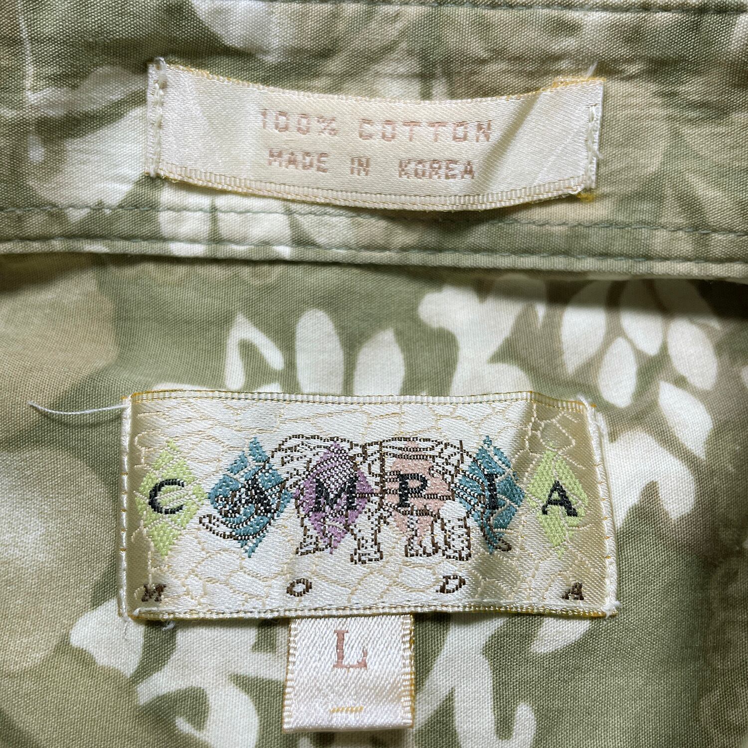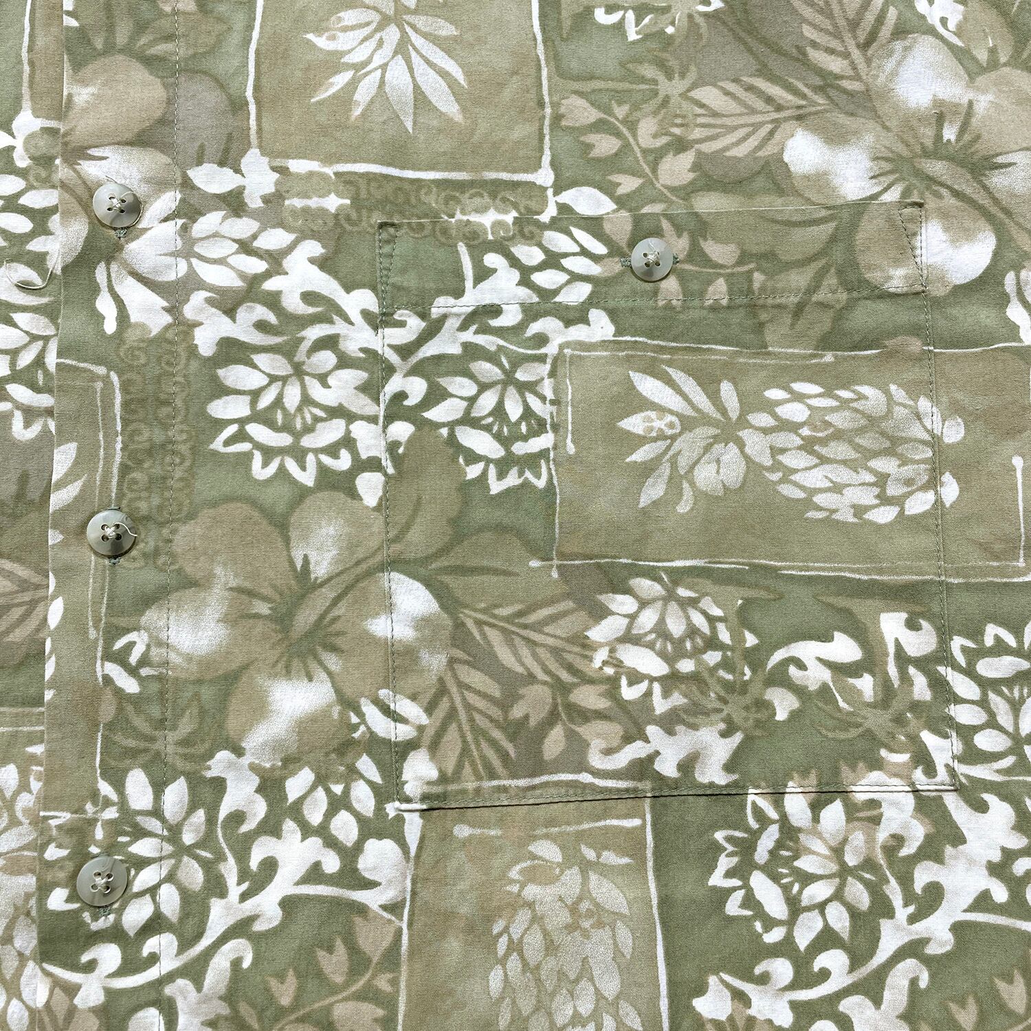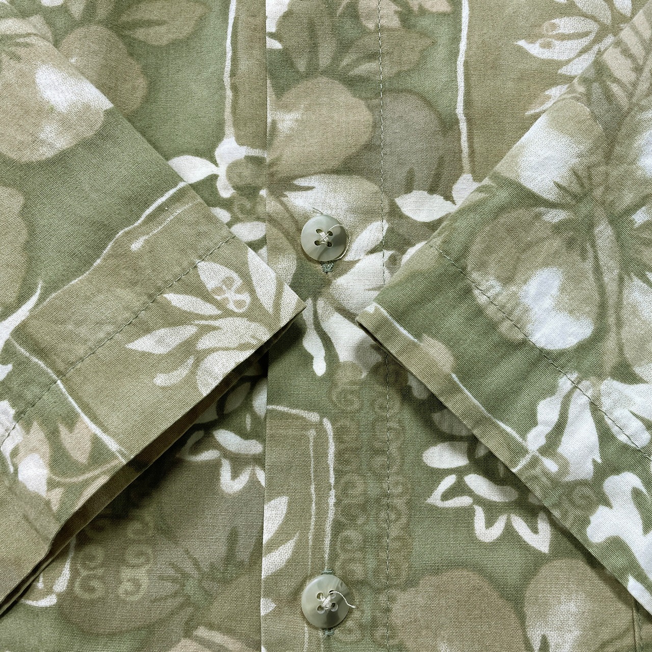 USA 古着 CAMPIA MODA カンピアモーダ コットン アロハシャツ ハワイアンシャツ パイナップル柄 ハイビスカス柄 サイズL カーキ BF3914