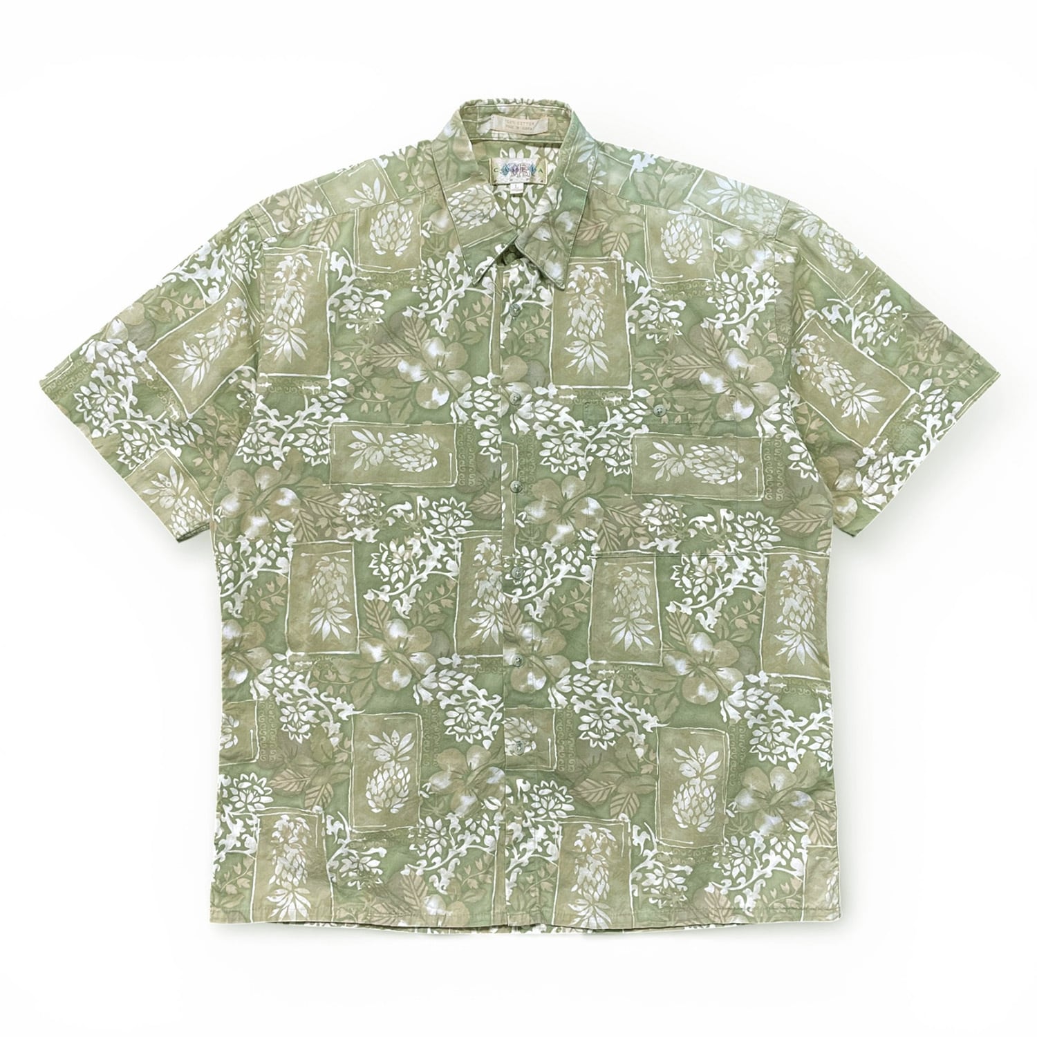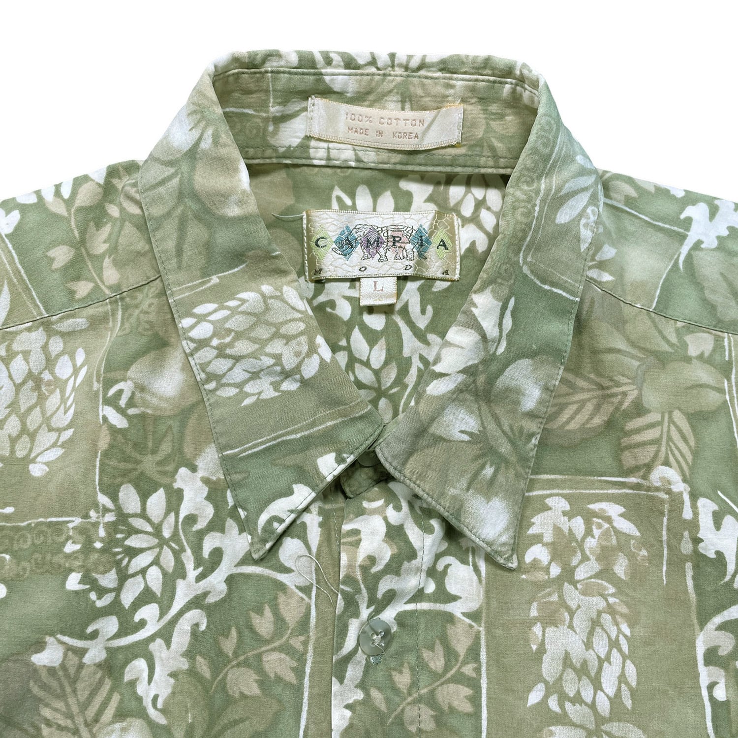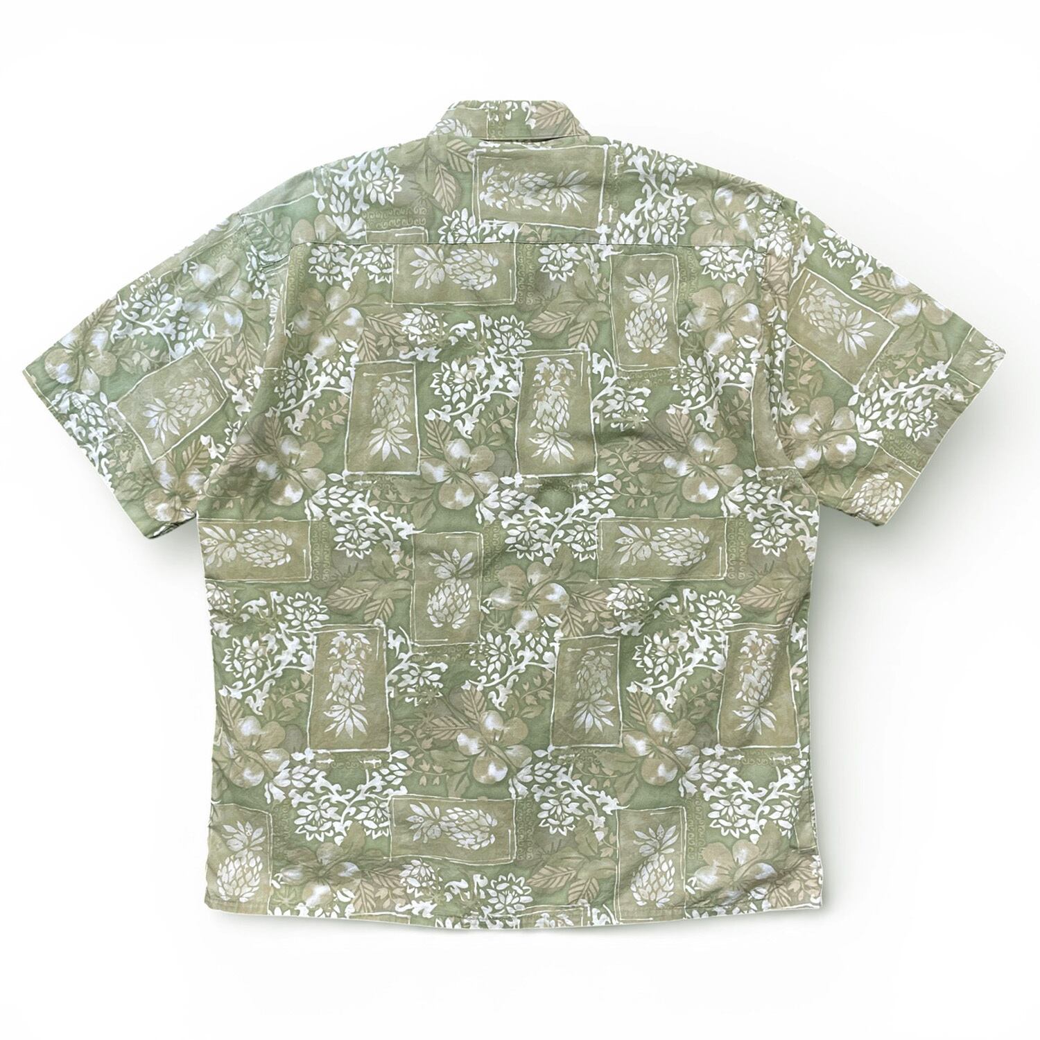 USA 古着 CAMPIA MODA カンピアモーダ コットン アロハシャツ ハワイアンシャツ パイナップル柄 ハイビスカス柄 サイズL カーキ BF3914