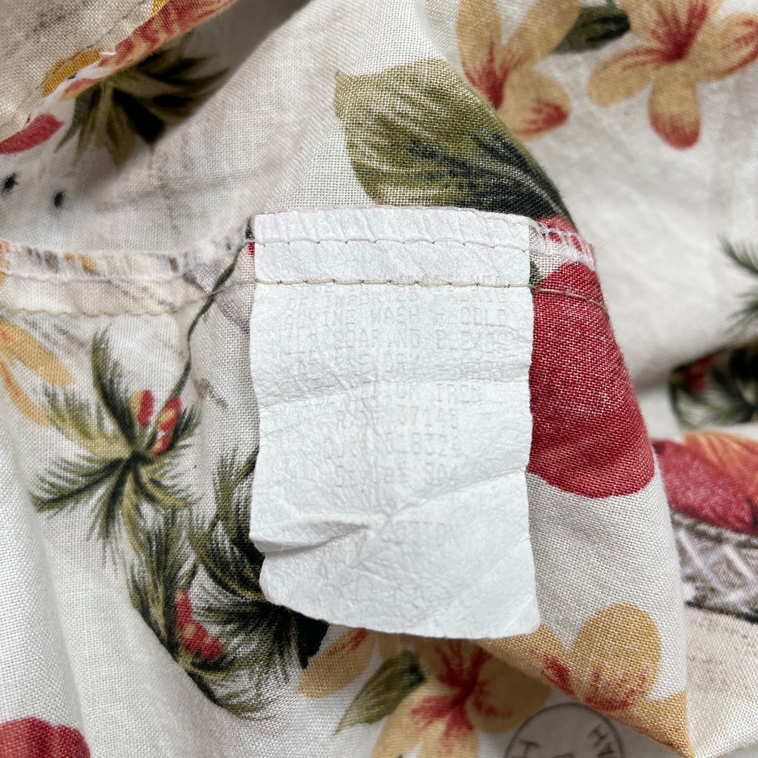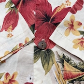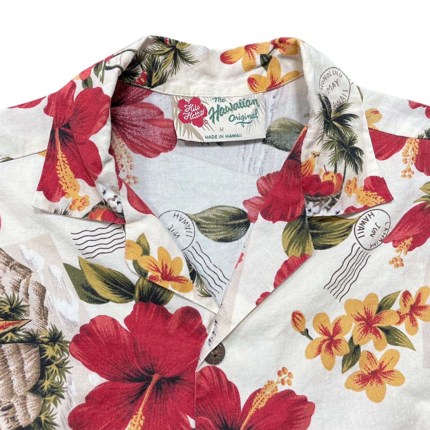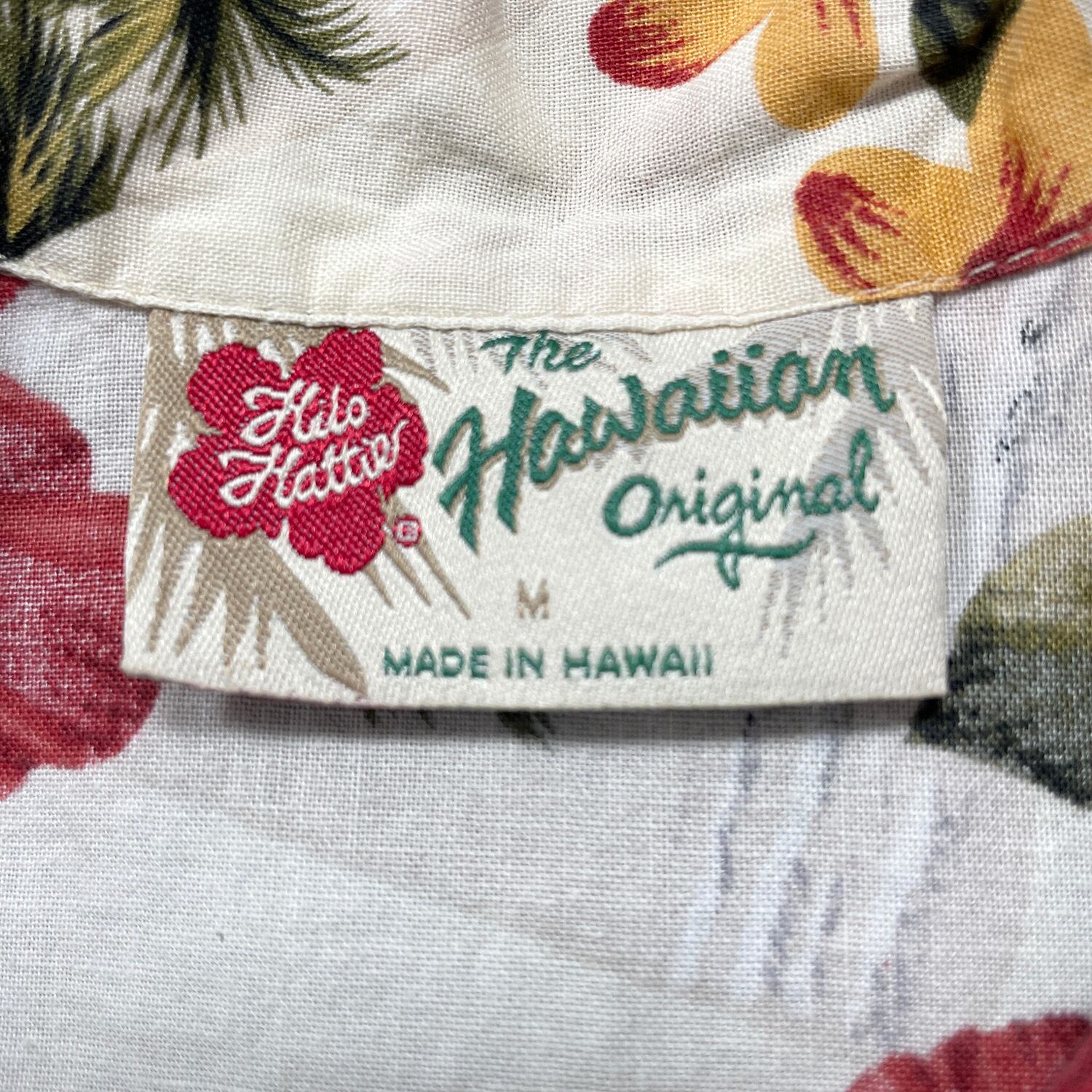 古着 USA製 Hilo Hattie ヒロハッティ アロハシャツ ハワイアンシャツ 開襟 ハイビスカス柄 パイナップル柄 サイズM アイボリー BF3917