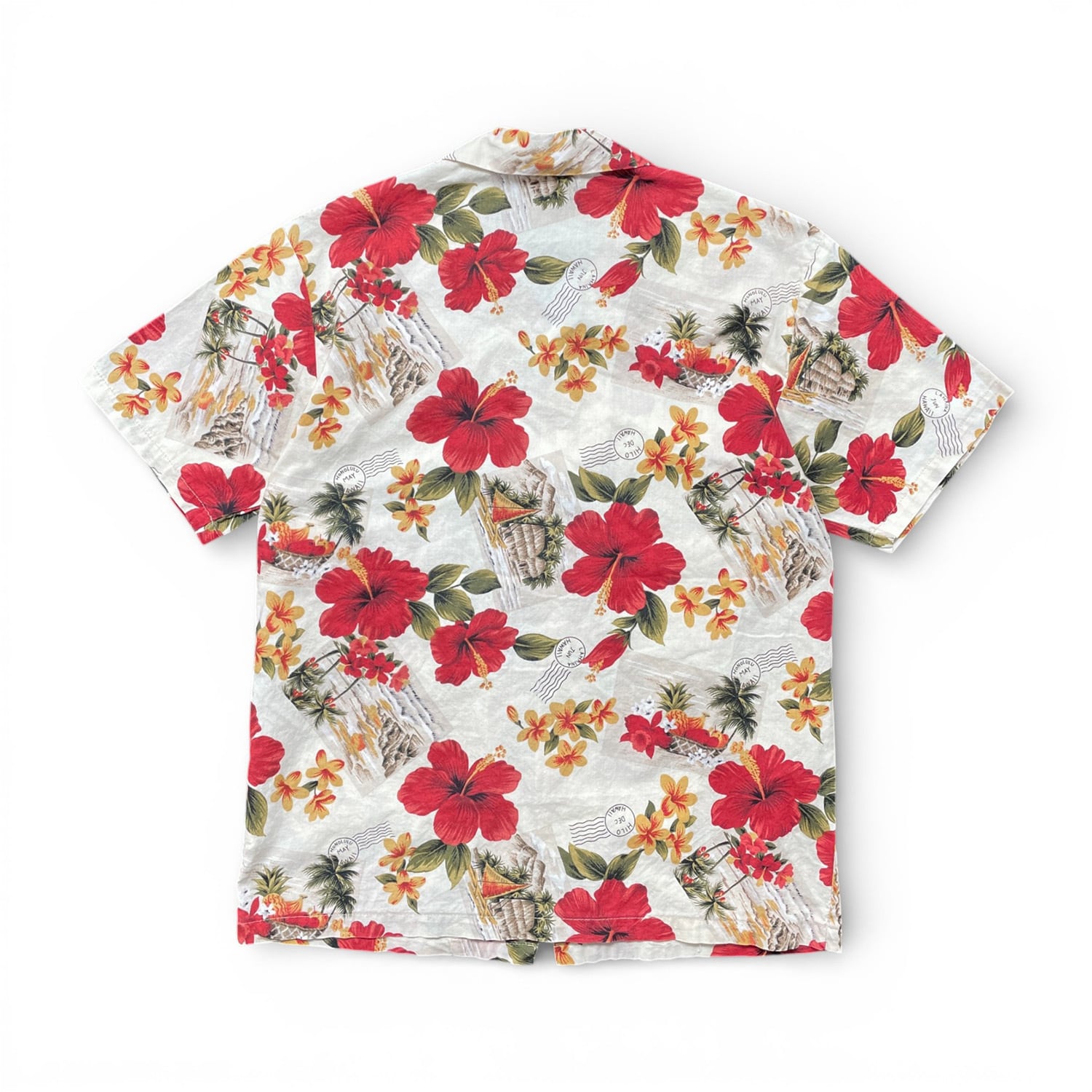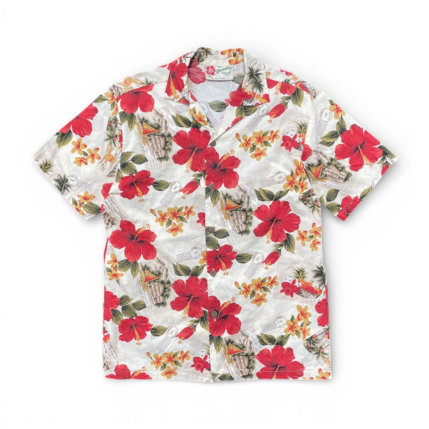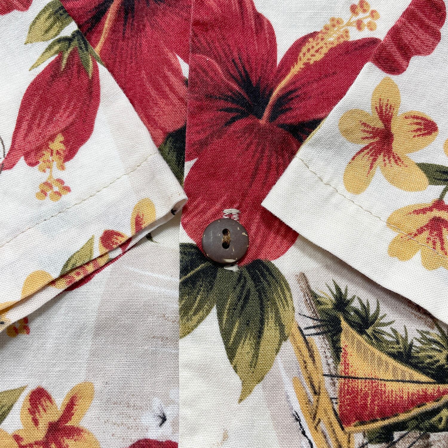古着 USA製 Hilo Hattie ヒロハッティ アロハシャツ ハワイアンシャツ 開襟 ハイビスカス柄 パイナップル柄 サイズM アイボリー BF3917
