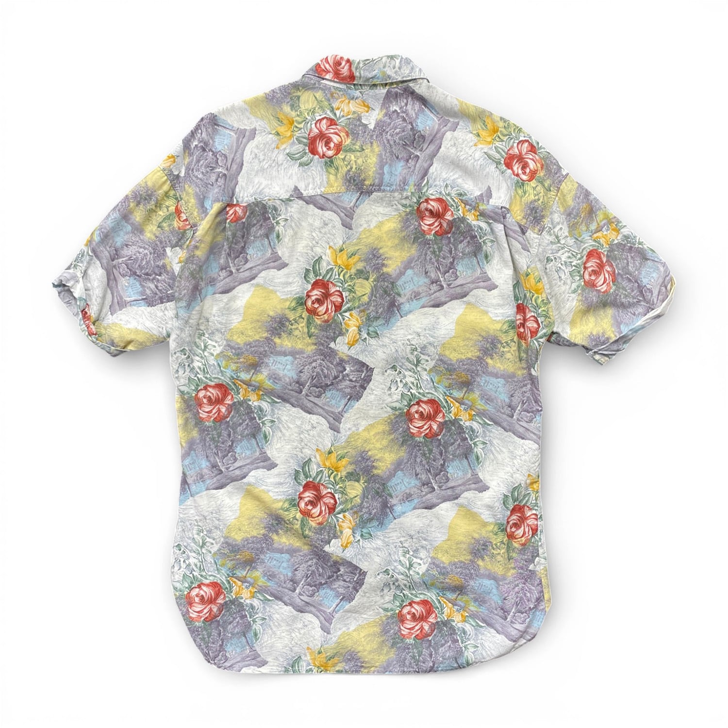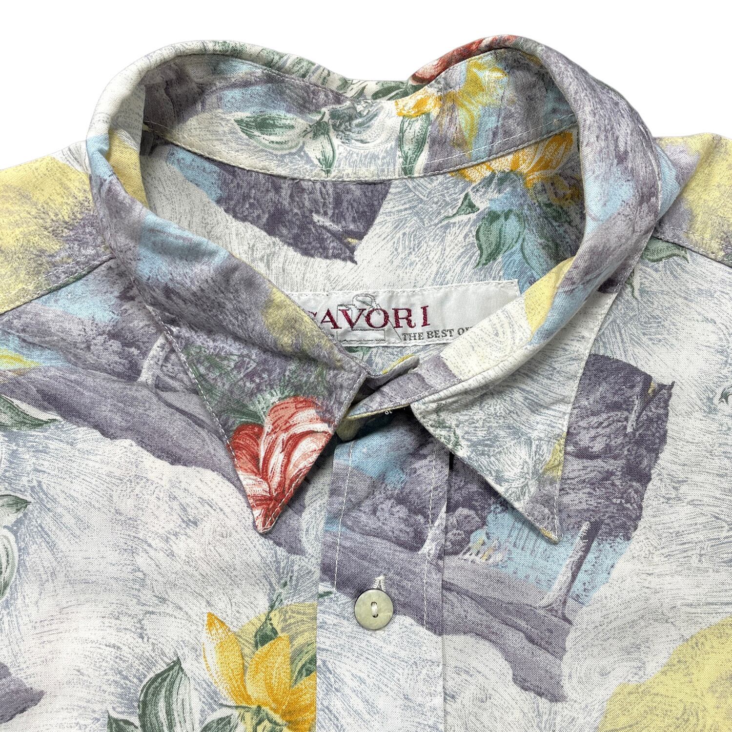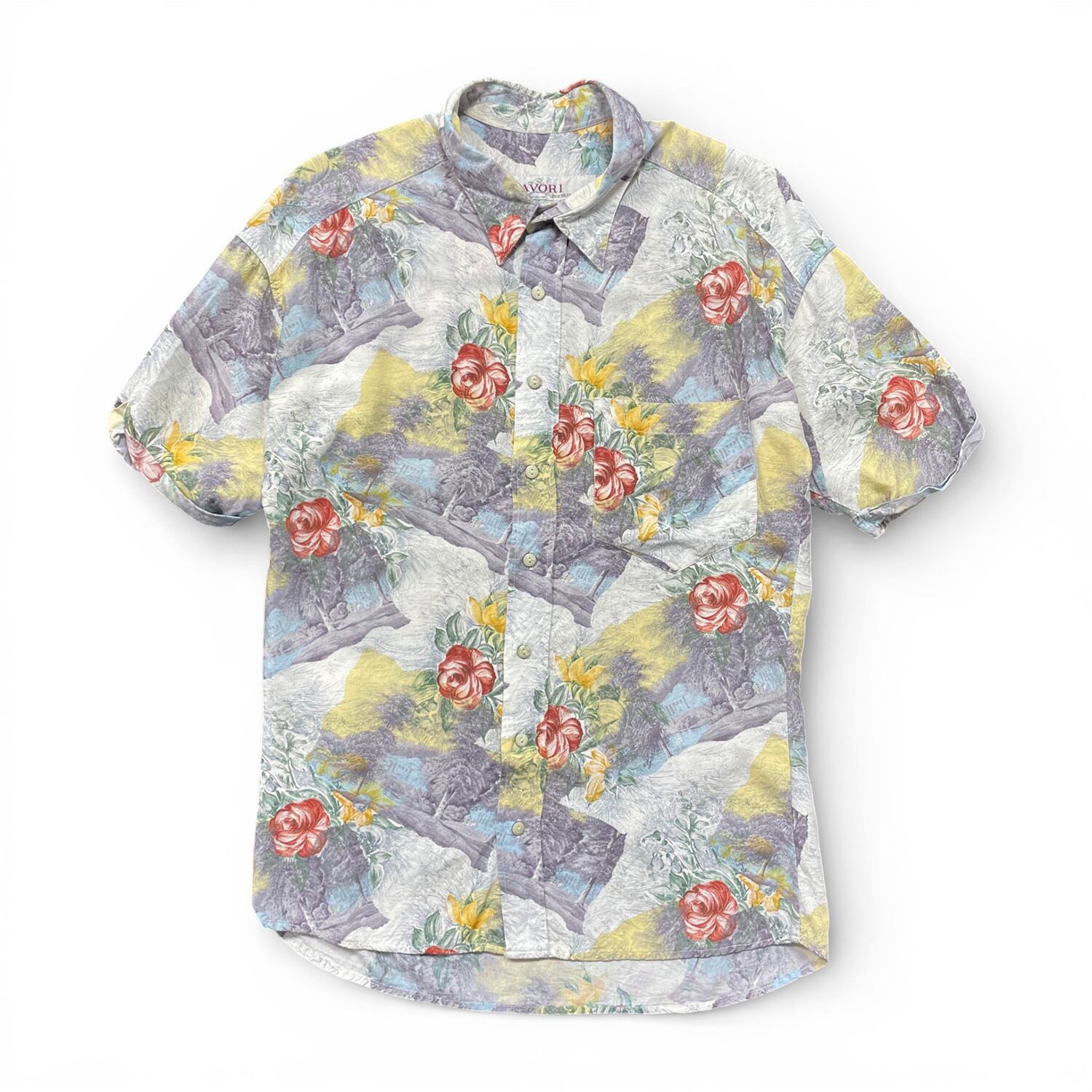 USA 古着 CAVORI カヴォリ レーヨン アロハシャツ ハワイアンシャツ 花柄 風景柄 ホワイト メンズM 程度 BF3893