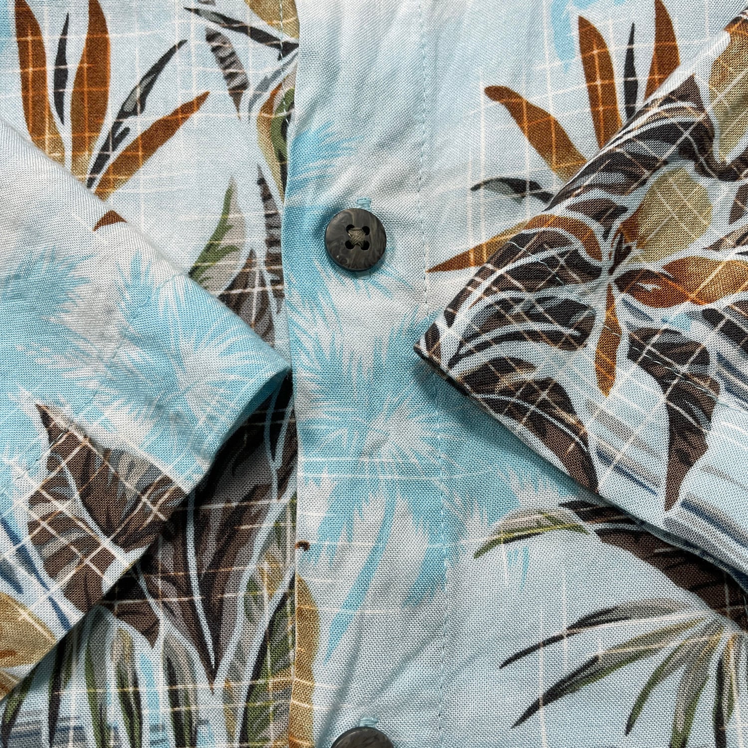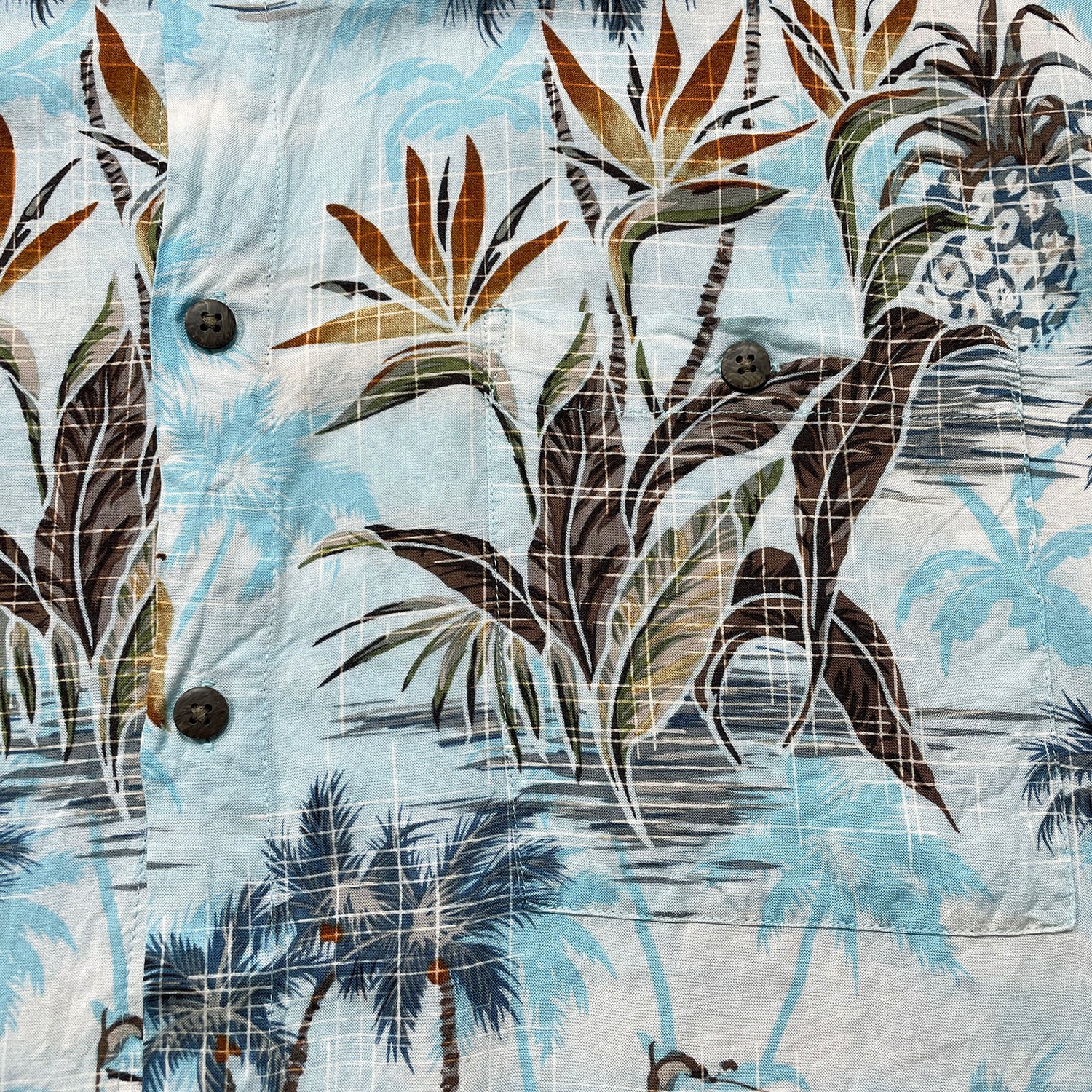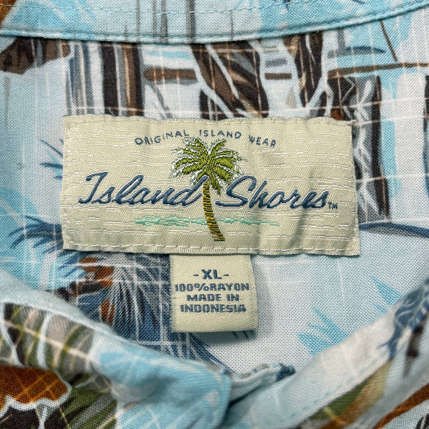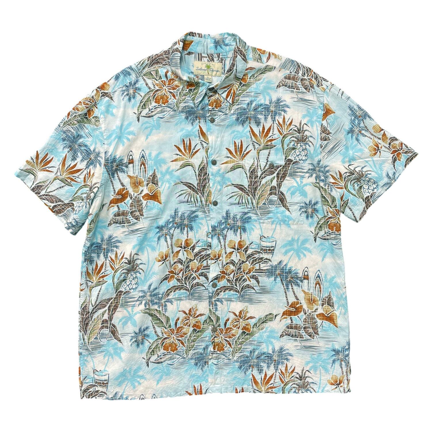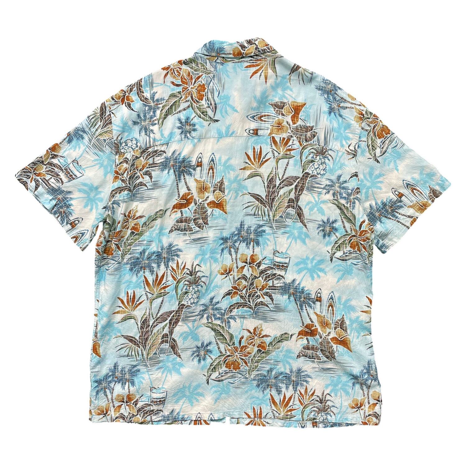 USA 古着 Island Shores アイランドショアーズ レーヨン アロハシャツ ハワイアンシャツ ヤシの木 パイナップル柄 メンズXL ライトブルー BF3949