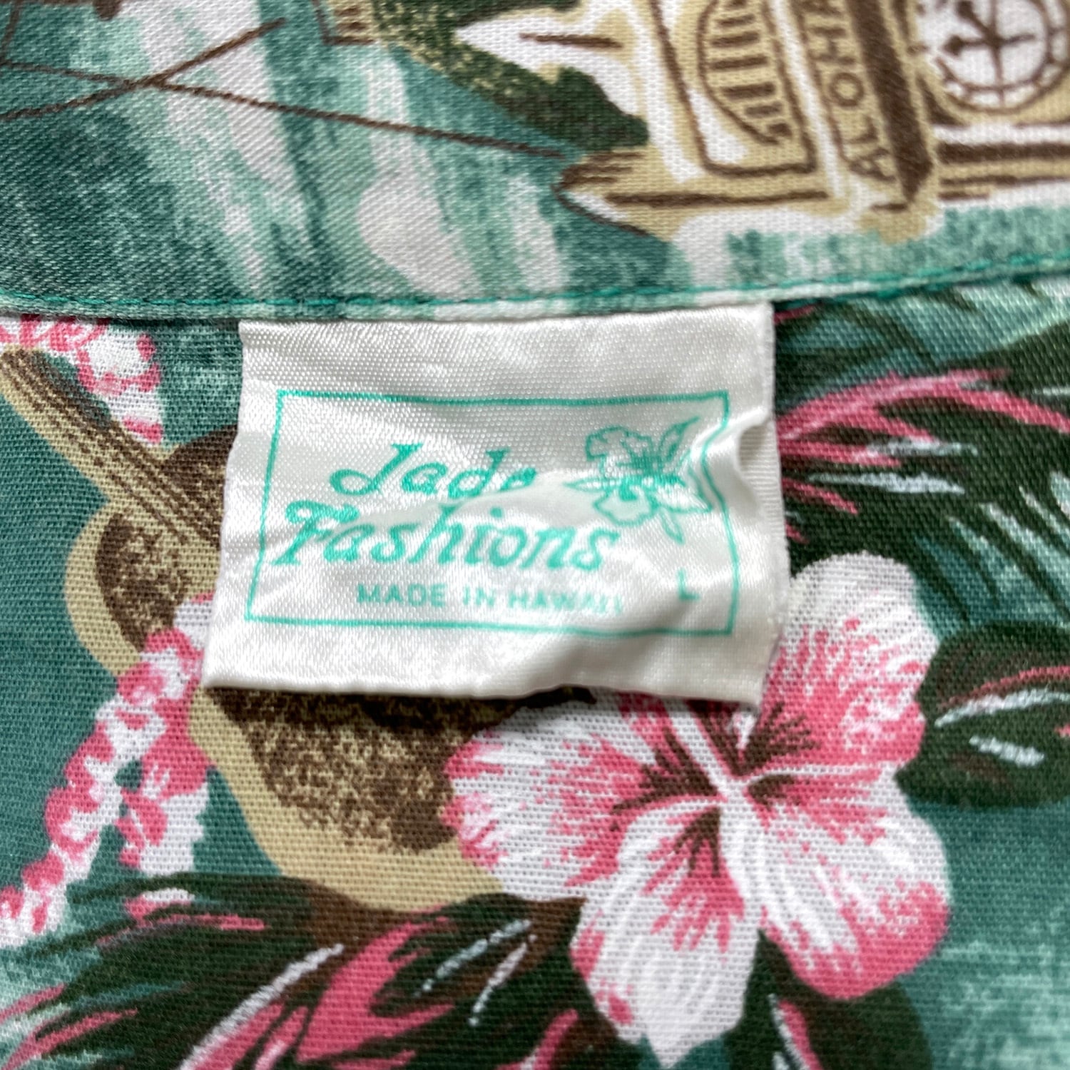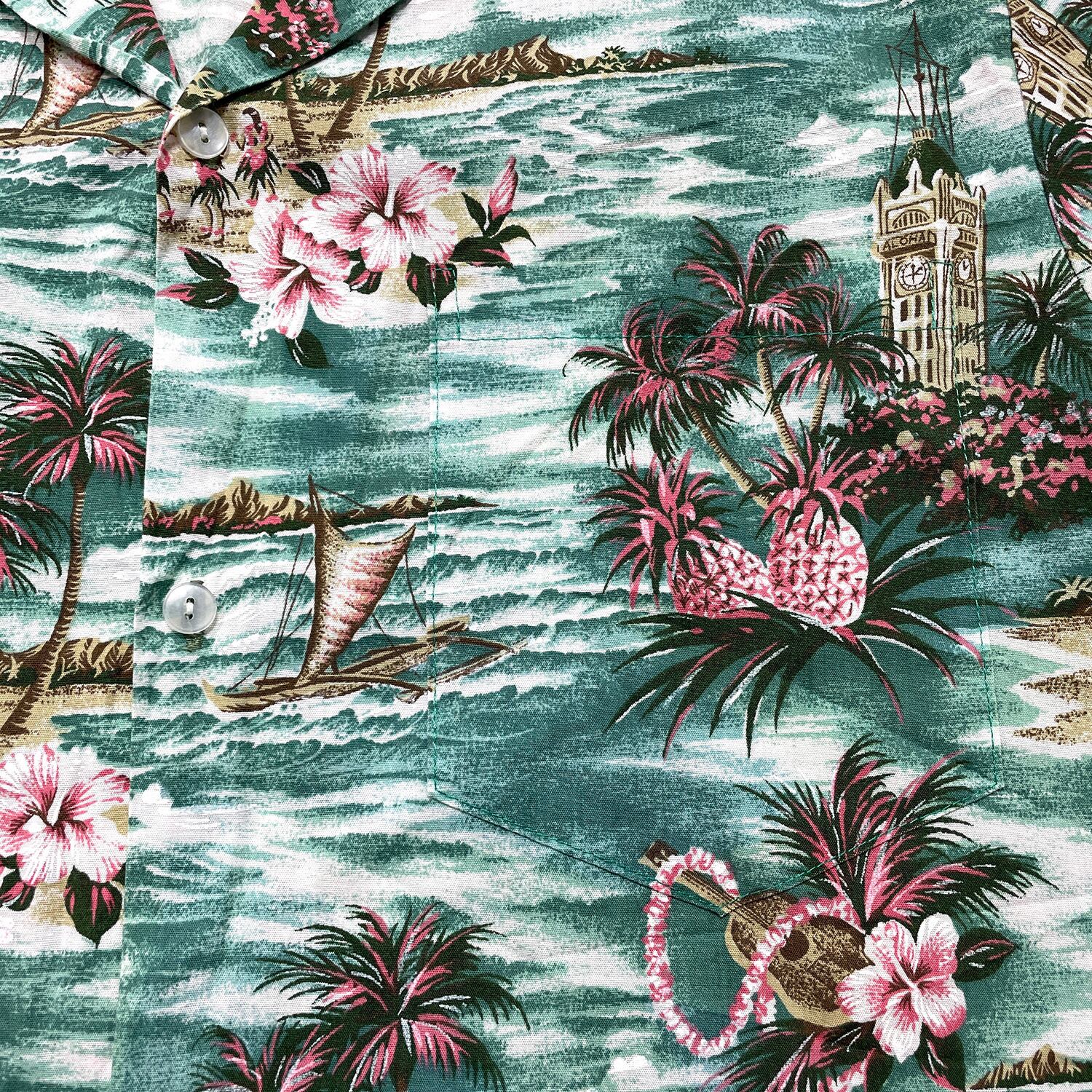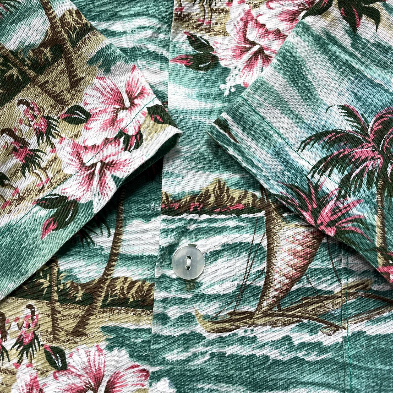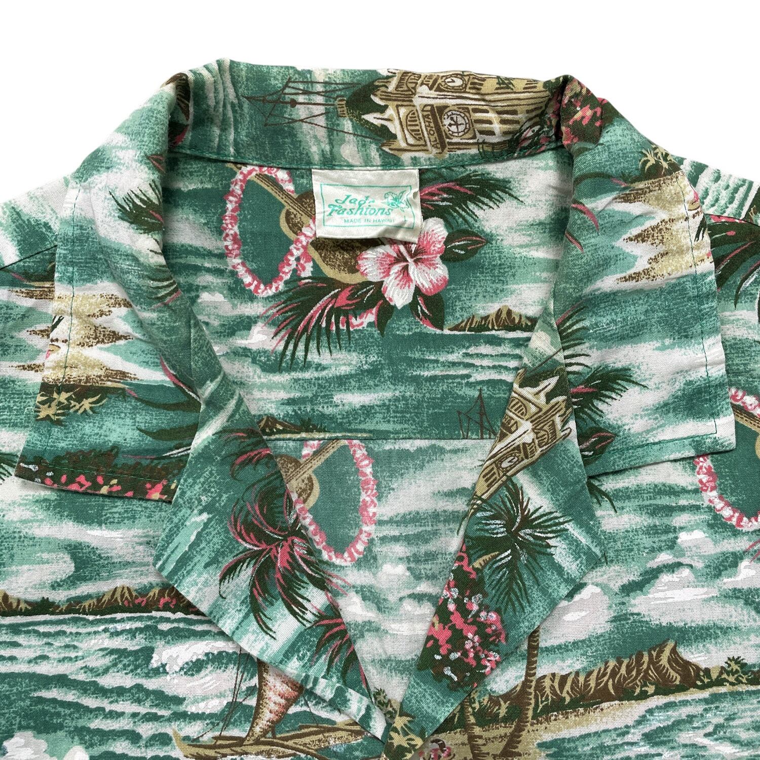 USA 古着 ハワイ製 Jade Fashions コットン/ポリ 開襟 アロハシャツ ハワイアンシャツ メンズL グリーン BF3933