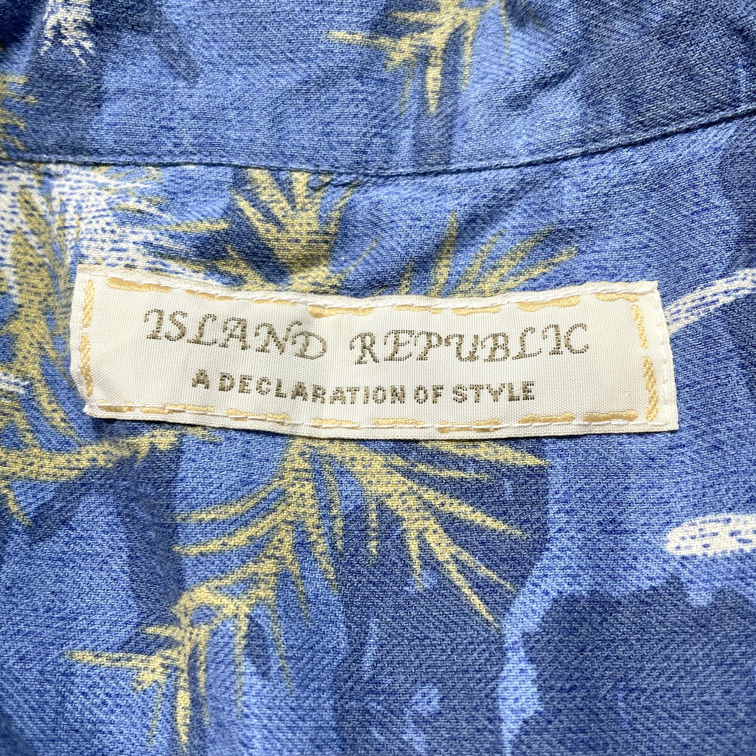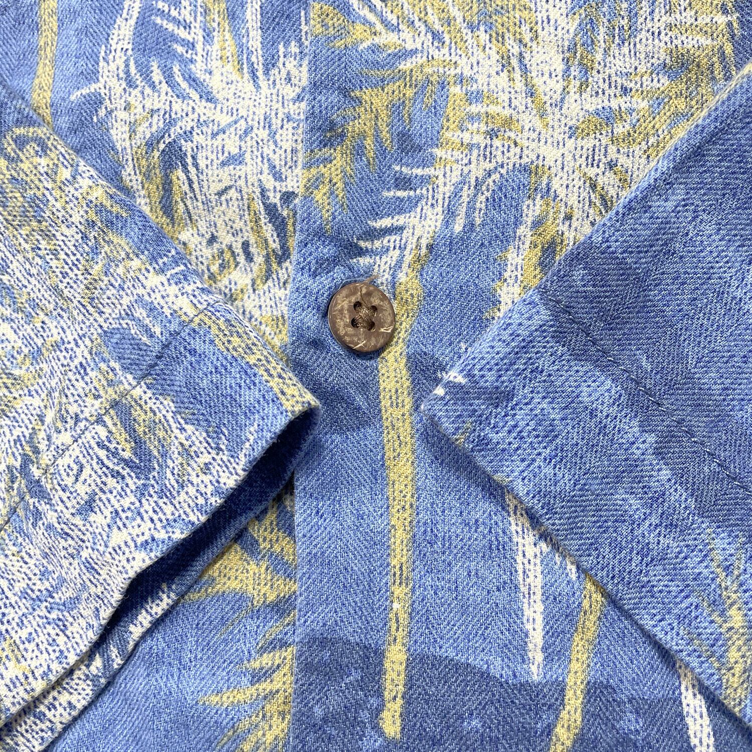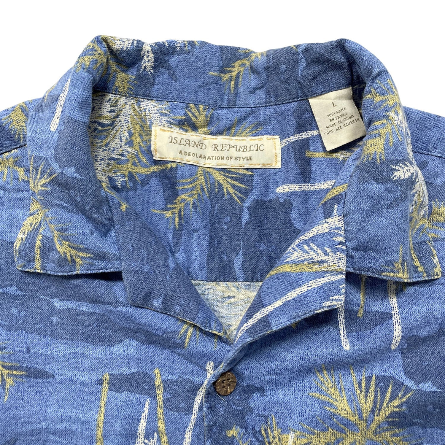 USA 古着 ISLAND REPUBLIC アイランドリパブリック シルク 開襟 アロハシャツ ハワイアンシャツ パームツリー柄 L ブルー BF3939