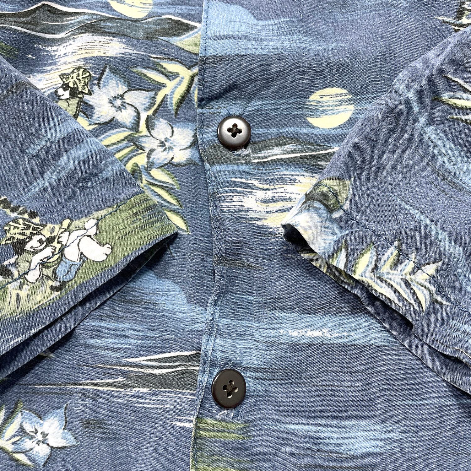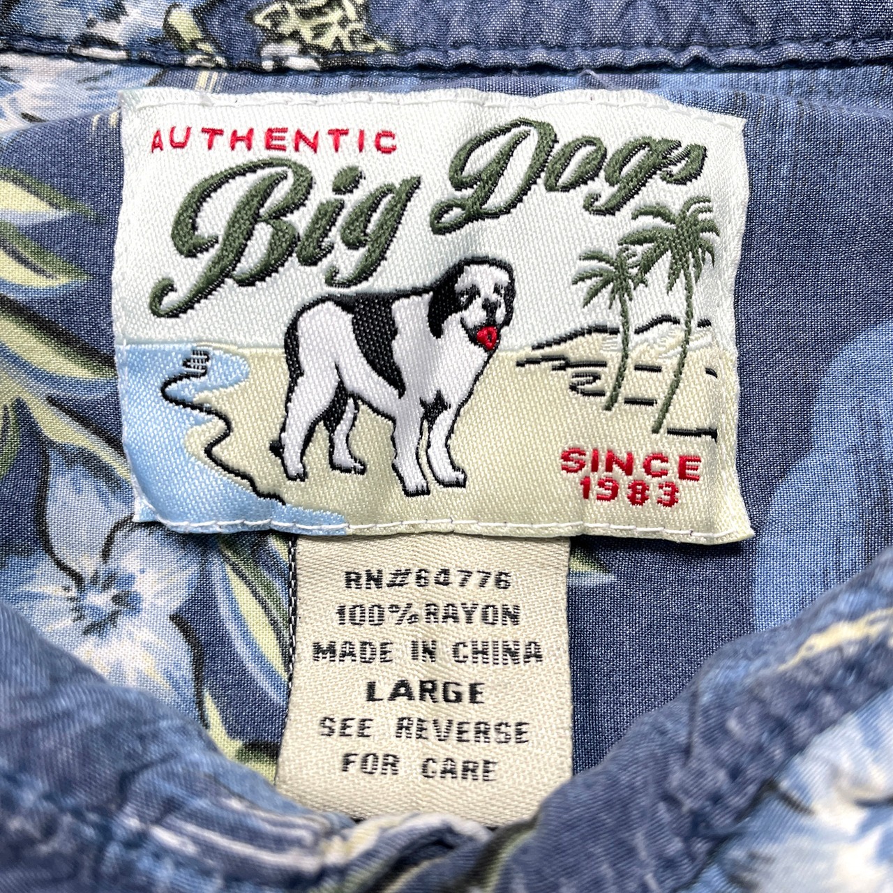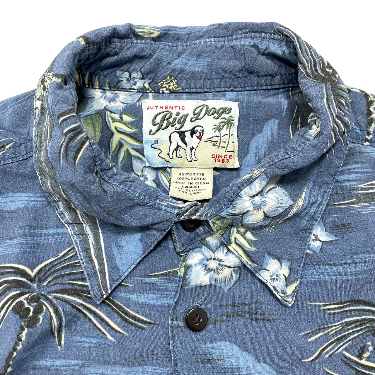 USA 古着 BIG DOGS ビッグドッグス レーヨン アロハシャツ ハワイアンシャツ パームツリー柄 ヤシの木 メンズL ネイビー BF3943