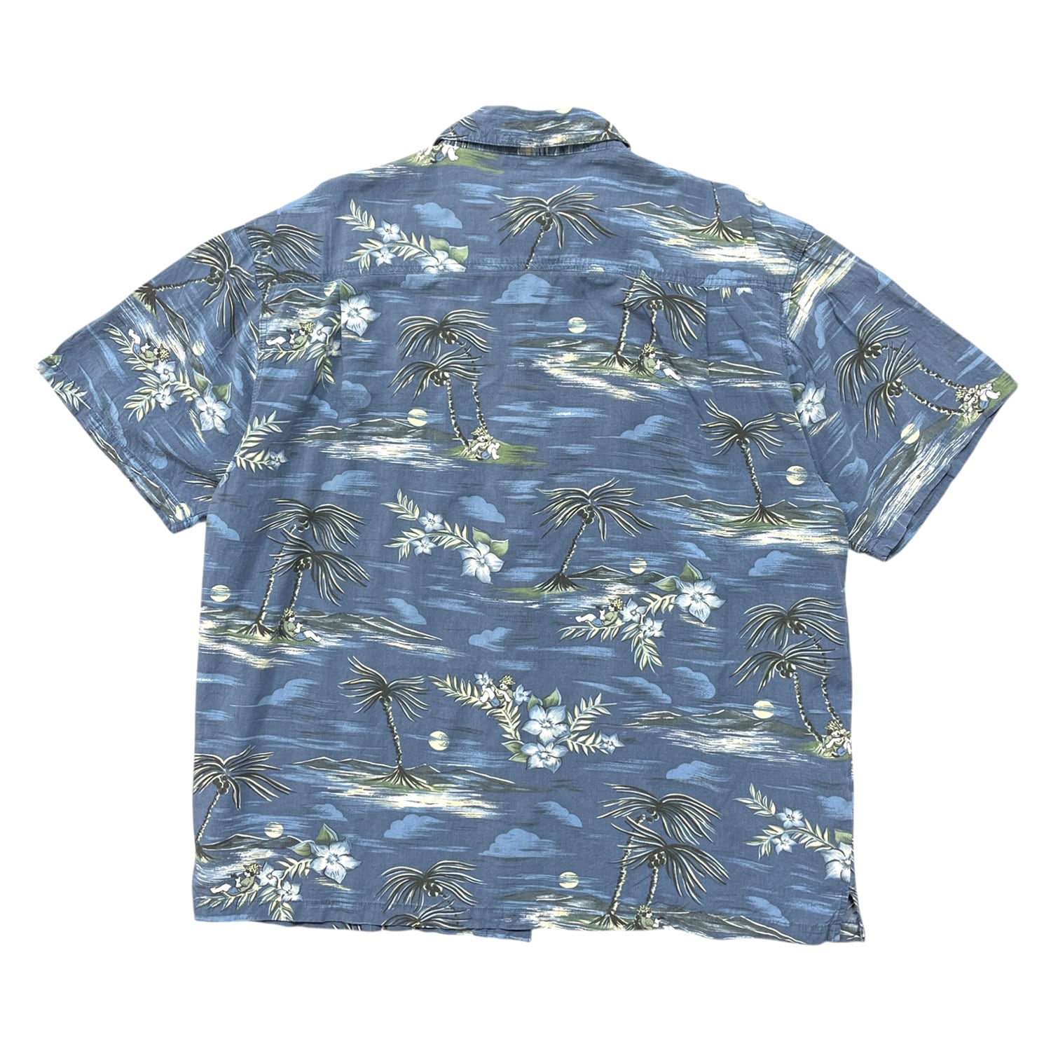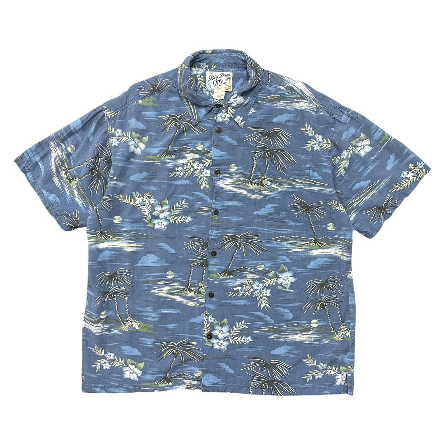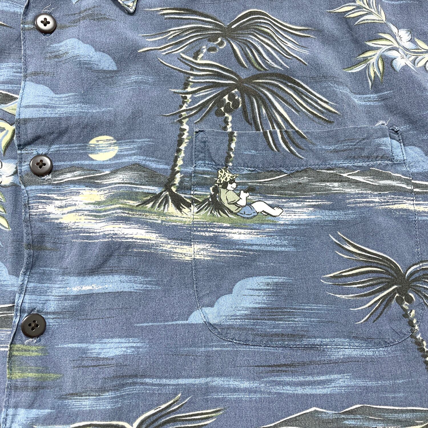 USA 古着 BIG DOGS ビッグドッグス レーヨン アロハシャツ ハワイアンシャツ パームツリー柄 ヤシの木 メンズL ネイビー BF3943