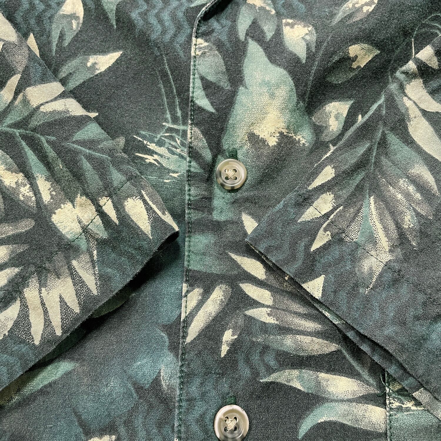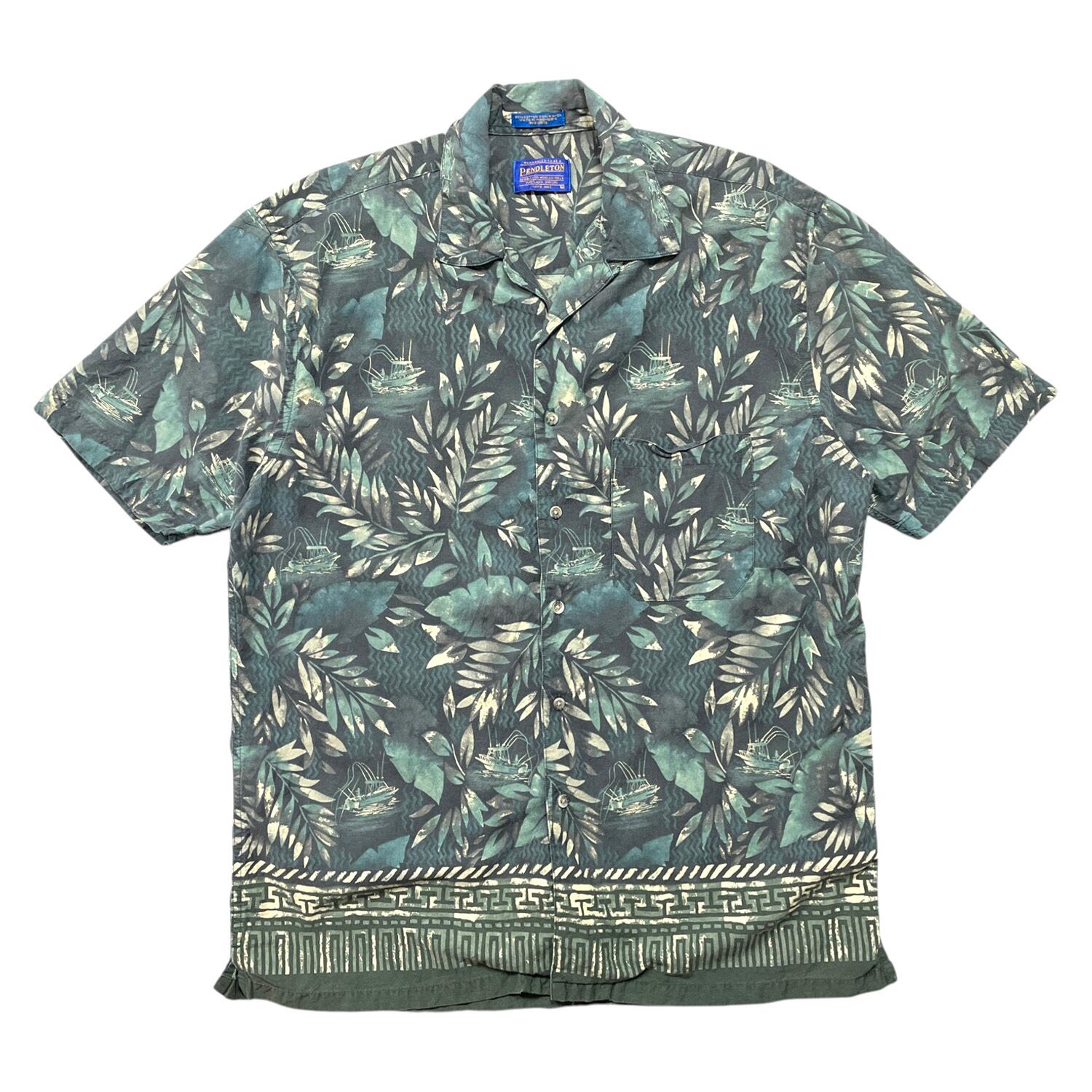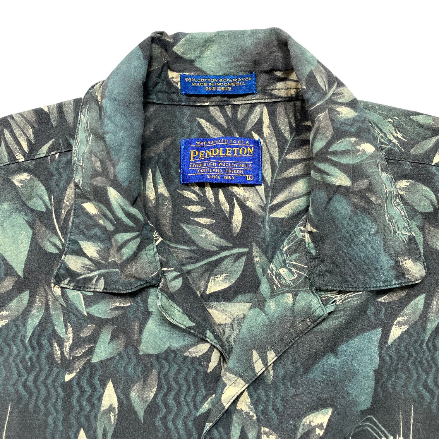 USA 古着 PENDLETON ペンドルトン コットン レーヨン 開襟 アロハシャツ ハワイアンシャツ リーフ 総柄 メンズL グリーン BF3944