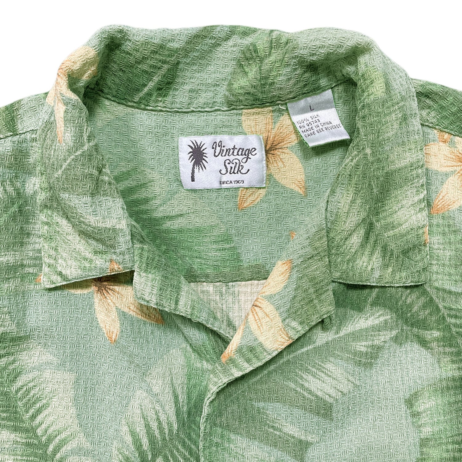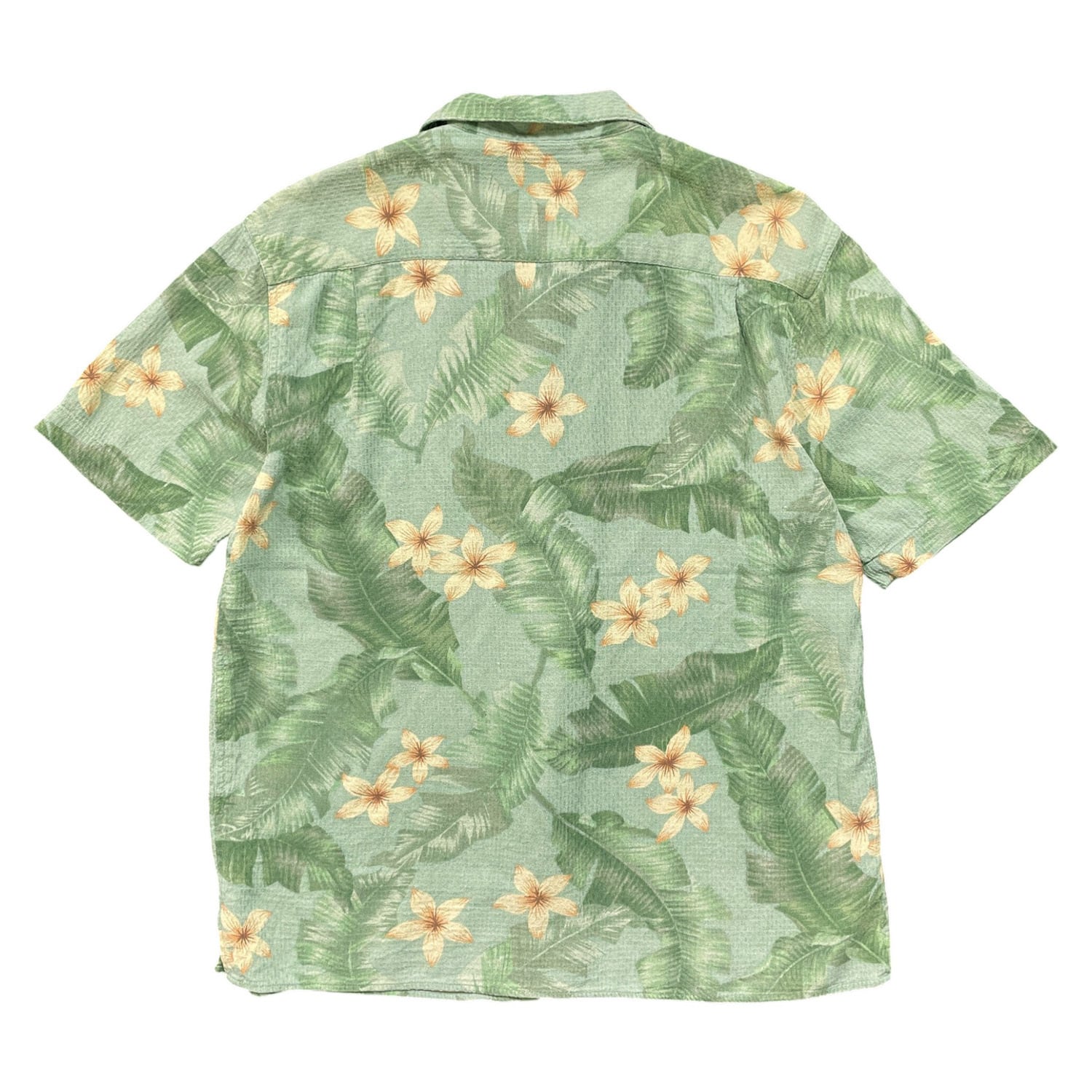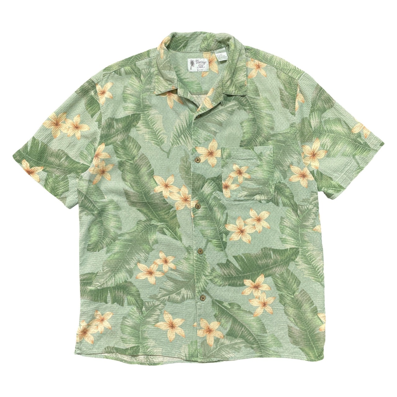 USA 古着 Vintage Silk ヴィンテージシルク シルク 開襟 アロハシャツ ハワイアンシャツ プルメリア柄 パームツリー柄 メンズL グリーン BF3968