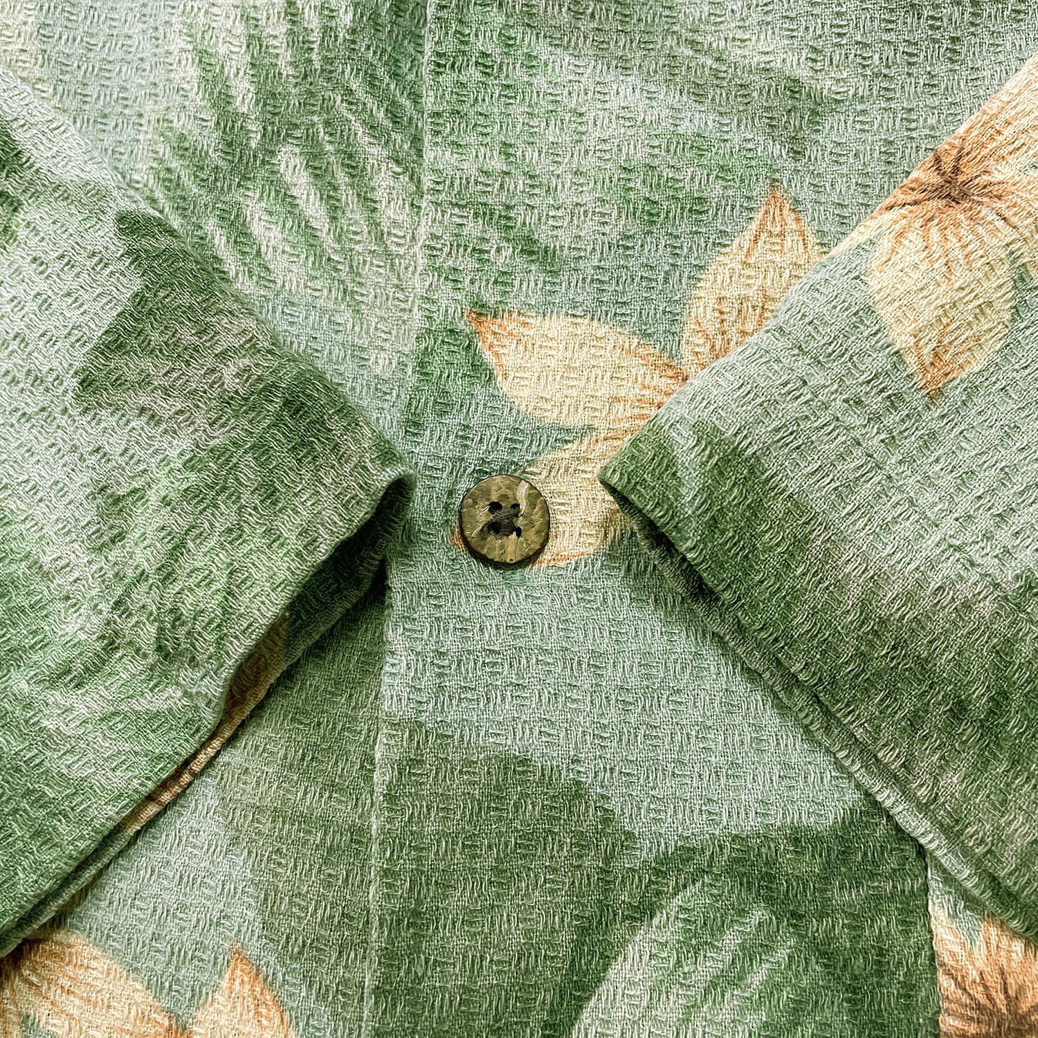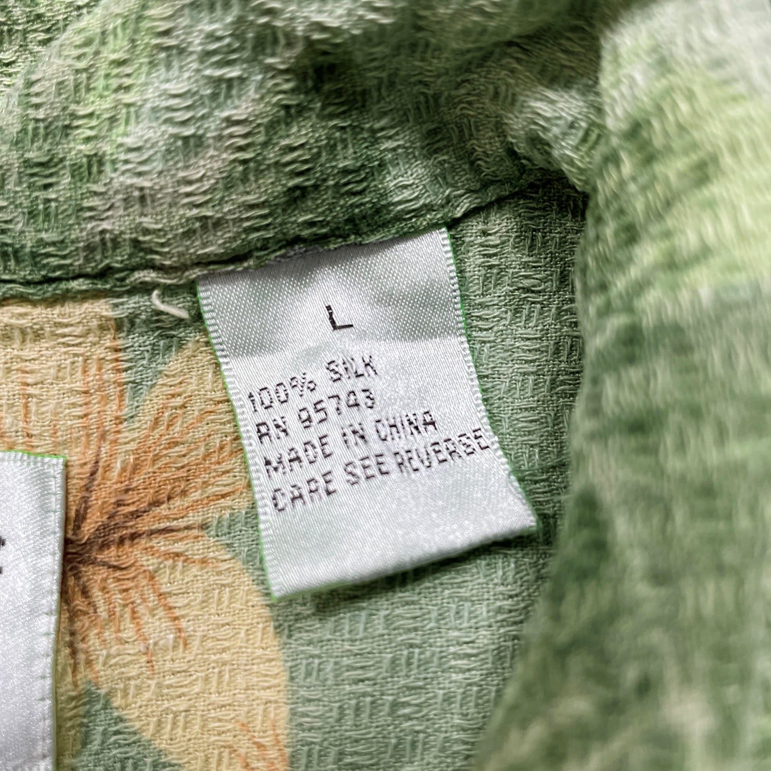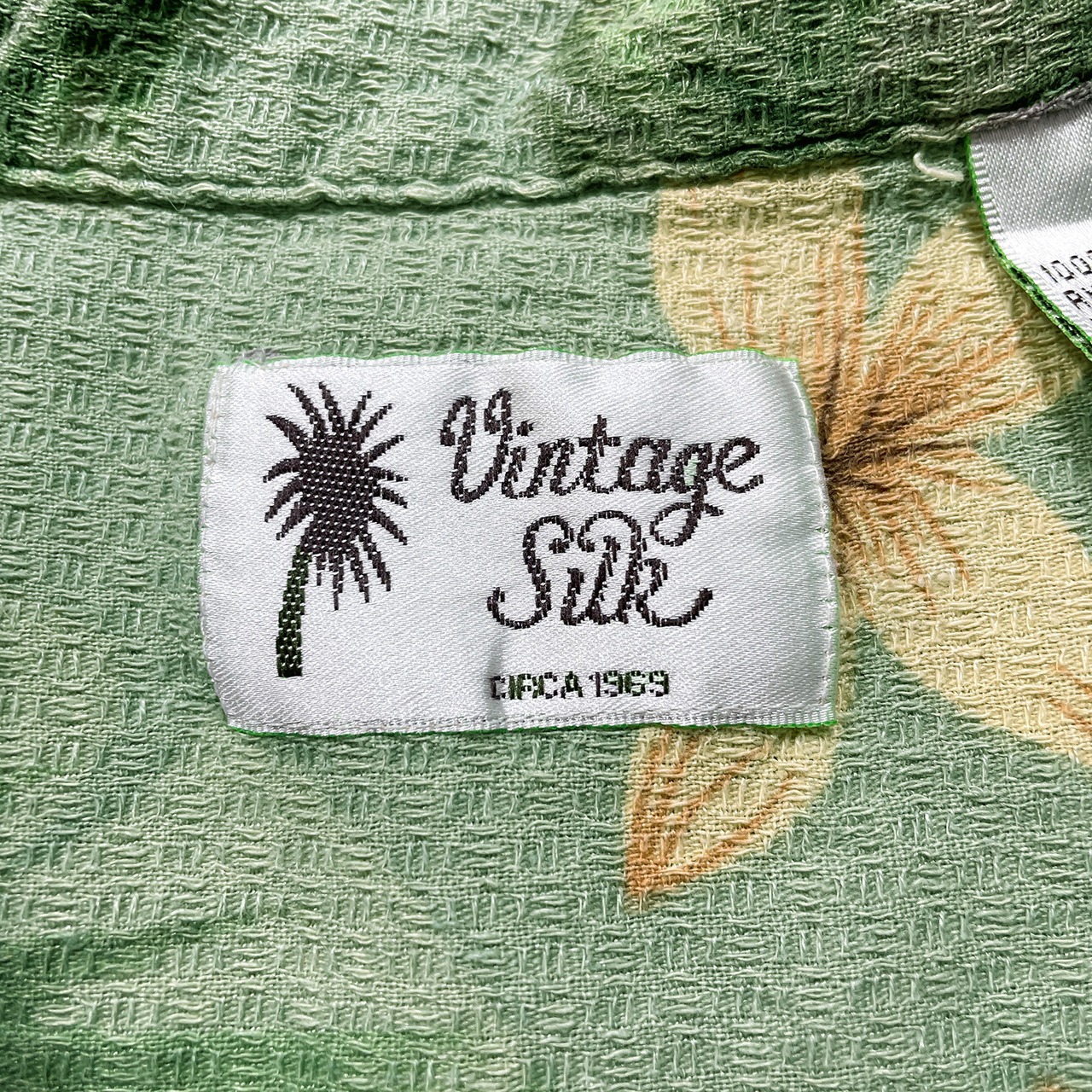 USA 古着 Vintage Silk ヴィンテージシルク シルク 開襟 アロハシャツ ハワイアンシャツ プルメリア柄 パームツリー柄 メンズL グリーン BF3968