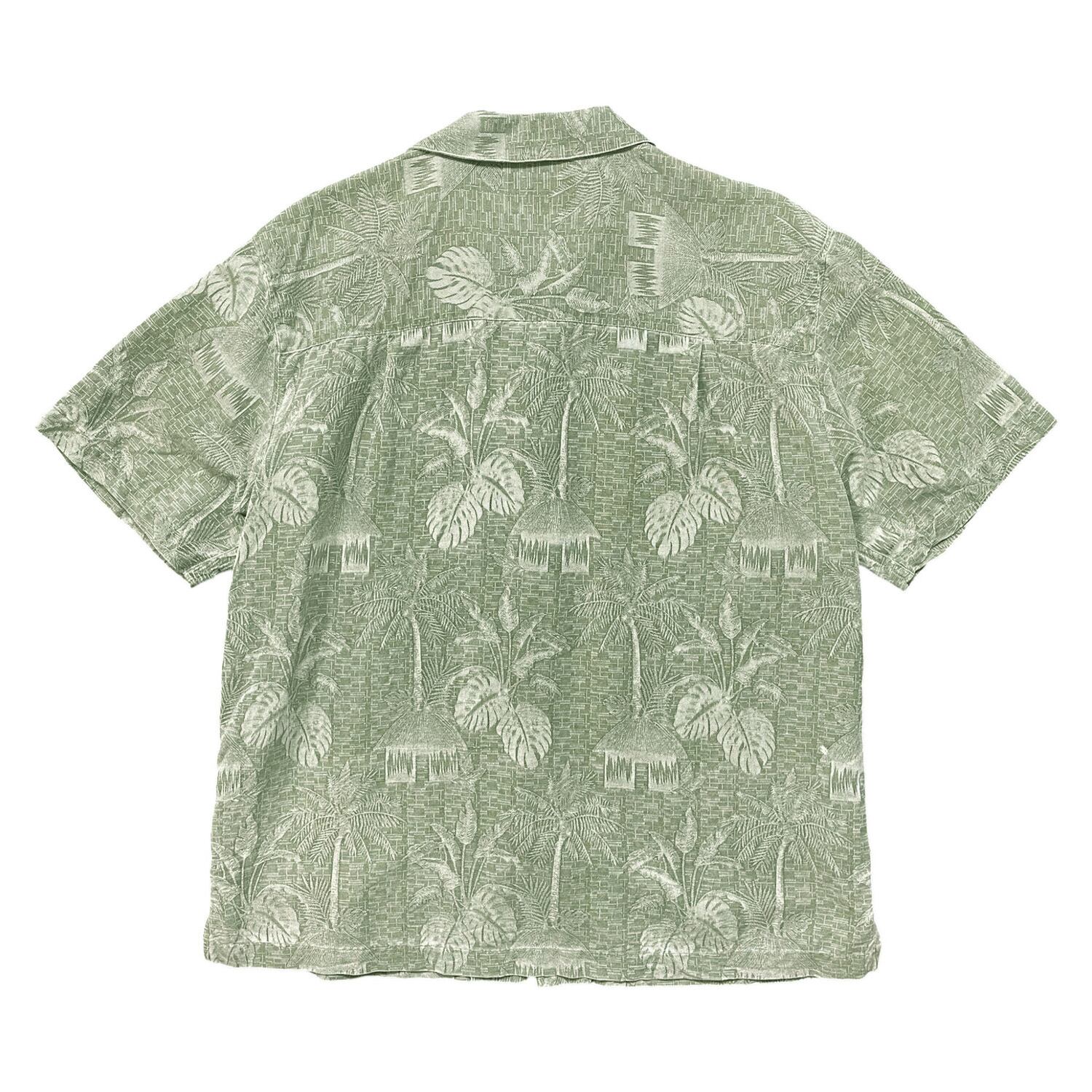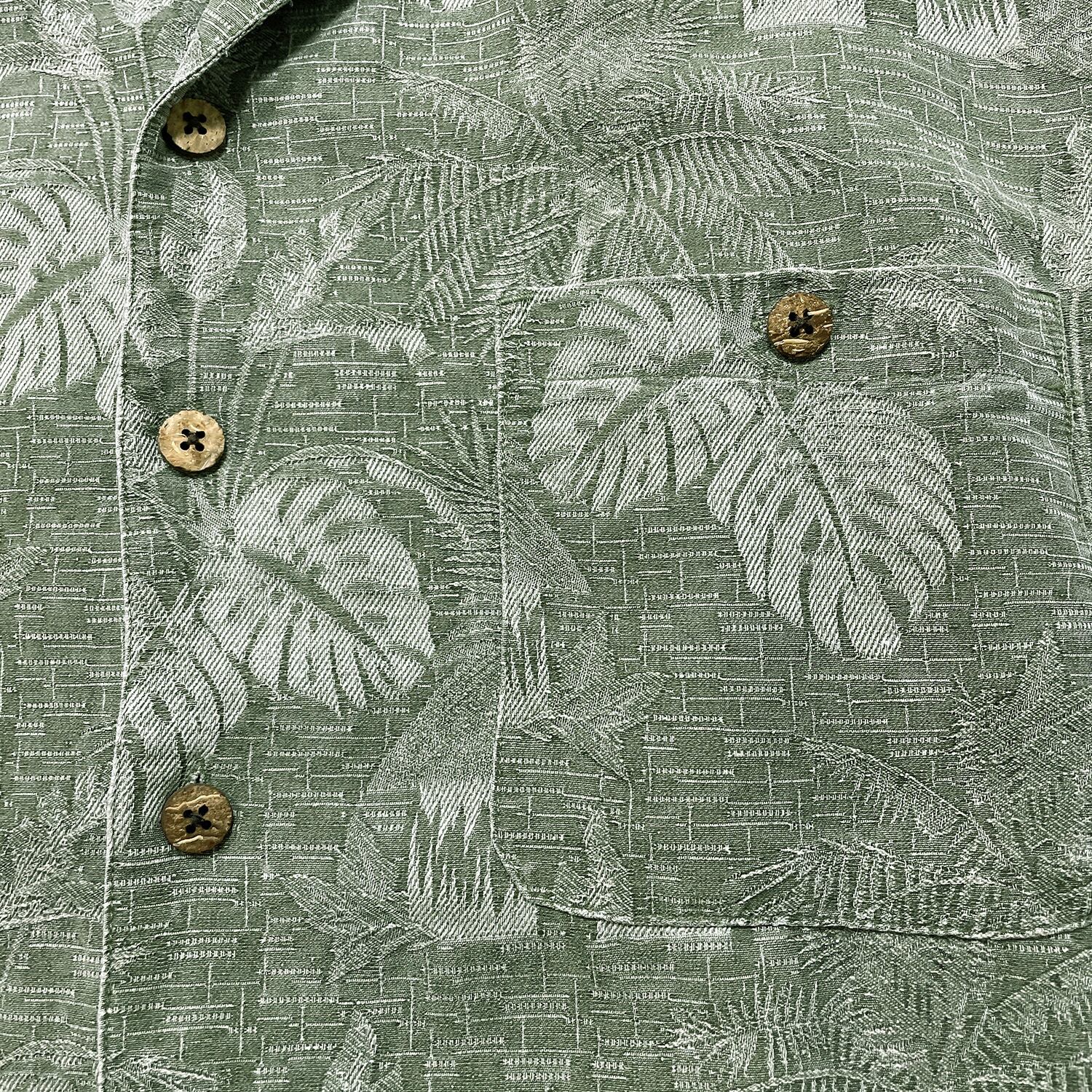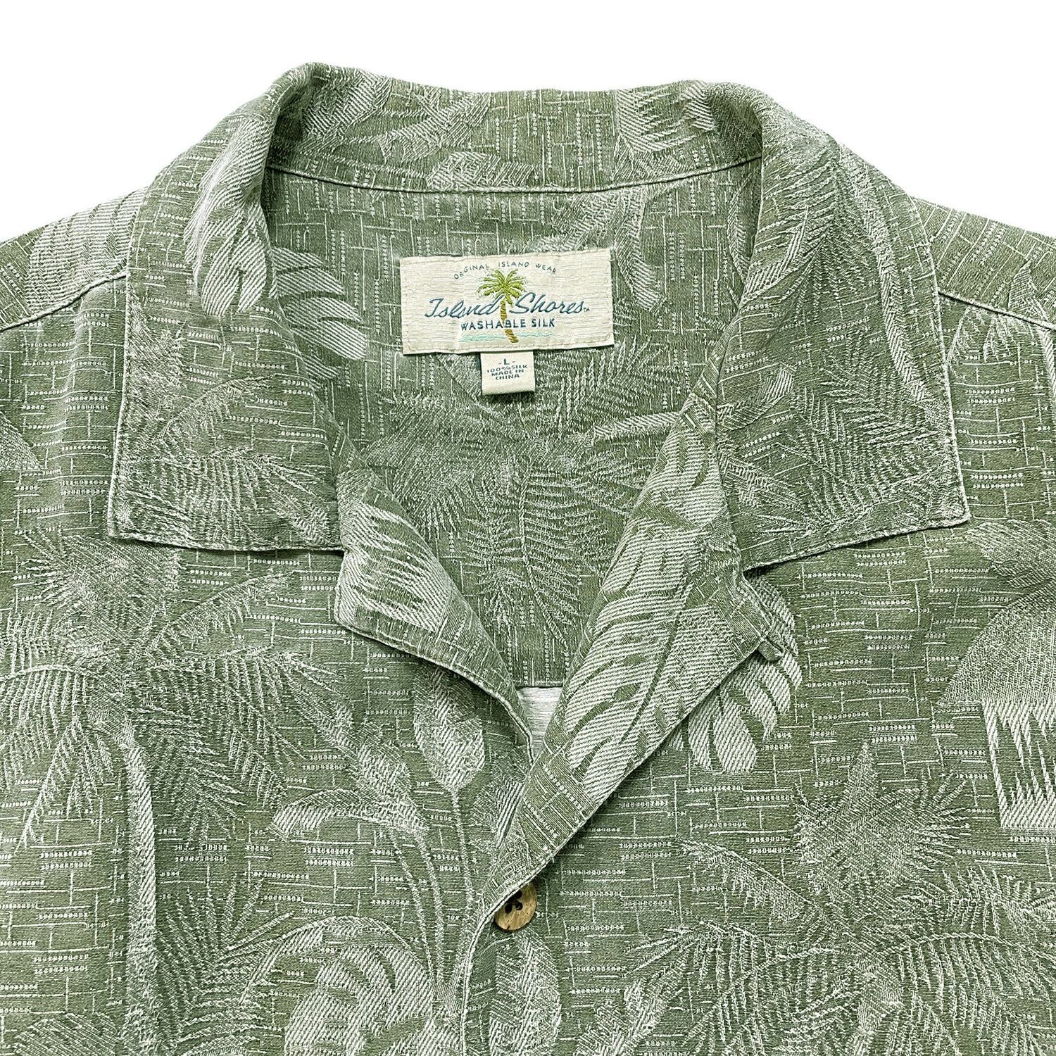 USA 古着 Island Shores アイランドショアーズ シルク 開襟 アロハシャツ ハワイアンシャツ パームツリー柄 メンズL グリーン BF3971