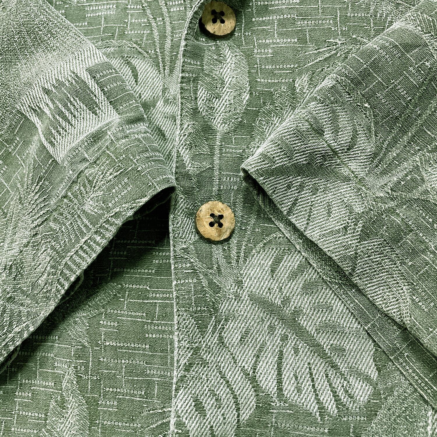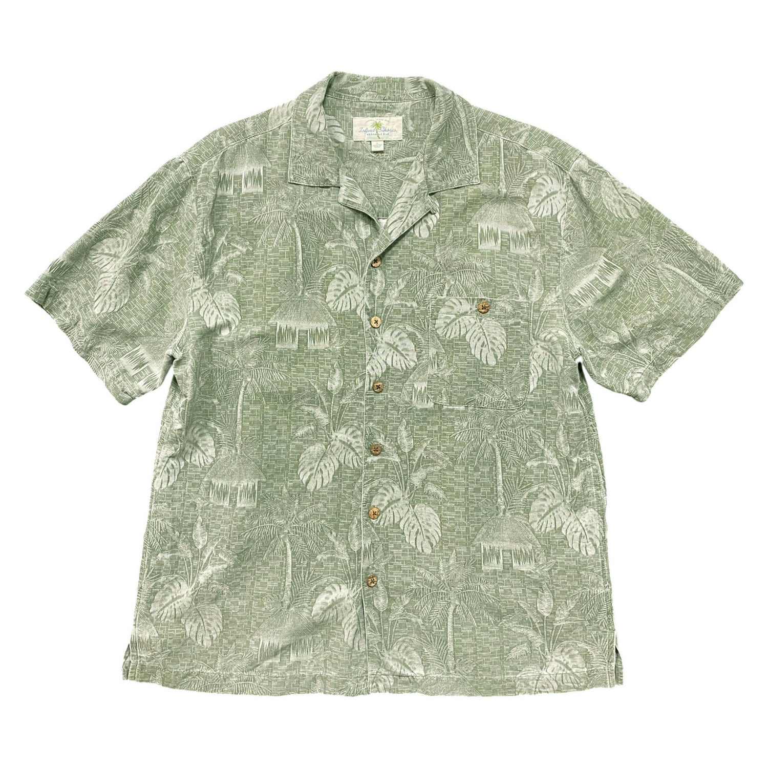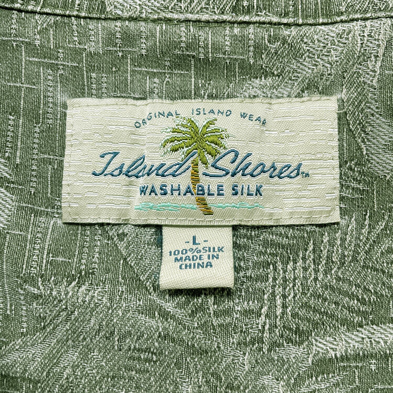 USA 古着 Island Shores アイランドショアーズ シルク 開襟 アロハシャツ ハワイアンシャツ パームツリー柄 メンズL グリーン BF3971