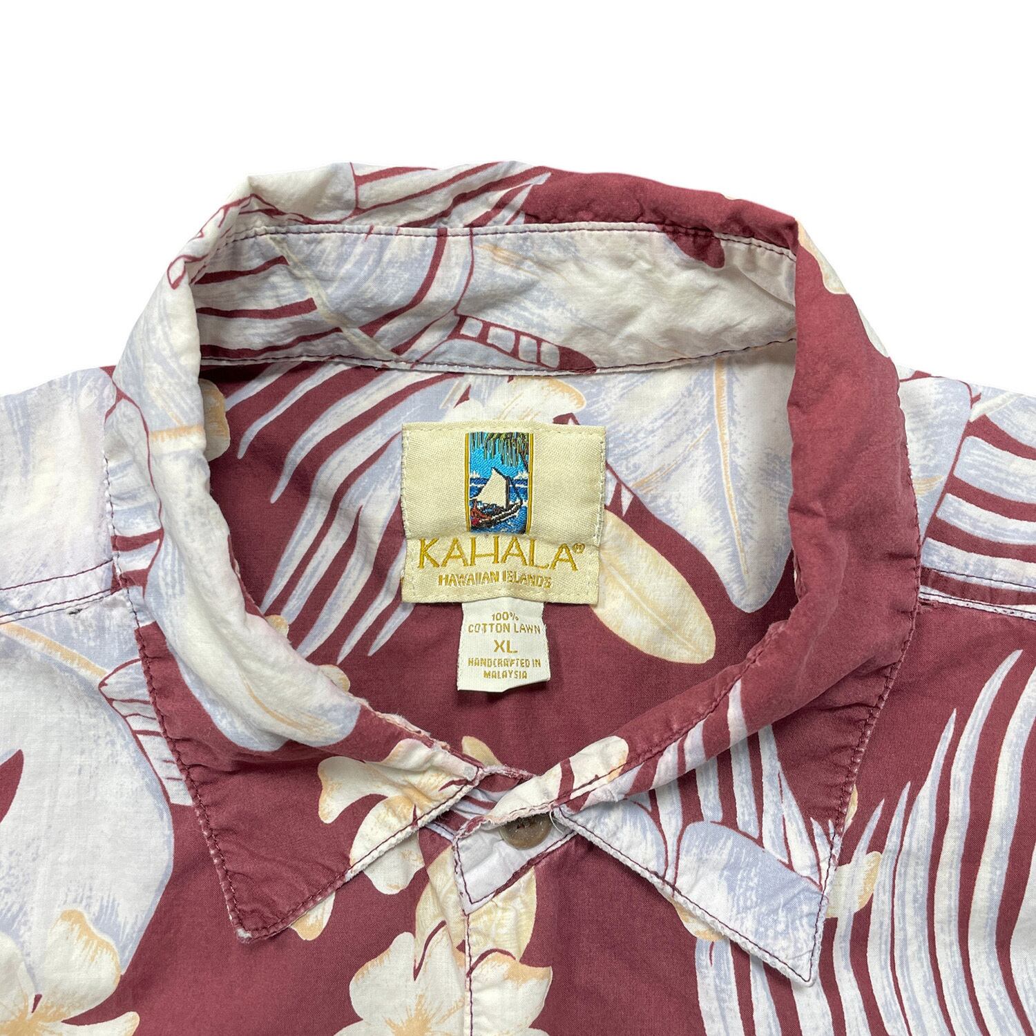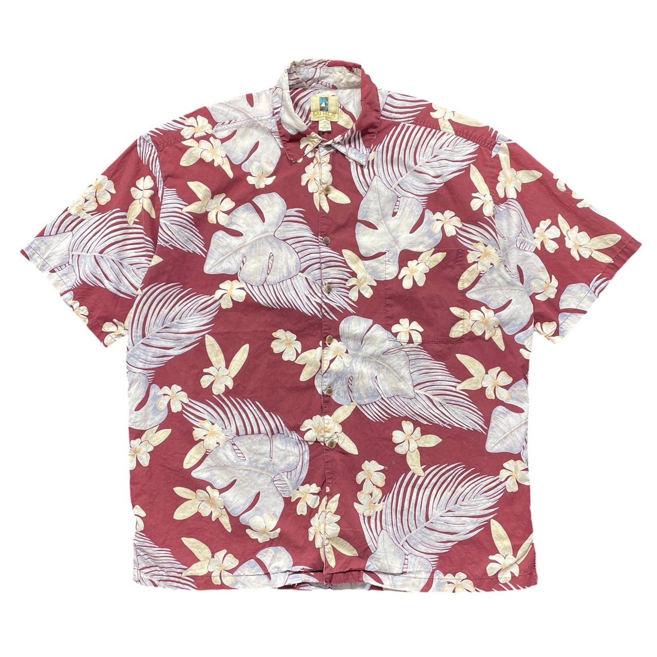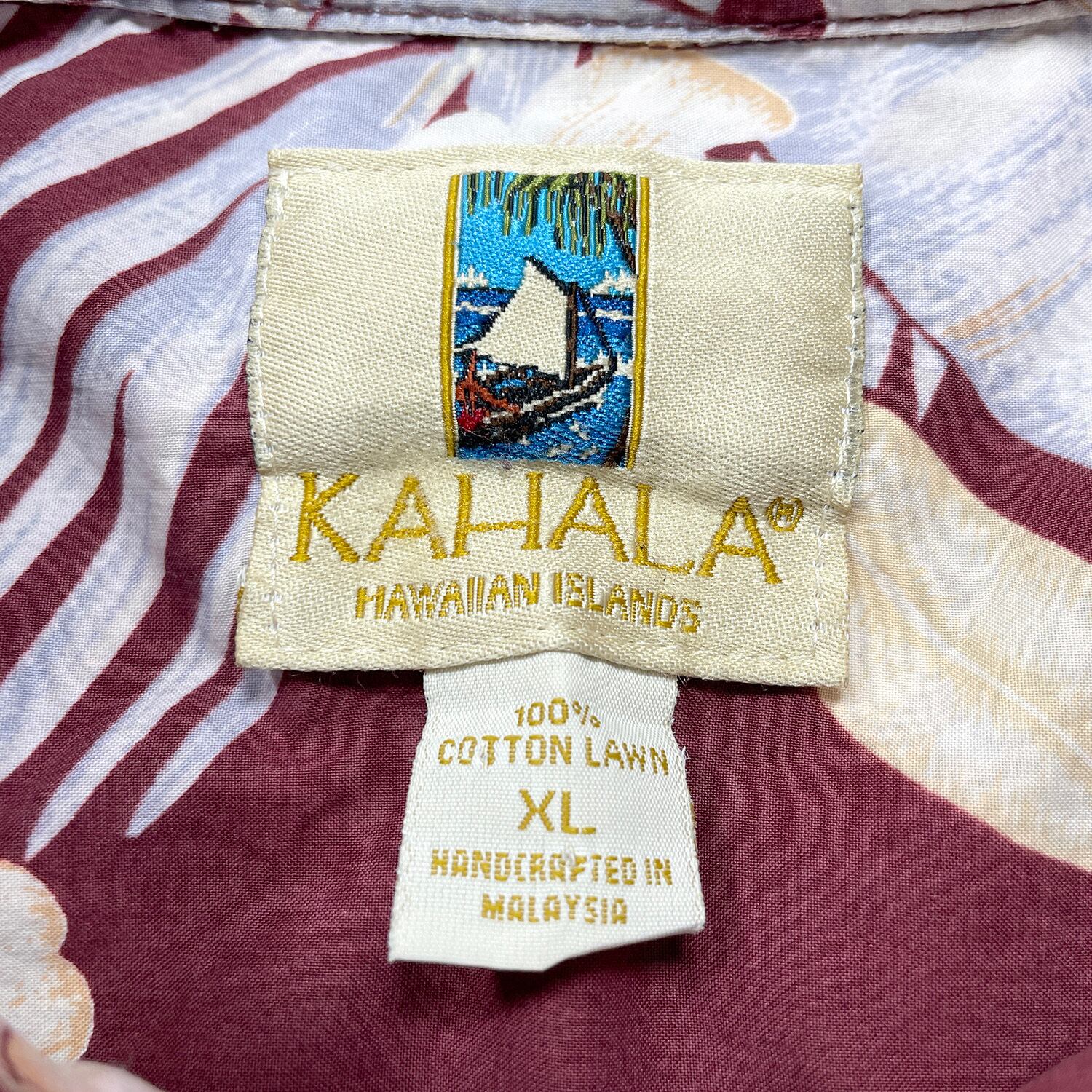 USA 古着 KAHALA カハラ コットン アロハシャツ ハワイアンシャツ モンステラ柄 プルメリア柄 メンズXL ボルドー BF3977
